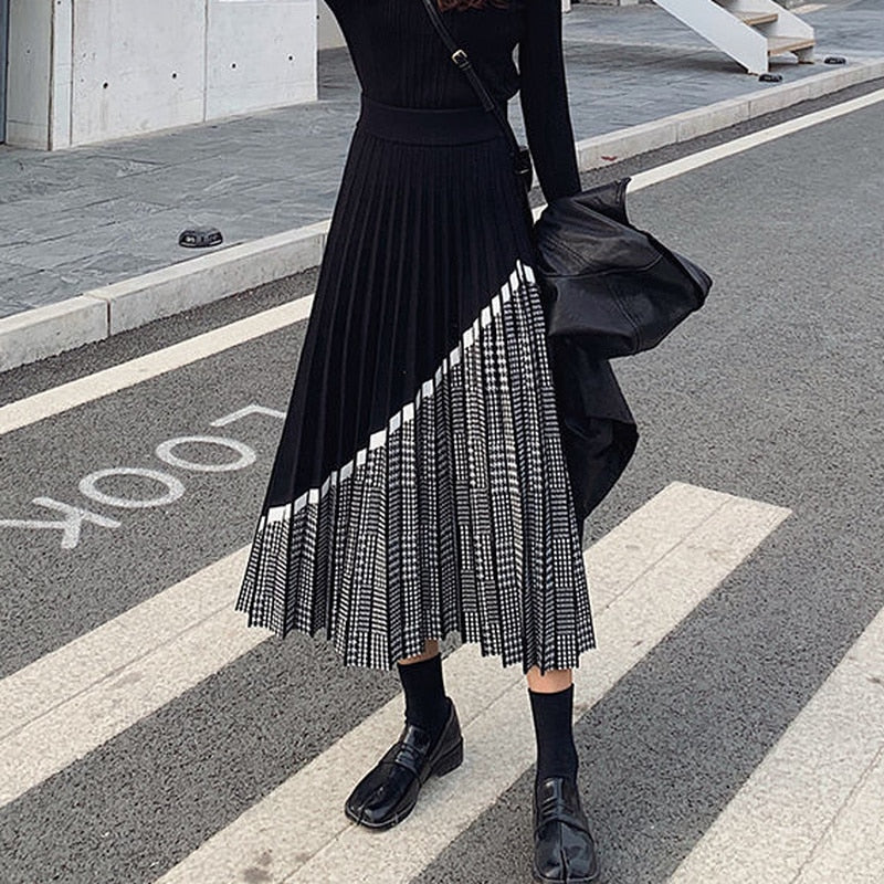 Yipinpay 2023 Autumn Winter Houndstooth Knitted Long Skirts Women Vintage Black High Waist Midi Pleated Skirt Elegant Casual