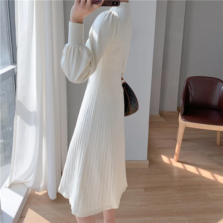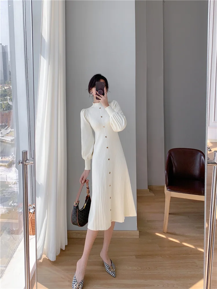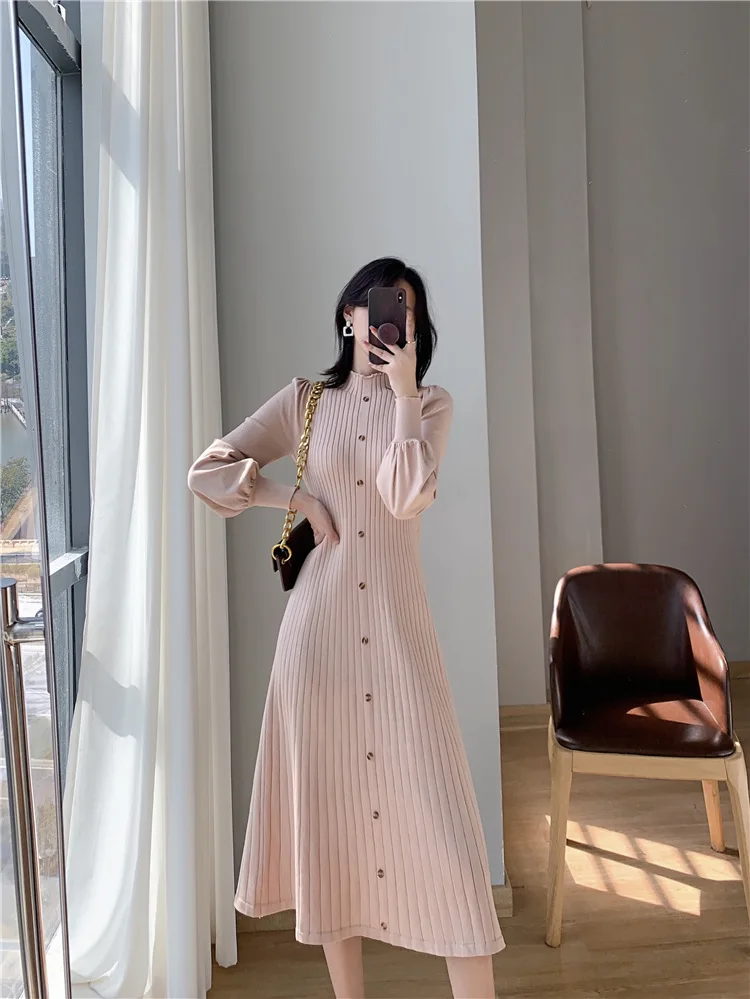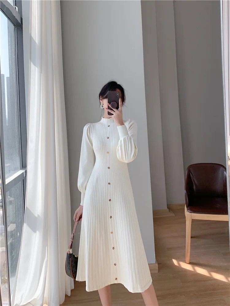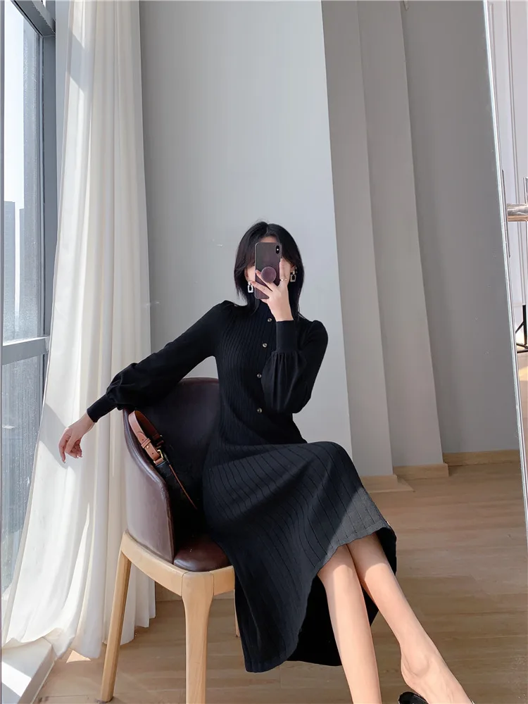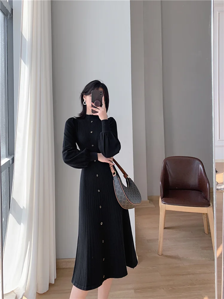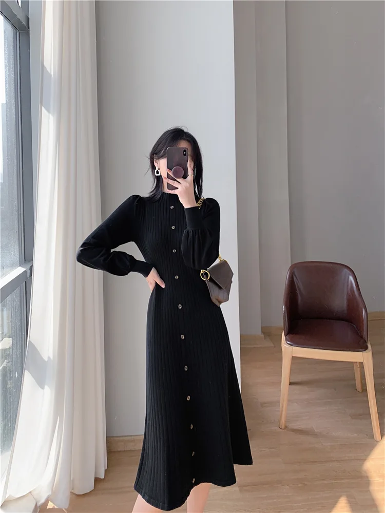yipinpay 2023 Korean Fashion Women's Sweater Dress Buttons Autumn Knitwear Long Midi Dresses Female Winter Black Chic Vestidos