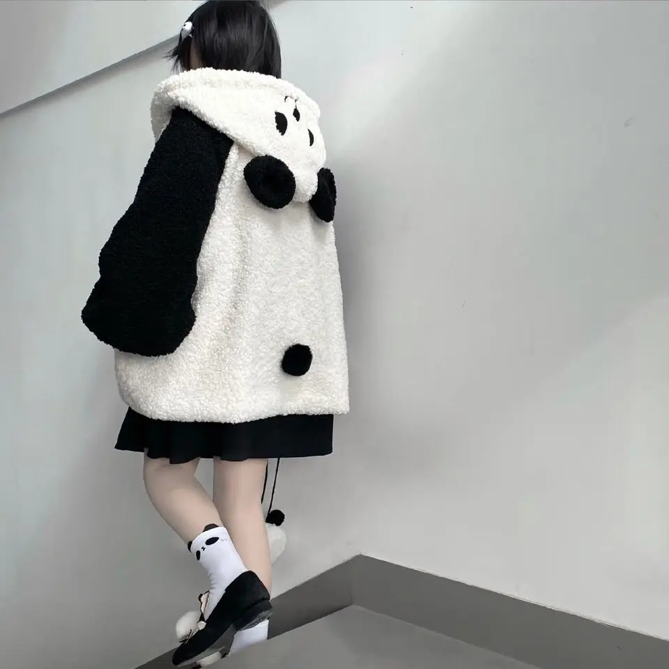 Yipinpay Autumn Winter Kawaii Hoodies Women Japanese Soft Girl Lambswool Cute Panda Ear Oversized Hoodie Preppy Style Button Coat