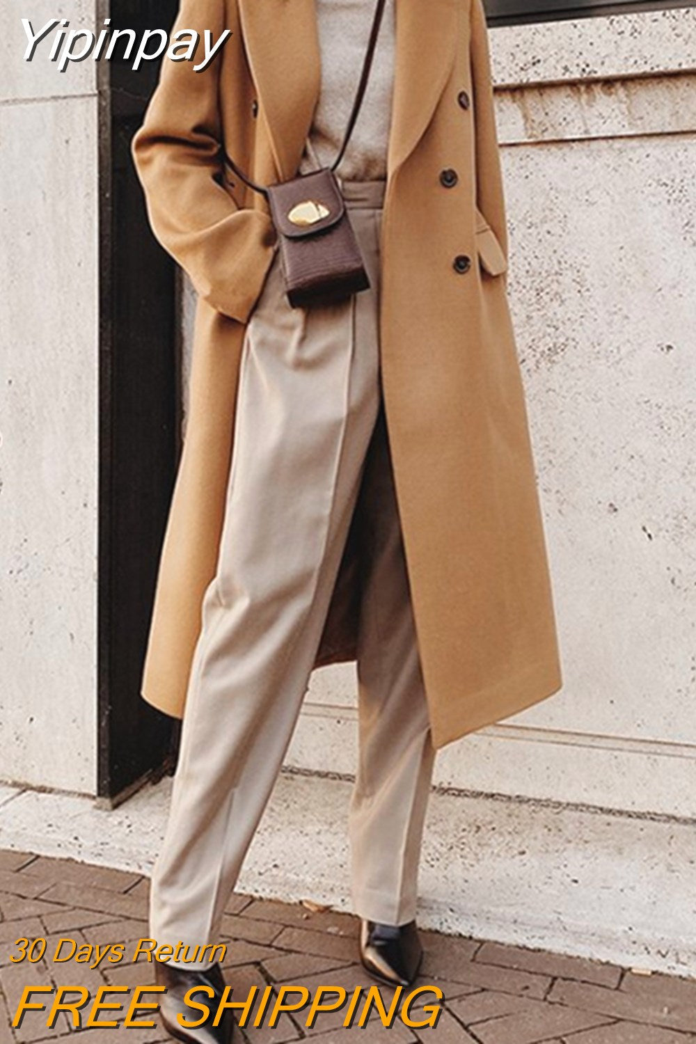 Yipinpay Blends Winter Coat For Women Lapel Double-Breasted Office Lady Long Jackets Windbreaker 2023 Casual Female Coats White
