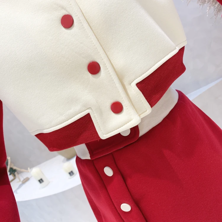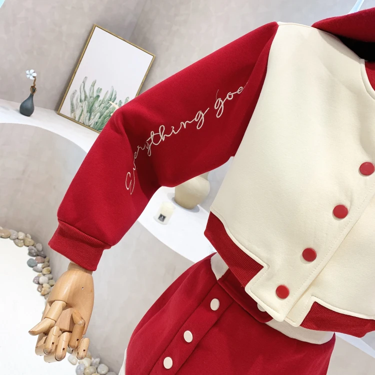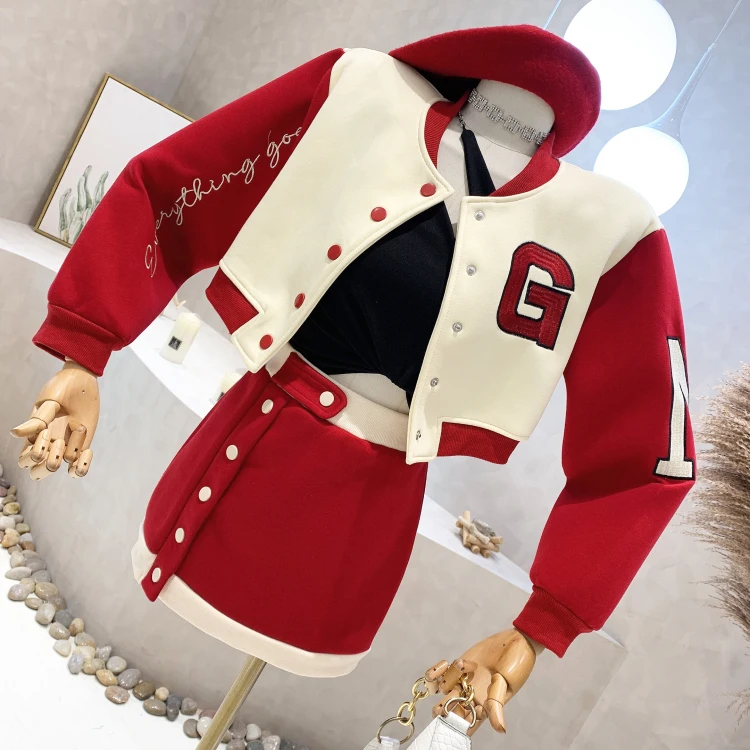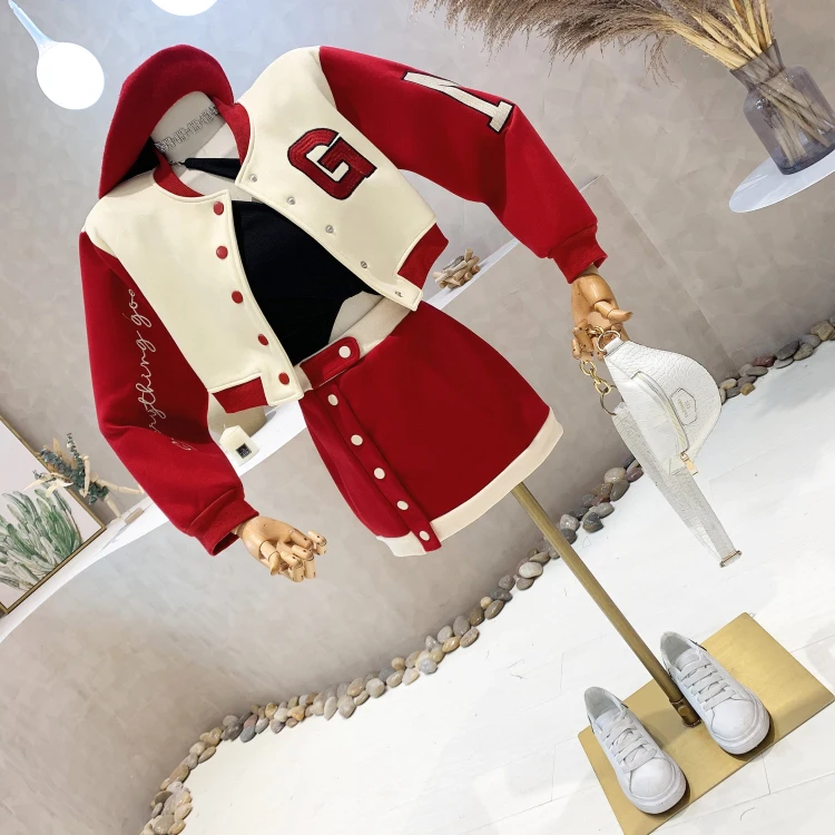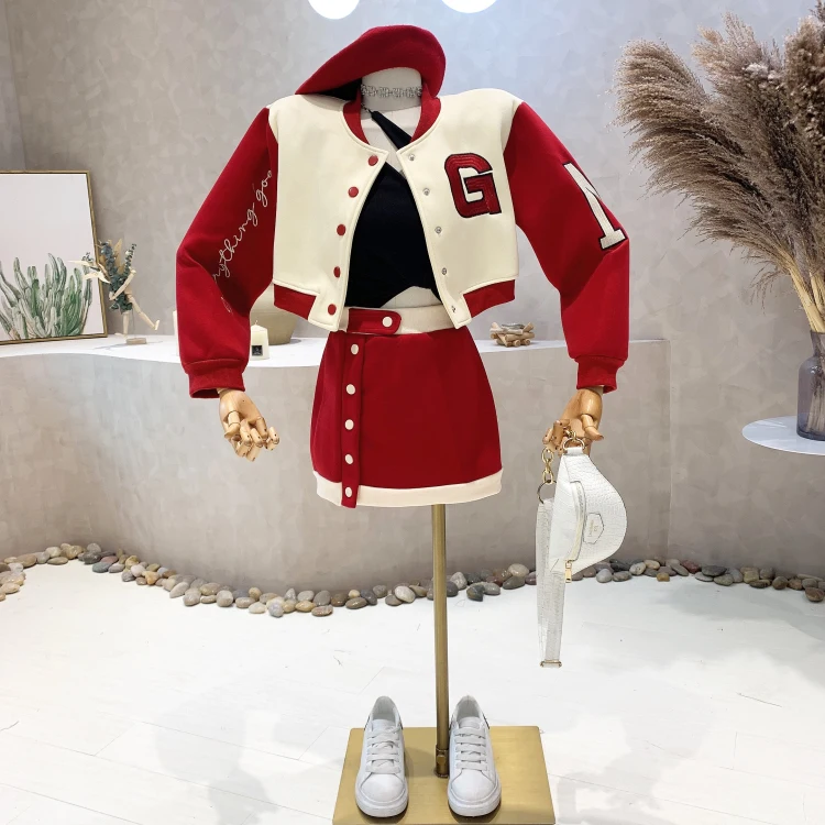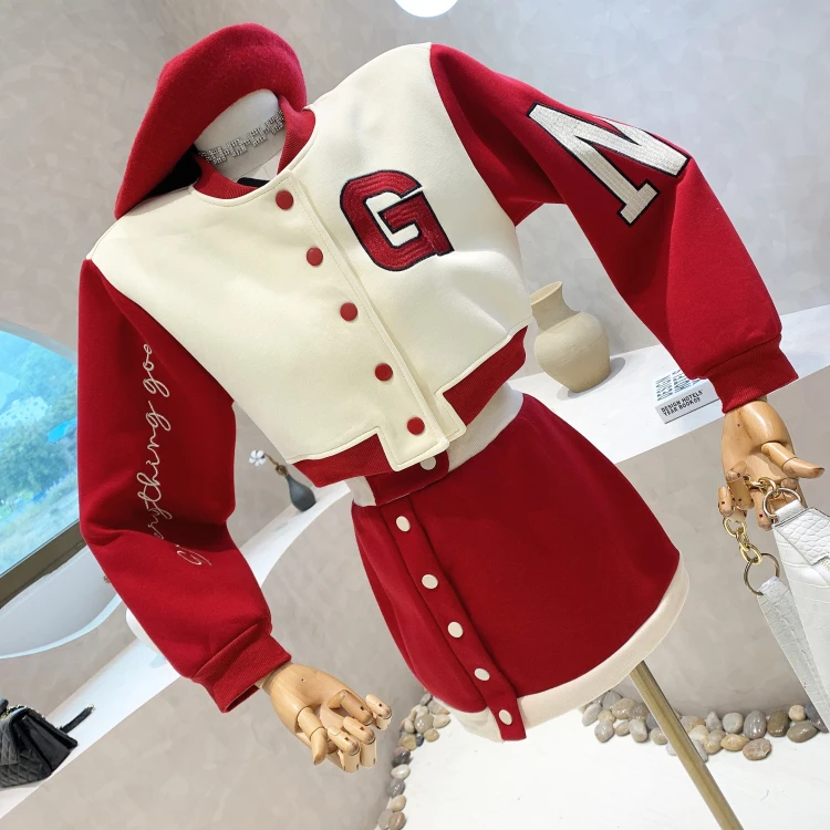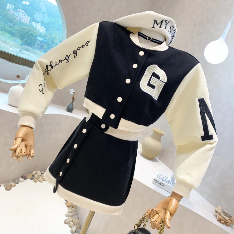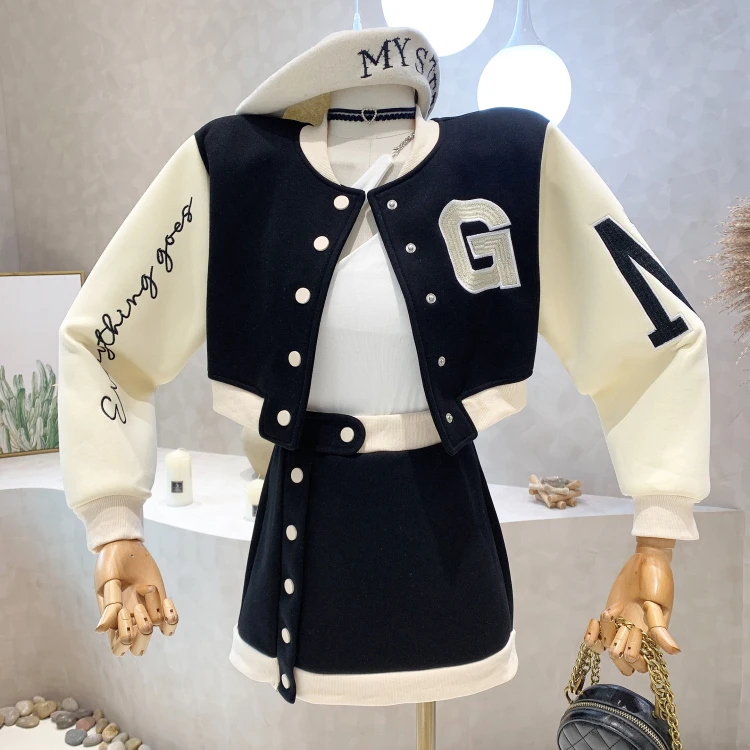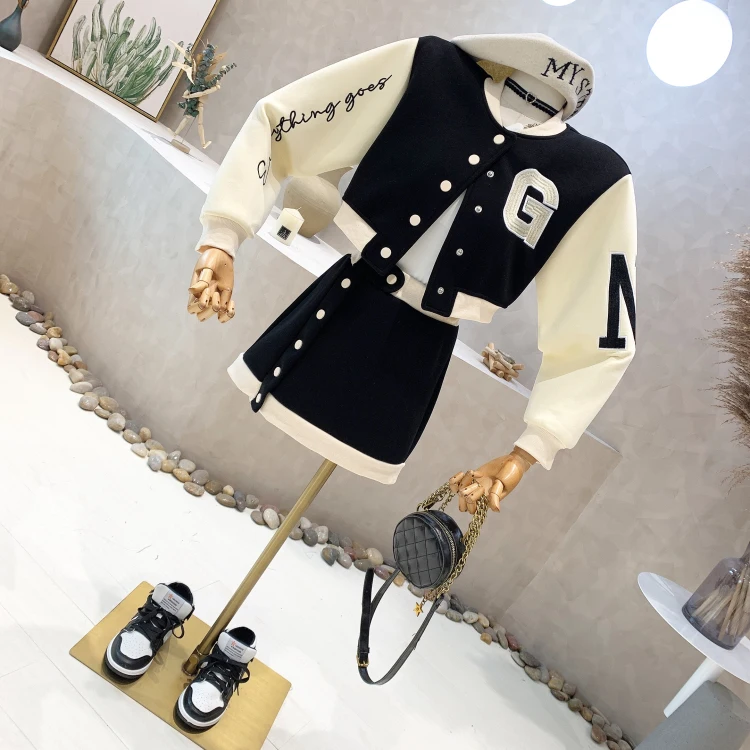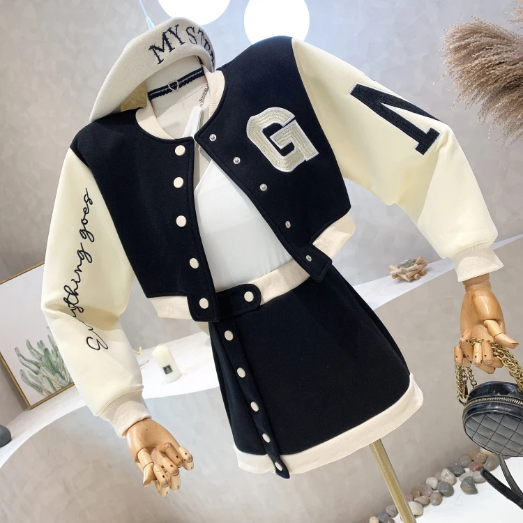 Yipinpay Embroidered Letter Coat Short Bomber Jackets Patchwork Contrast Mini Black Skirt Sets Autumn 2023 Casual 2piece Tracksuits