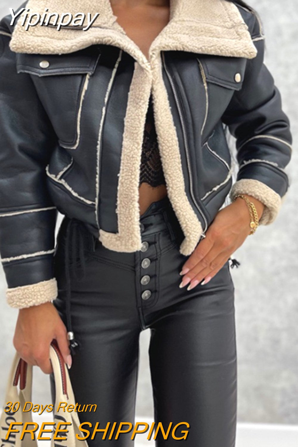 Yipinpay Fleece Patchwork Suede Winter Warm Jackets Women Casual Long Sleeve Lapel Neck Zipper Outerwear Street Party Coats