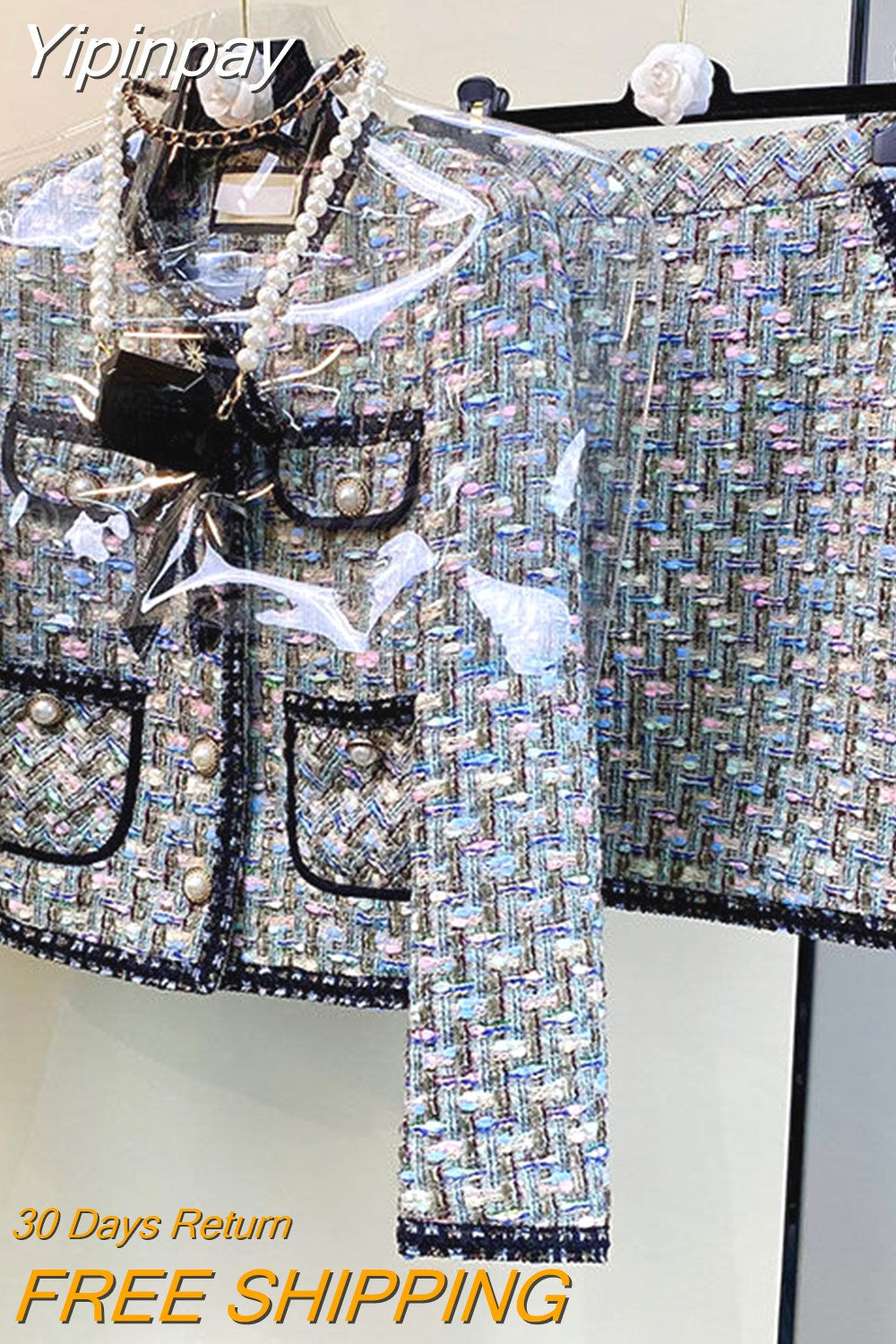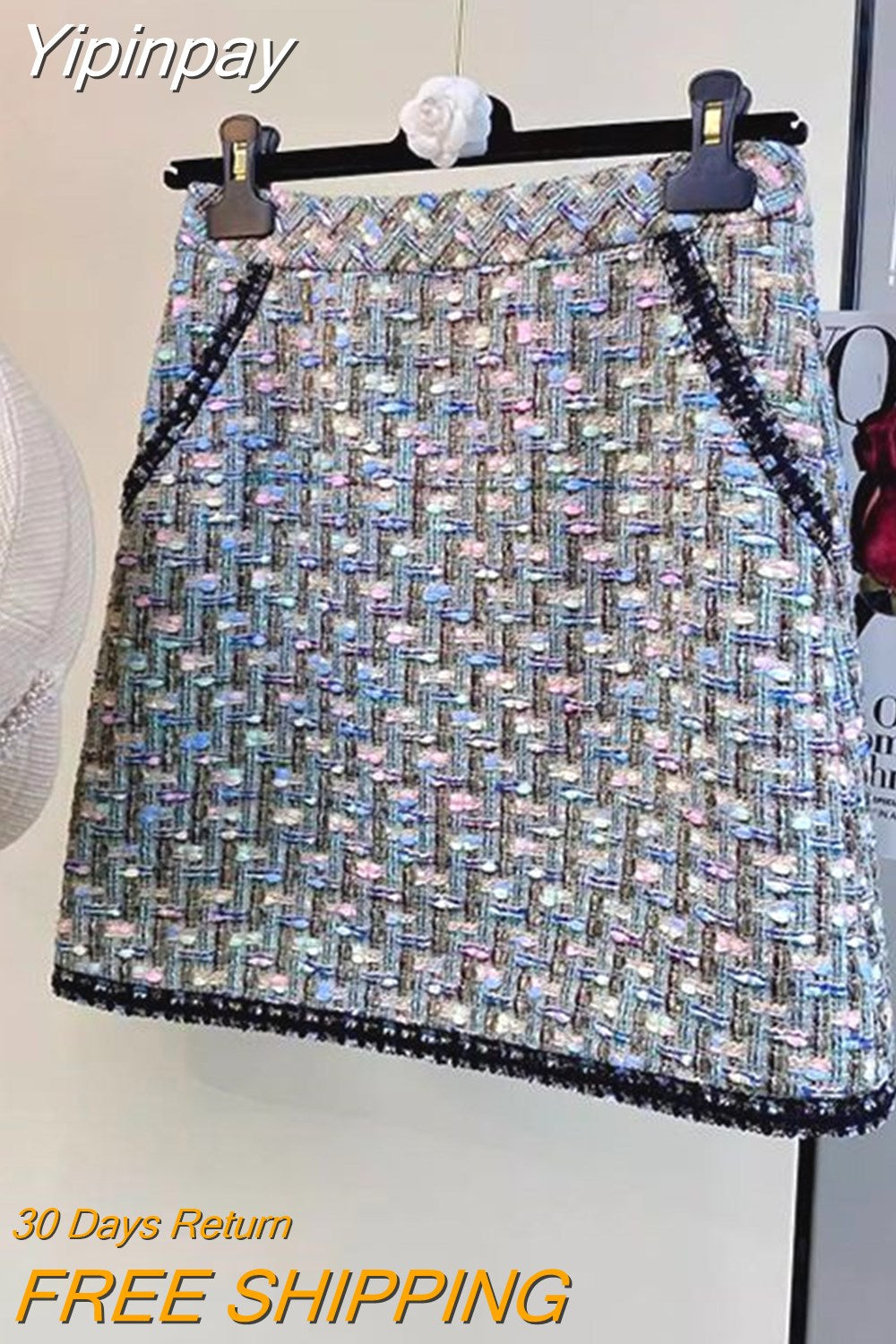 Yipinpay Fragrance Sets Temperament Retro Skirt 2023 Autumn Winter Tweed Coat Fashion Woolen Jacket Top Slim Skirts Suit for Women