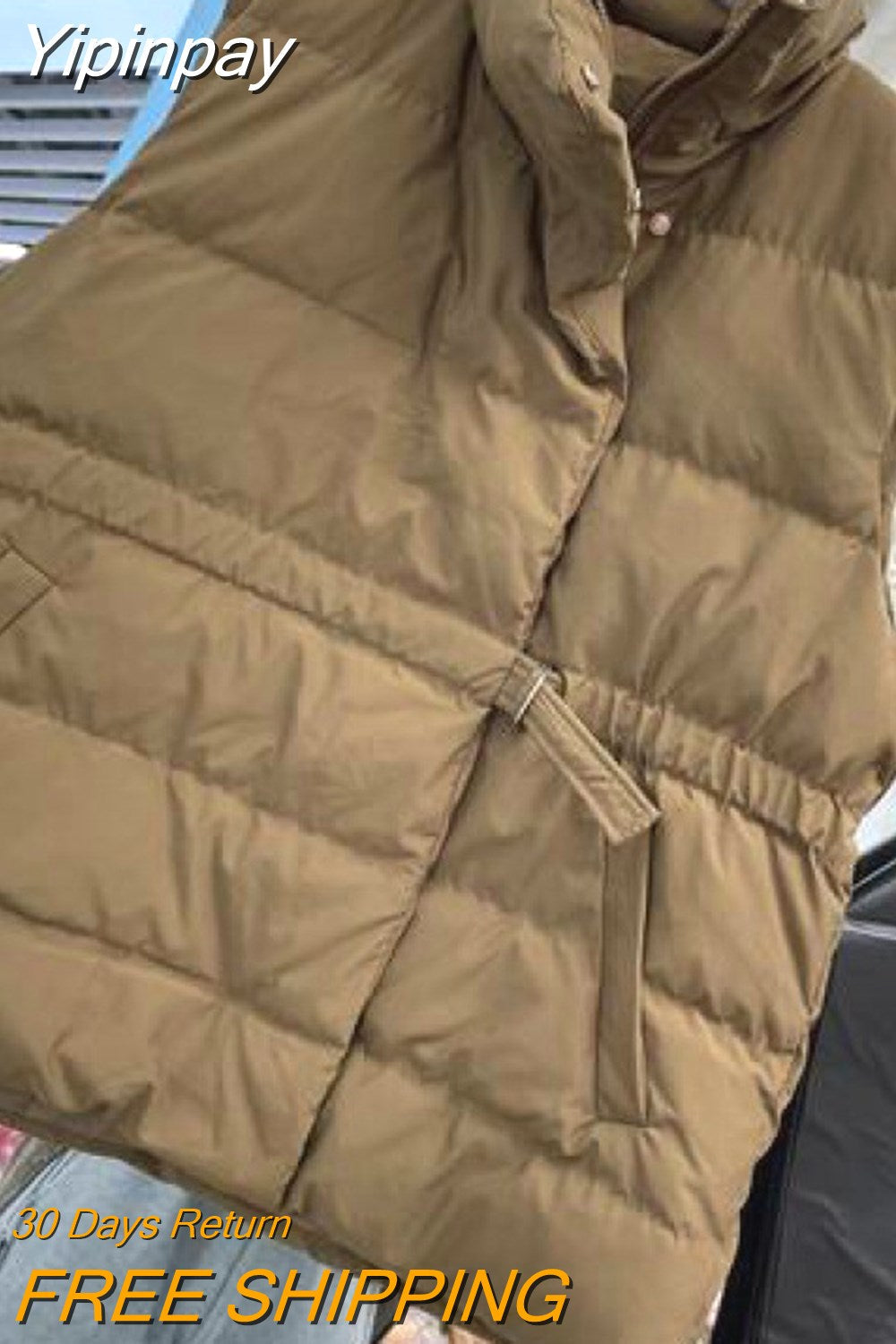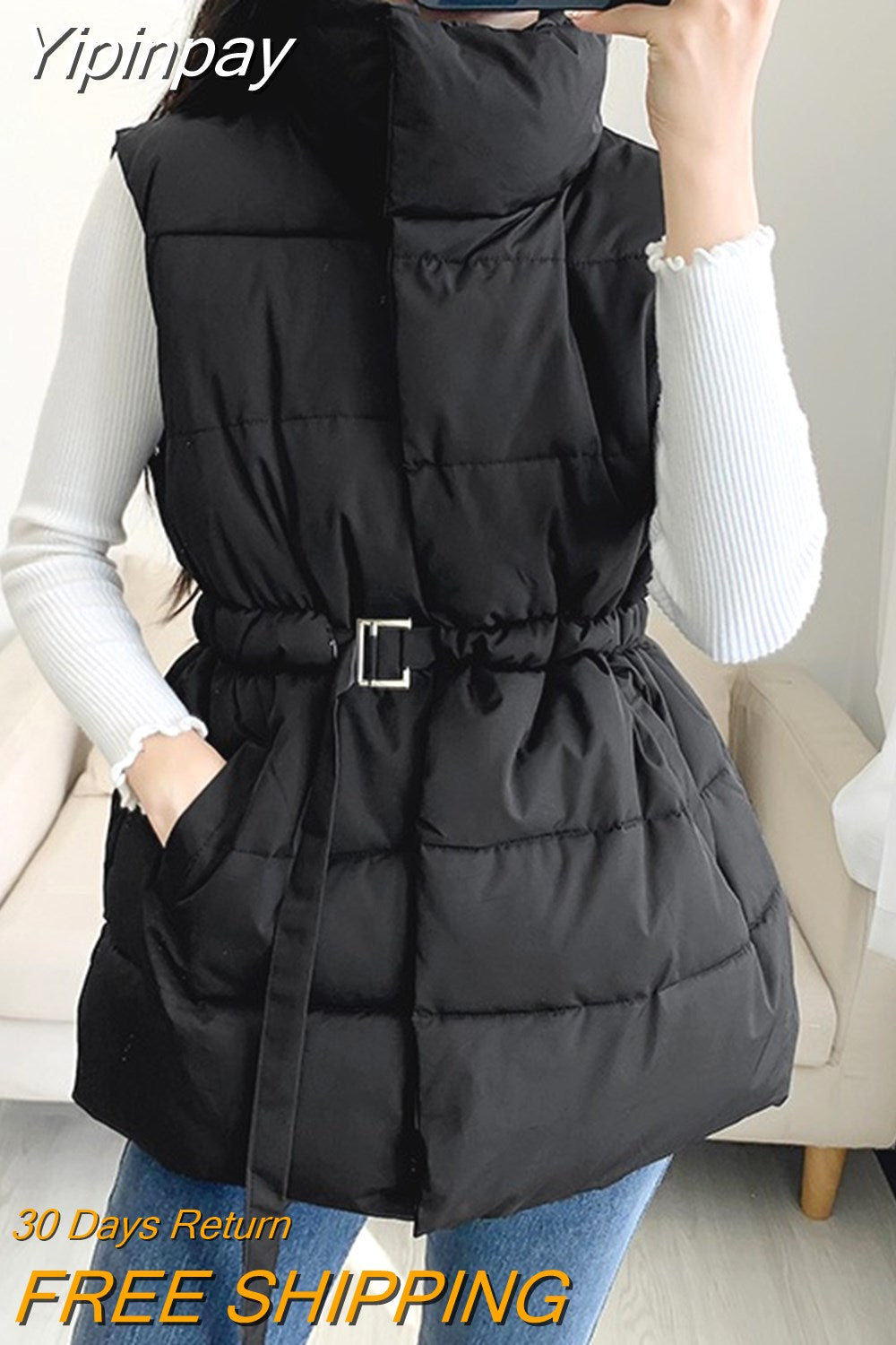 Yipinpay Jacket women 2023 Casual Stand Collar Loose Belt Sleeveless Vest Black Single Breasted Long Parka Overcoat Outerwear