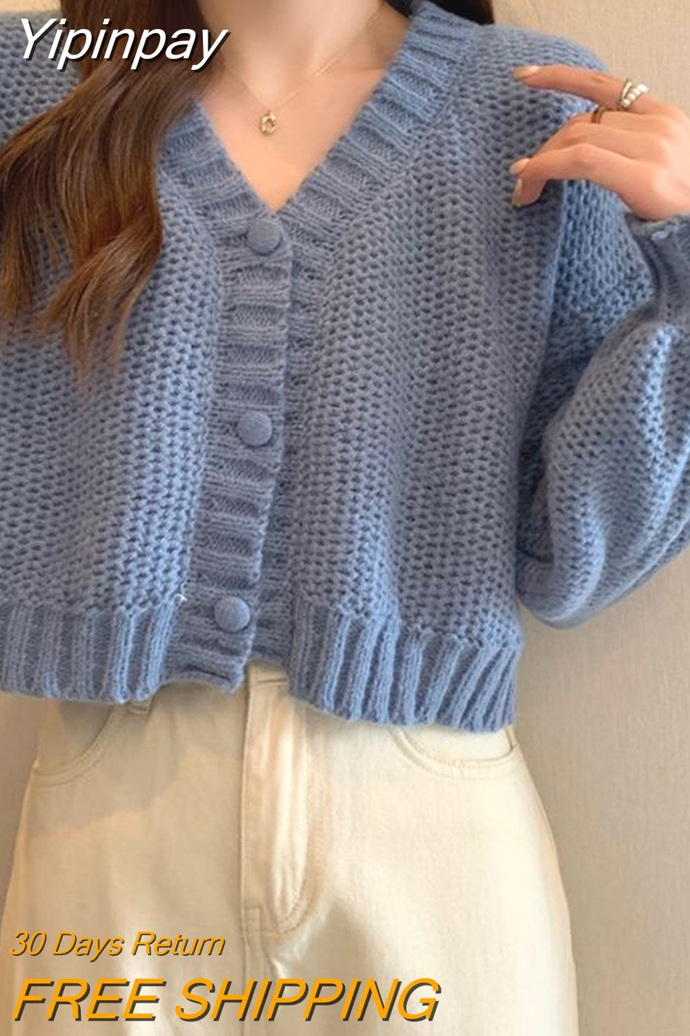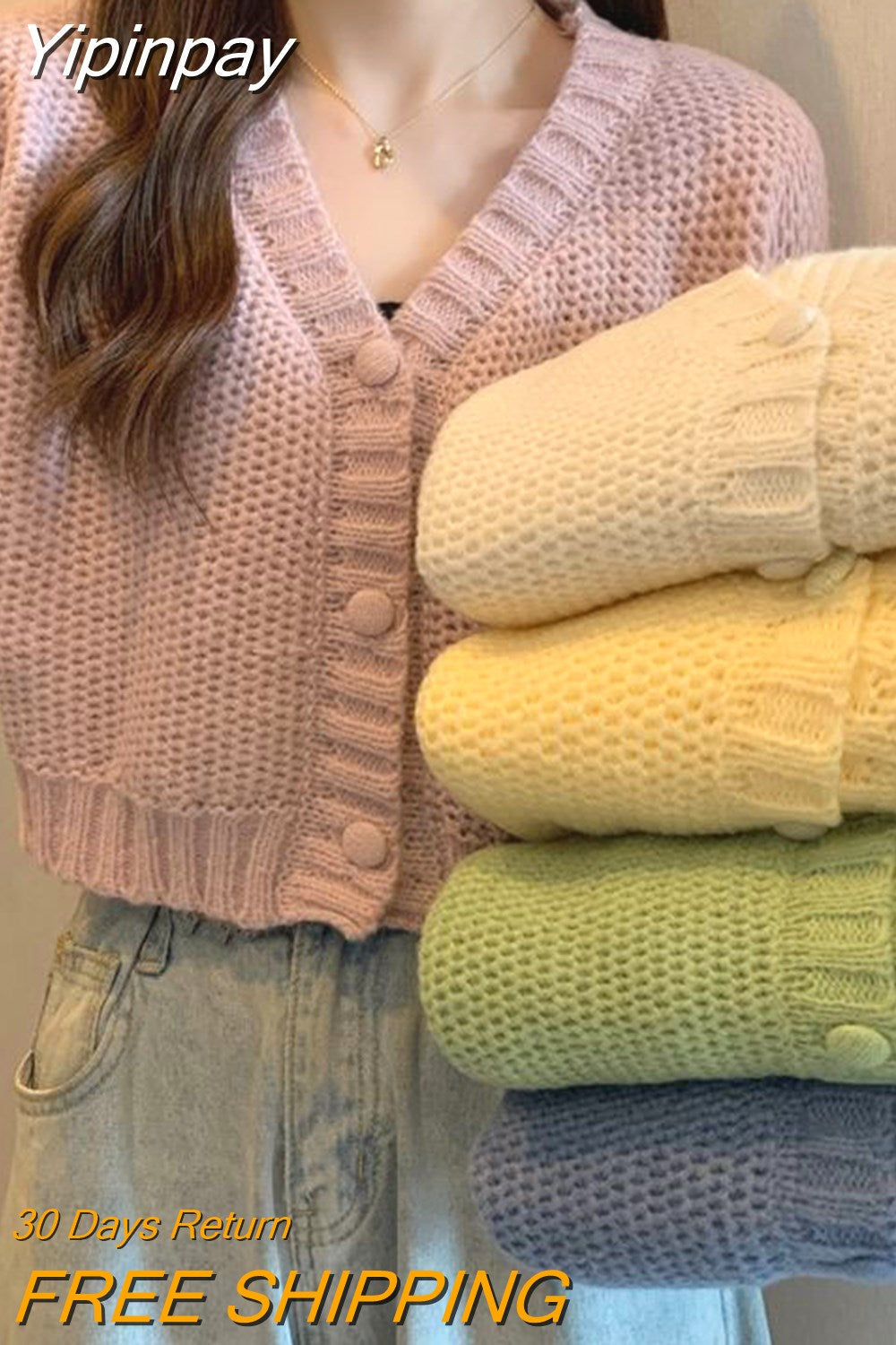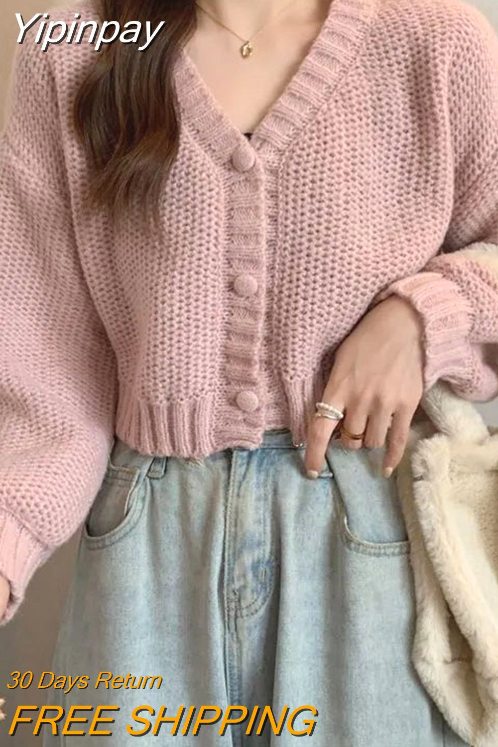 Yipinpay Knitted Short Jacket Women Sweaters Cardigan Solid V Neck Lantern Sleeve Button Fashion Soft Autum Cropped Coatn
