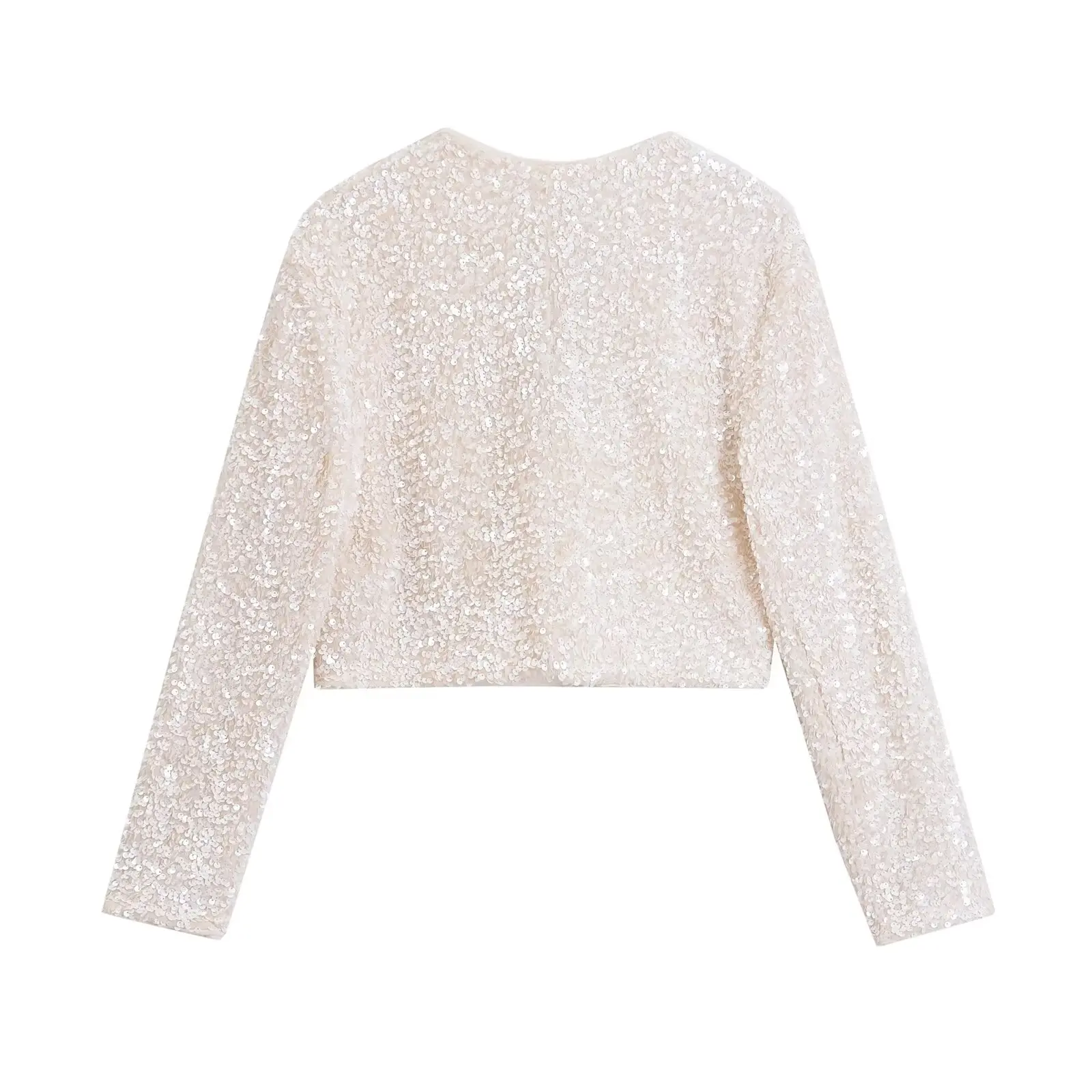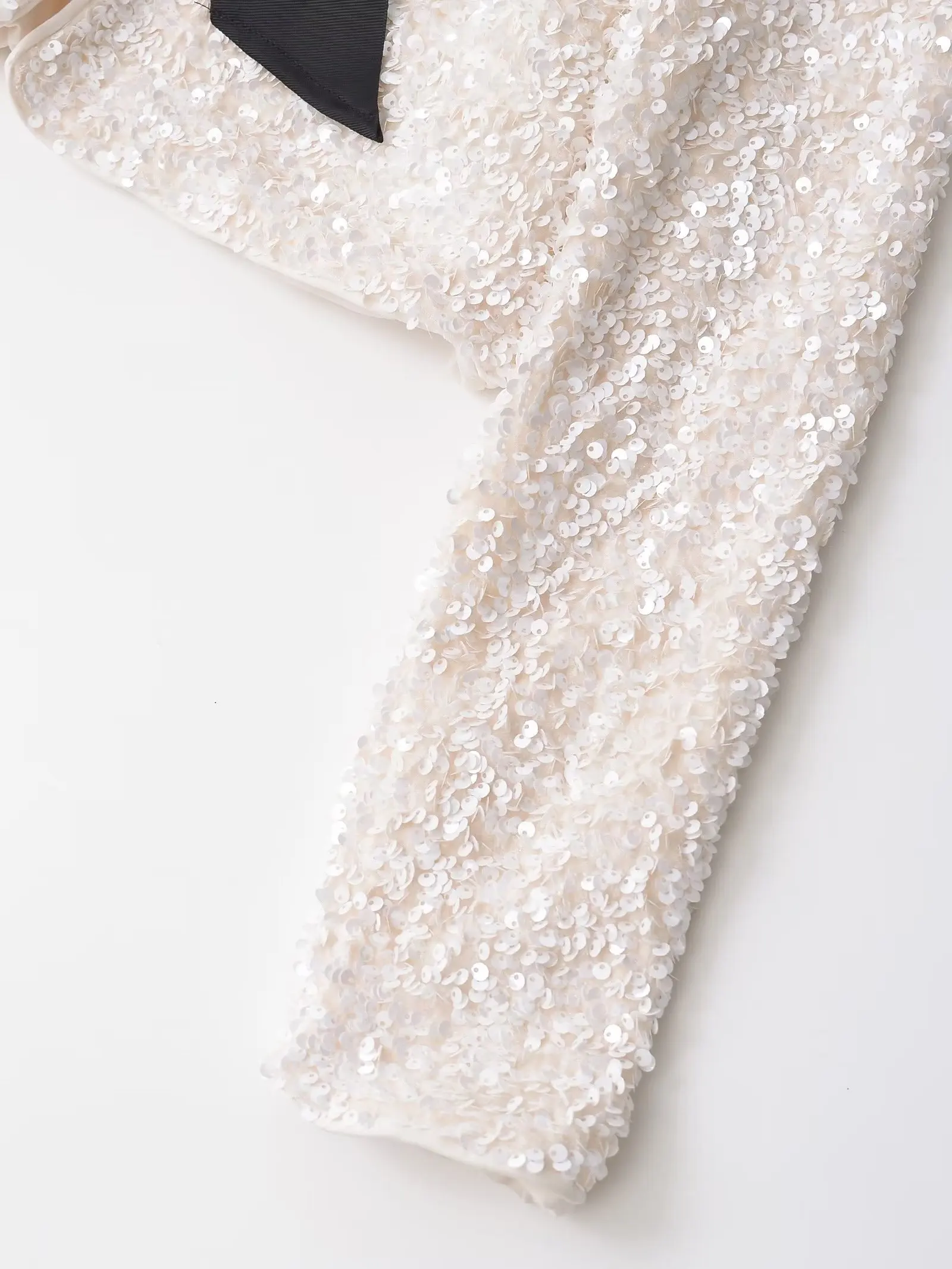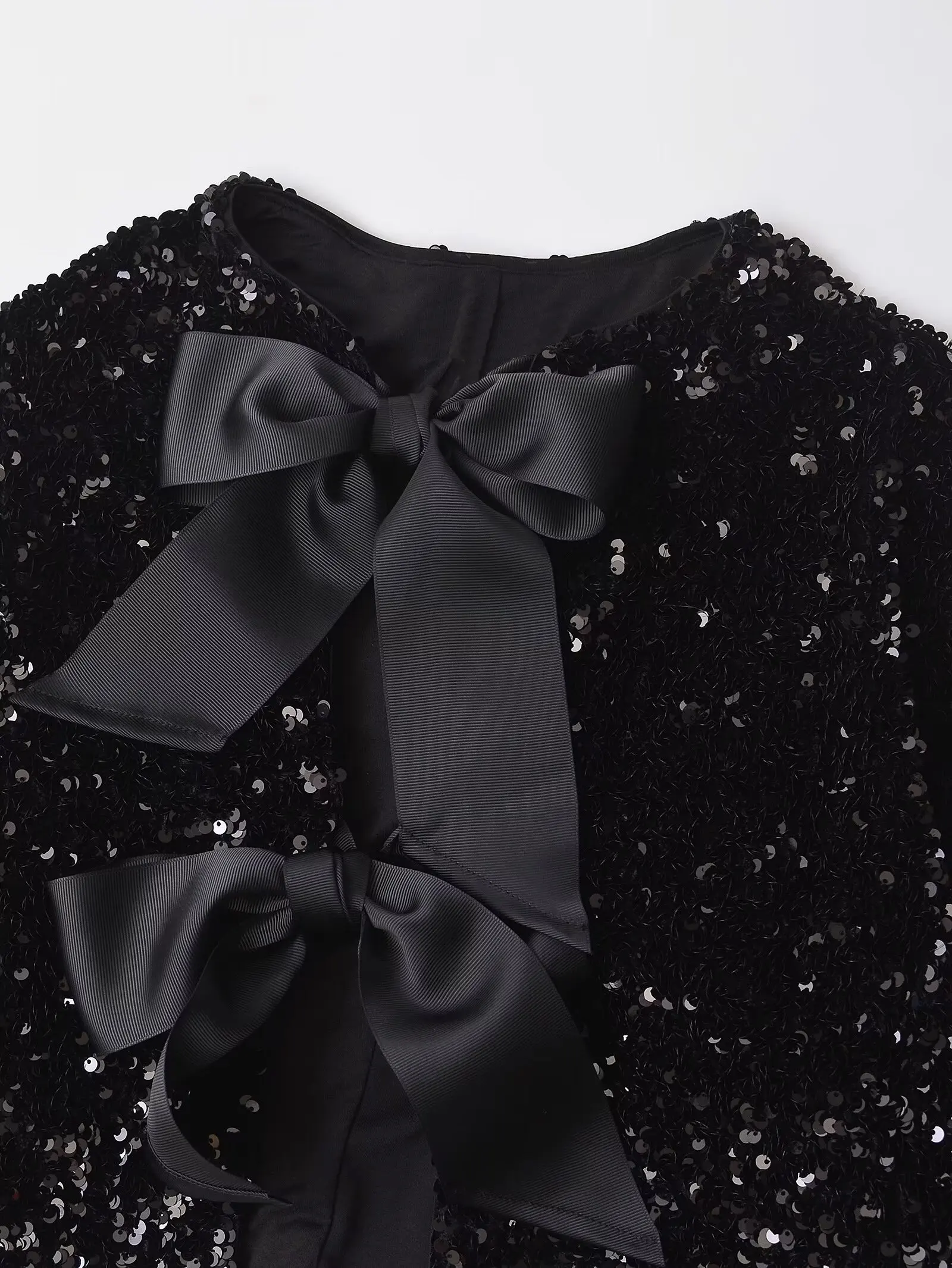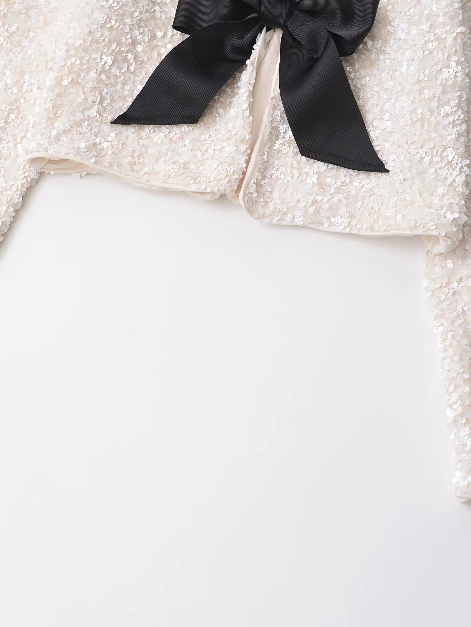 Yipinpay New Women Contrast Color Bow Sequin Jacket Long Sleeve O Neck Female Party Elegant Crop Coat