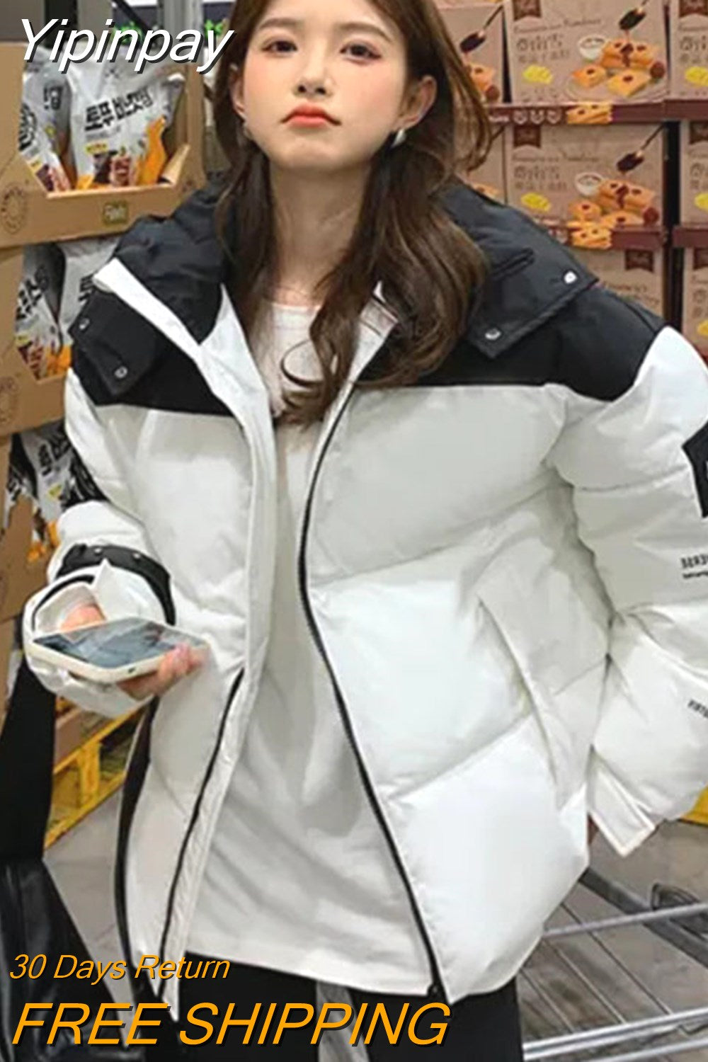 Yipinpay Patchwork Hooded Down Cotton Coat Women Fashion Big Pocket Zipper Long Sleeve Outwear Parka Thick Warm Harajuku Jacket