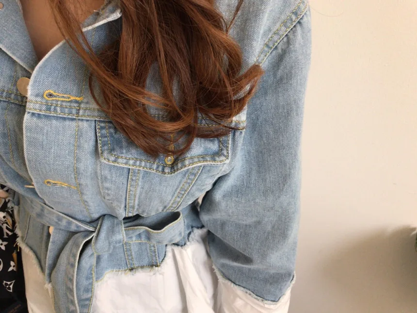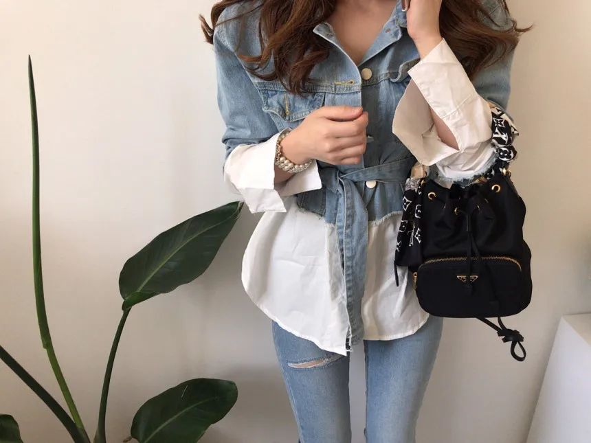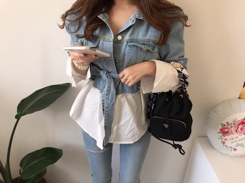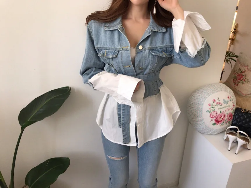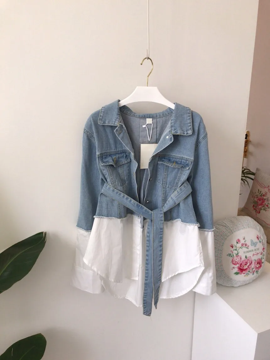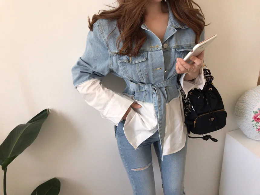 Yipinpay Stitching Fake Two Piece Lapel Long Sleeve Single Breasted Slim Waist Lace Up Vintage Denim Coat Women Jacket Sashes