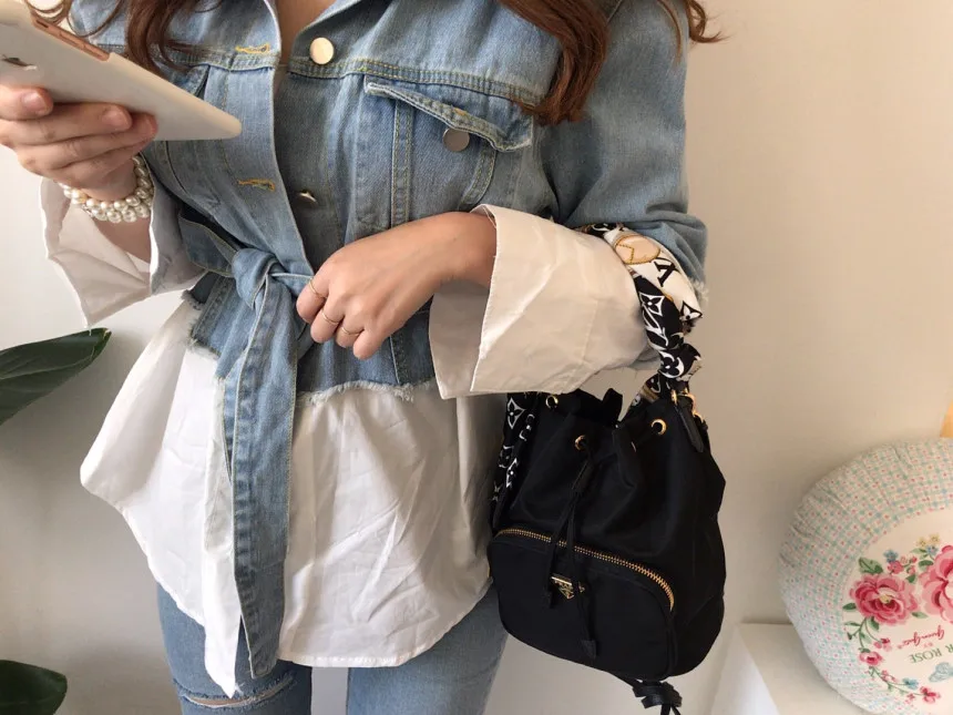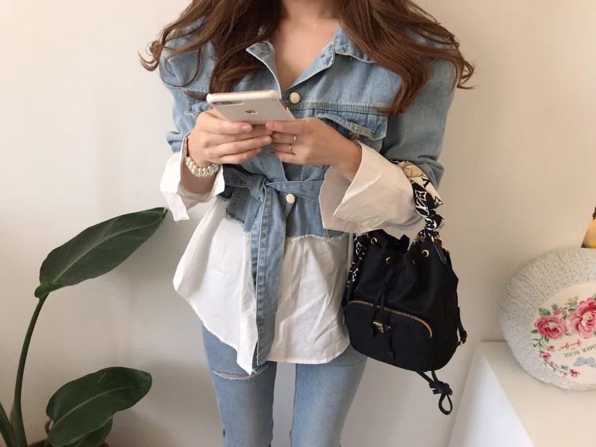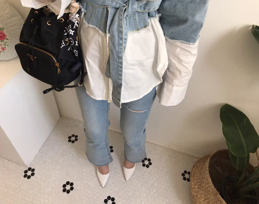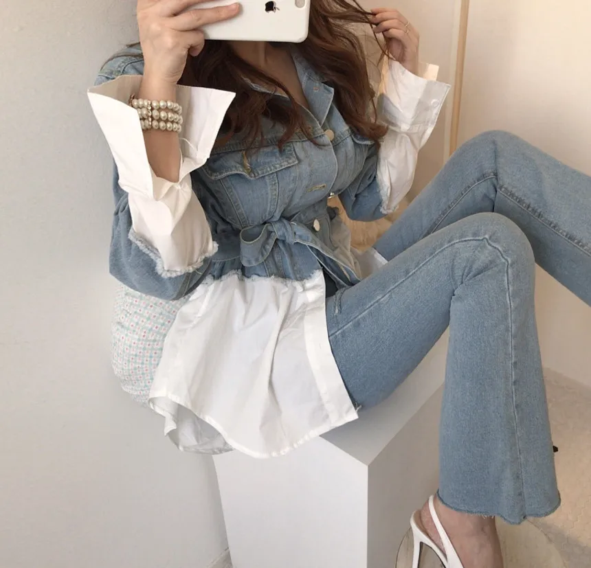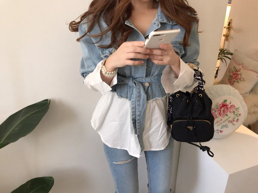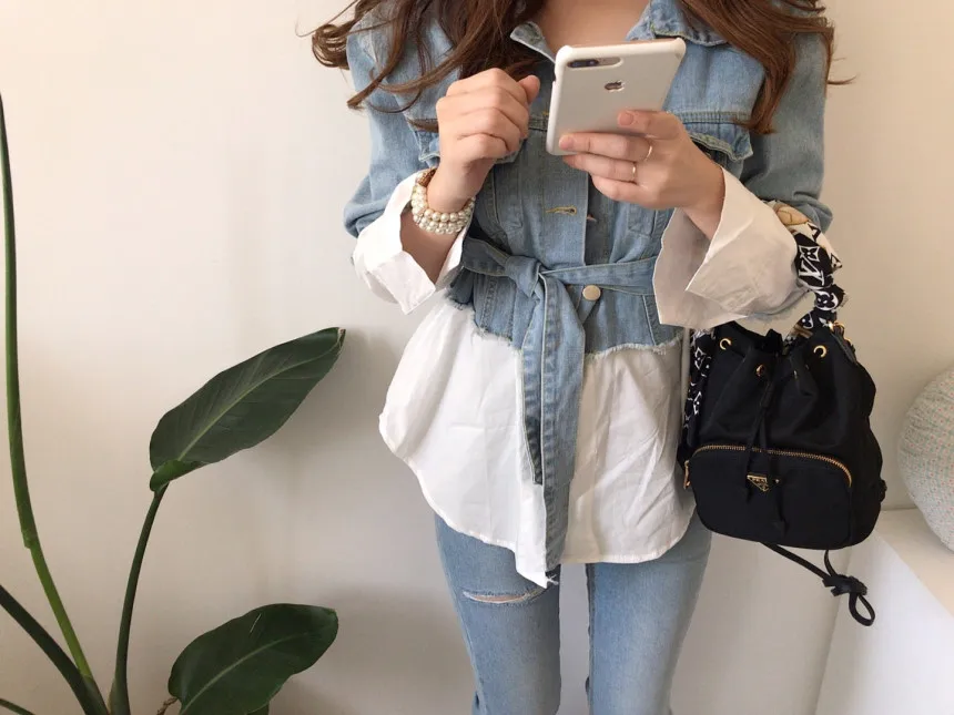 Yipinpay Stitching Fake Two Piece Lapel Long Sleeve Single Breasted Slim Waist Lace Up Vintage Denim Coat Women Jacket Sashes