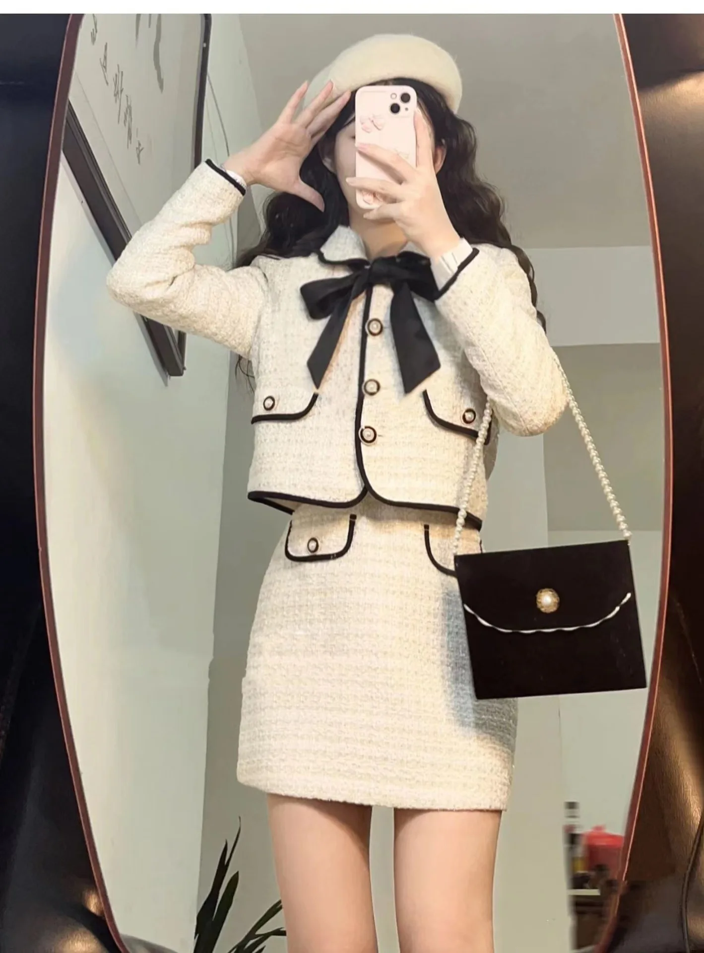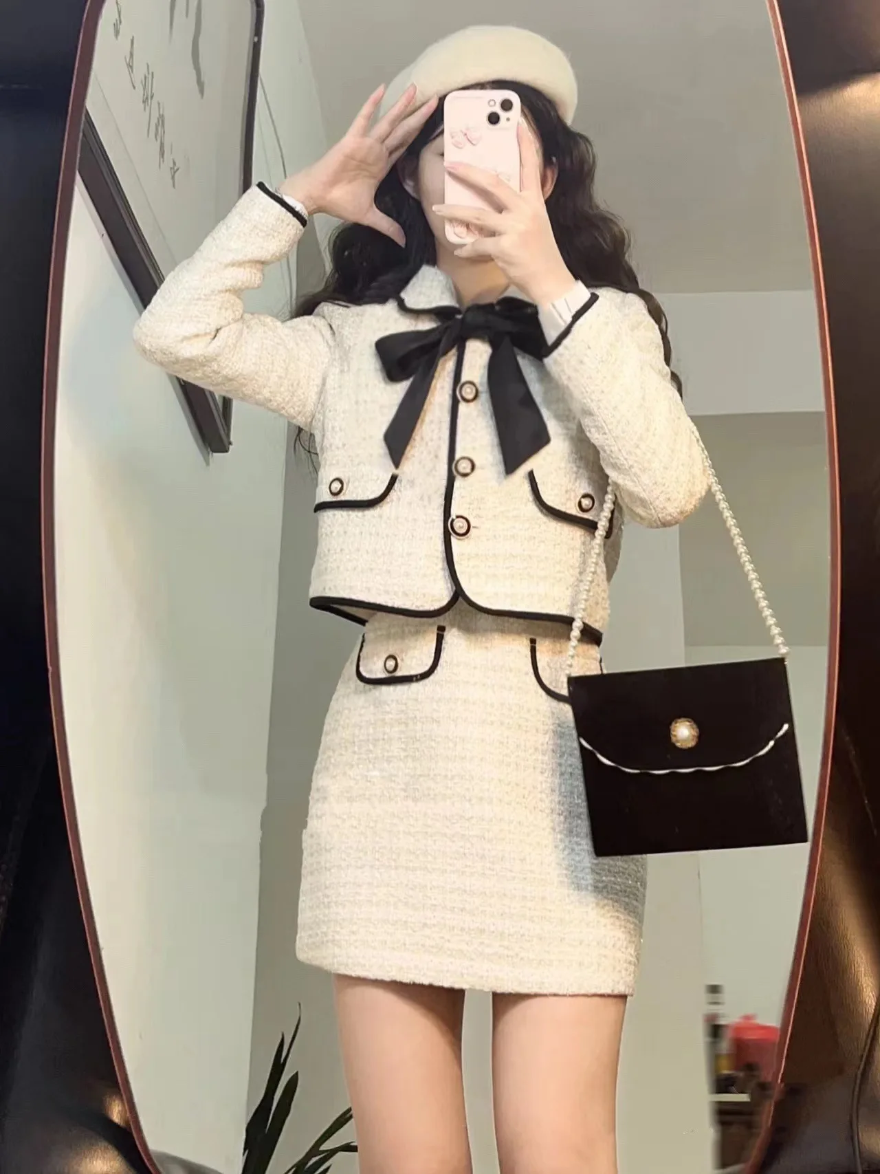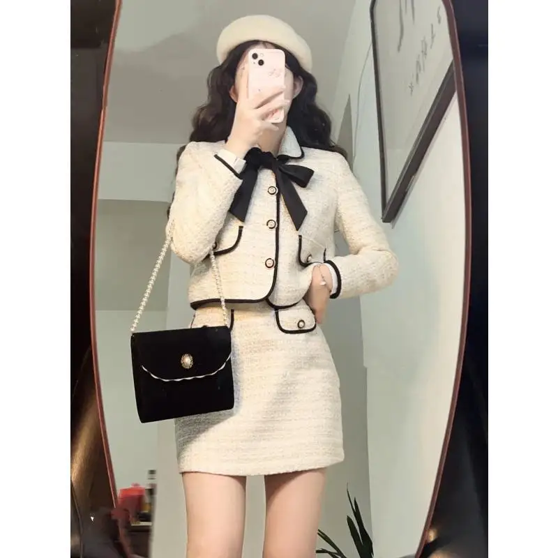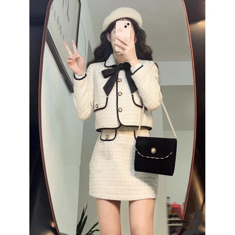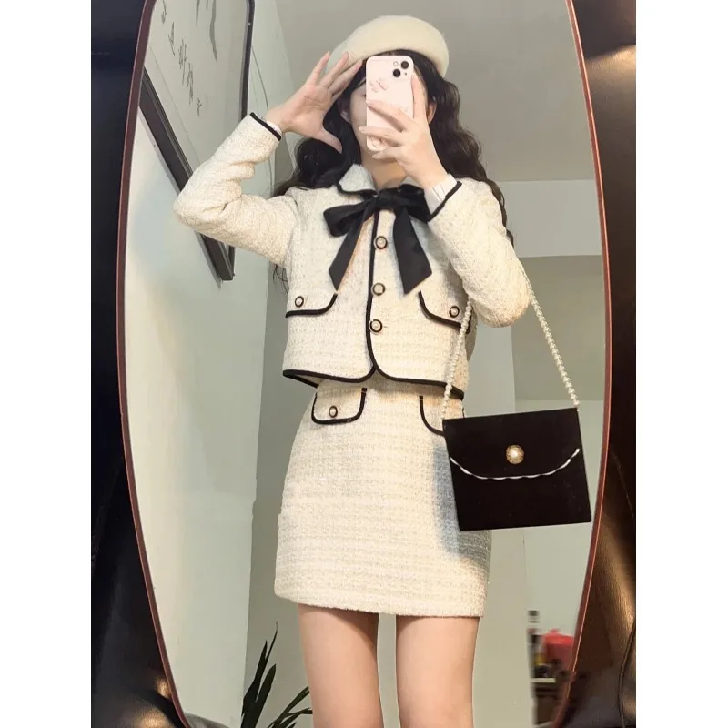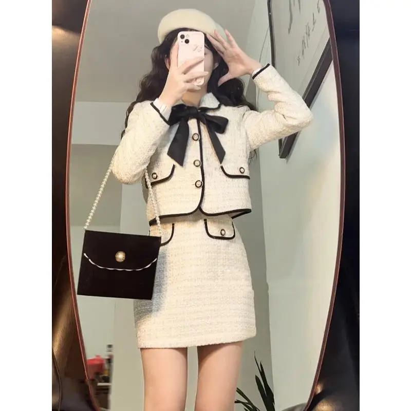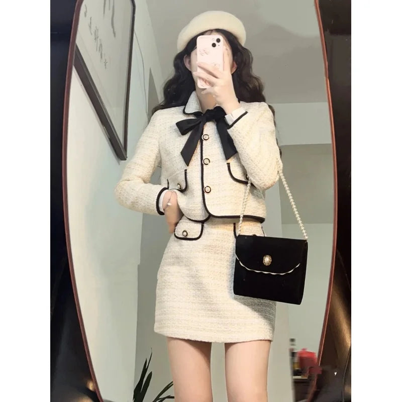 Yipinpay Temperament Tweed Jacket Plaid Cardigan Tops Bodycon Skirts 2 Piece Sets Womens Outifits Spring Slim Short Tailored Coat