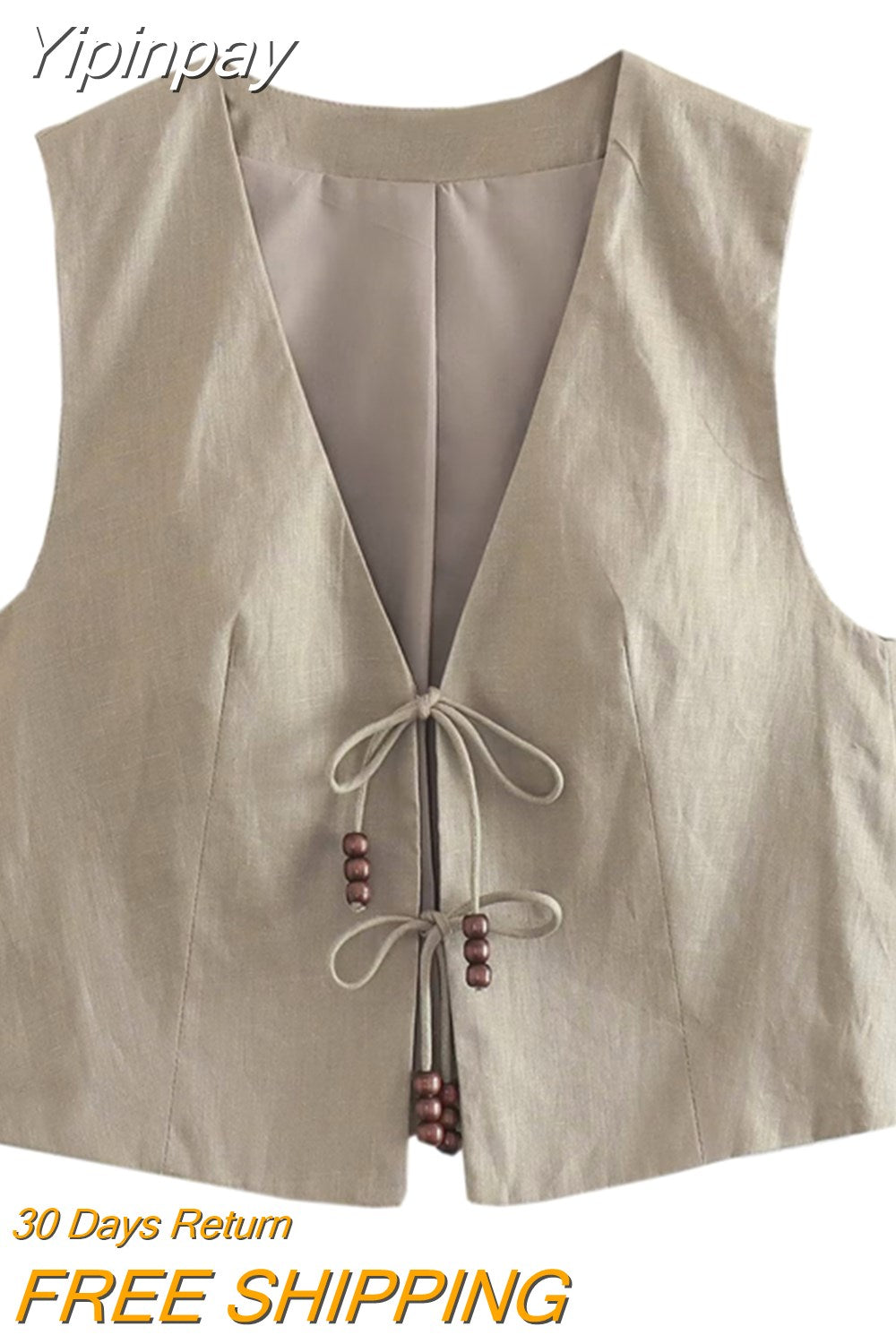 Yipinpay TRAF 2023 Women's Vest Linen Vests Woman Chic V-Neck Lace Up Summer Sleeveless Vests for Women Ladies Waistcoat Tops