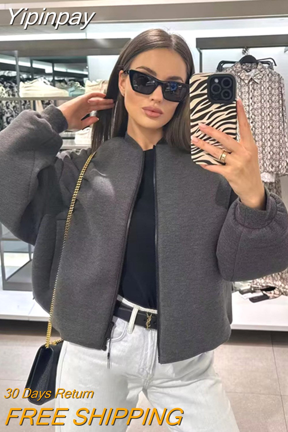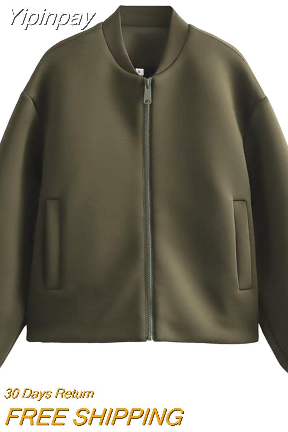 Yipinpay TRAF Woman Bomber Jackets for Women 2023 Autumn Stand Collar Coats Female Front Zipper with Pockets Ladies New Outerwear