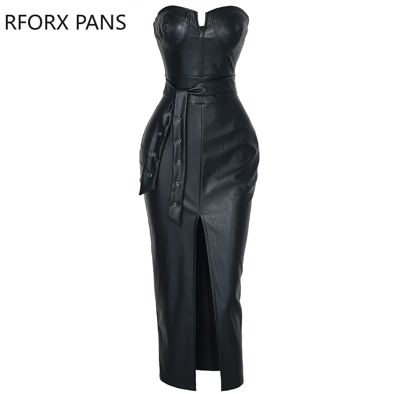Yipinpay Tube Slit Coated PU Dress Women Dress