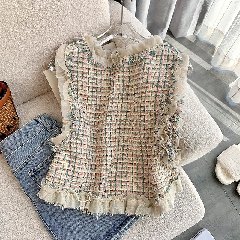 Yipinpay Tweed Vest Slim Crop Tops Autumn Colete Feminino V Neck Knitted Plaid Vest Sweater French Waistcoat Ruffled Blouse
