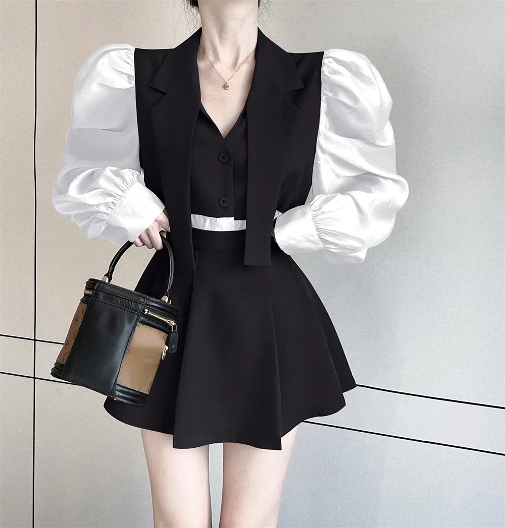 Yipinpay Two Piece Sets Women Puff Sleeve Patchwork Loose Grey Suit Short Jacket Cardigan High Waist Pleated Skirts Sets Coat Spring