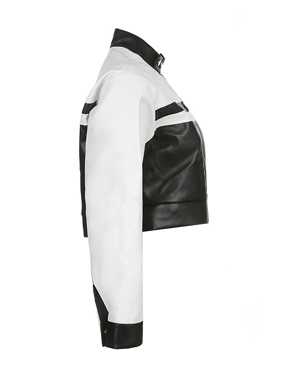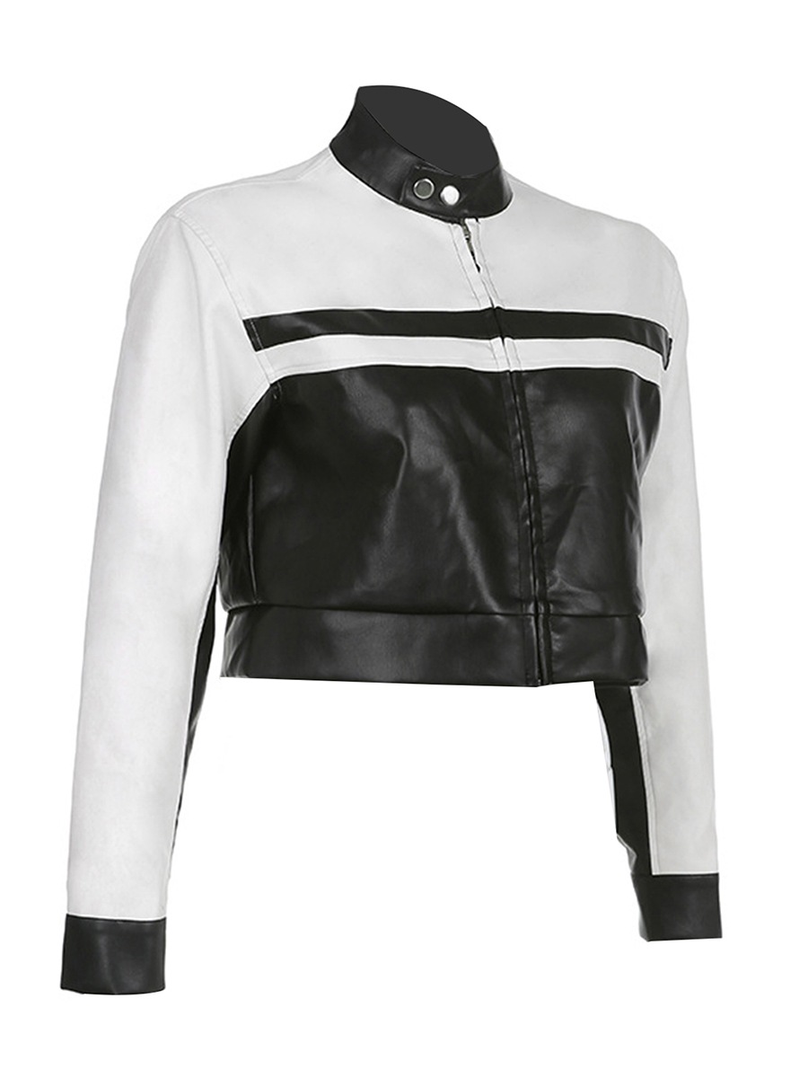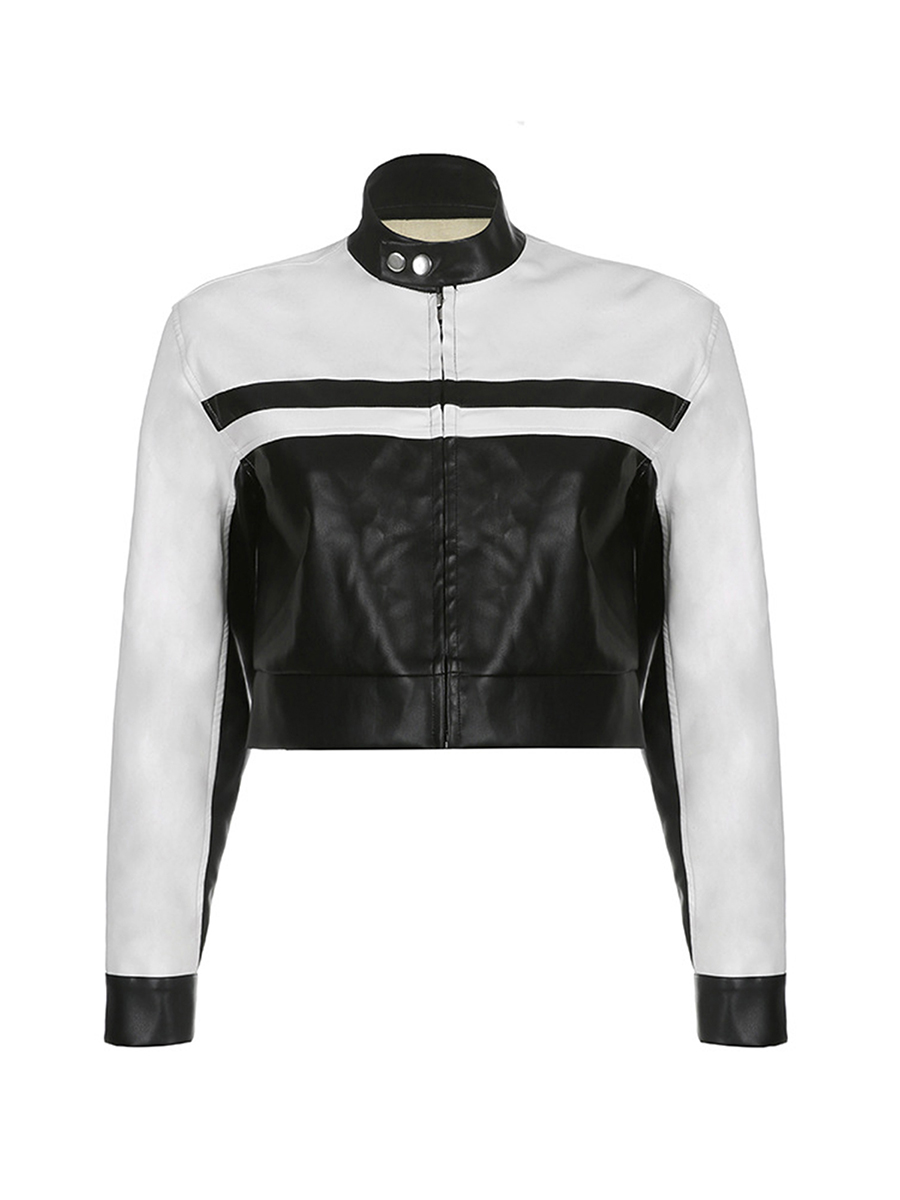 Yipinpay Women Gothic PU Leather Jacket Contrast Color Stand Collar Long Sleeve Zip-up Crop Top Bomber Coat Cool Racing Outwear
