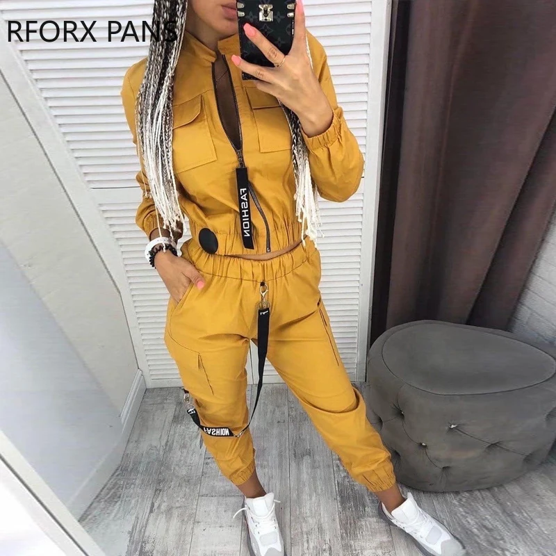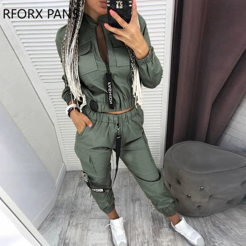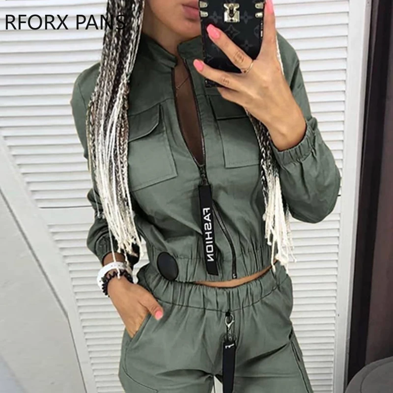Yipinpay Women Soild Pockets Zipper Design Ruched Coat & Cargo Pants Sets Casual Women Sets