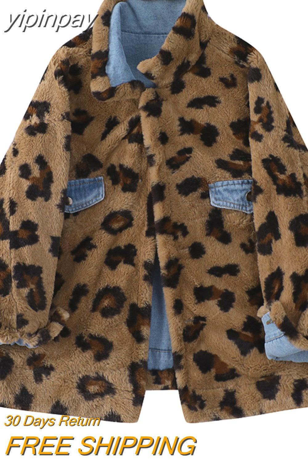 yipinpay Women's Lamb Wool Denim Jackets Winter Long Sleeves Streetwear Chic Design Leopard Print Fashion Casual Baggy Jean Jackets Coat