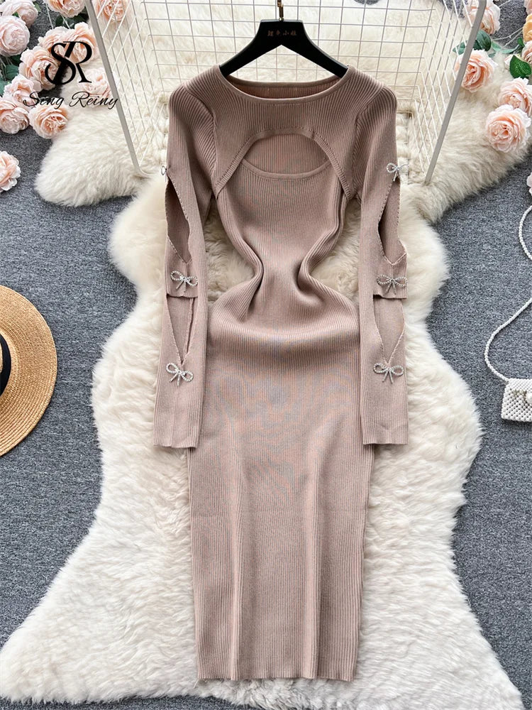 Yipinpay 2024 Autumn Knitted Chic Dress O Neck Hollow Out Long Sleeves Bows Decoration Solid Women Slim Fit Bodycon Party Dress