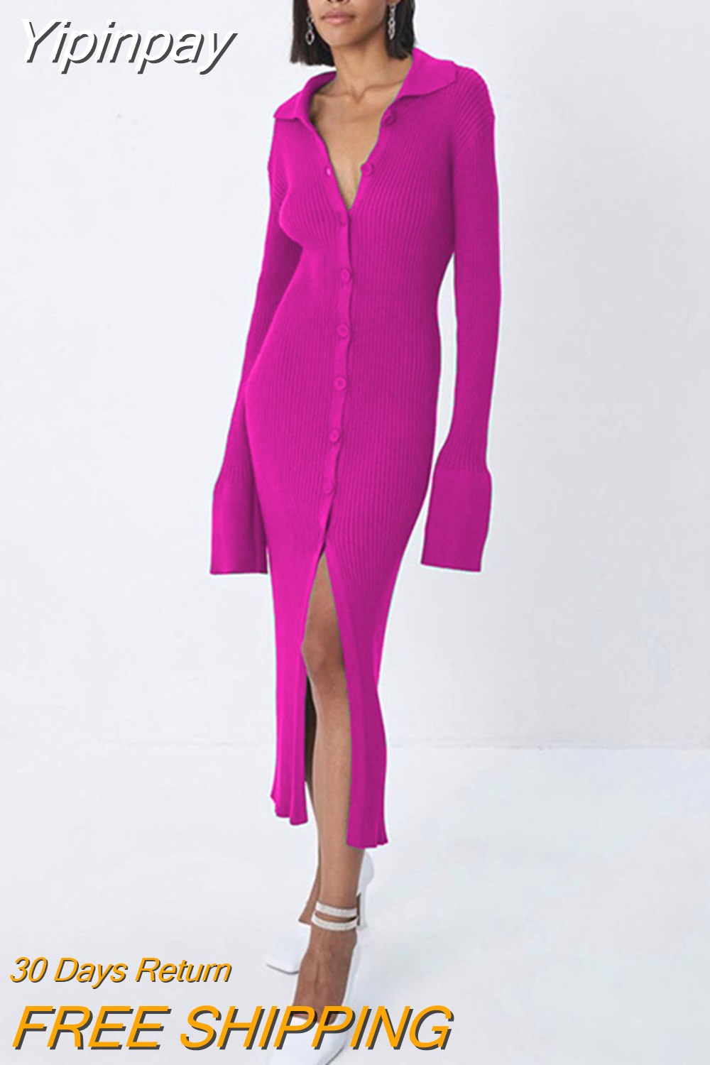 Yipinpay Autumn Winter Elegant Knit Rib Bodycon Dress Office Lady Long Sleeve Lapel Button down Midi Dress Party Casual Women Wear