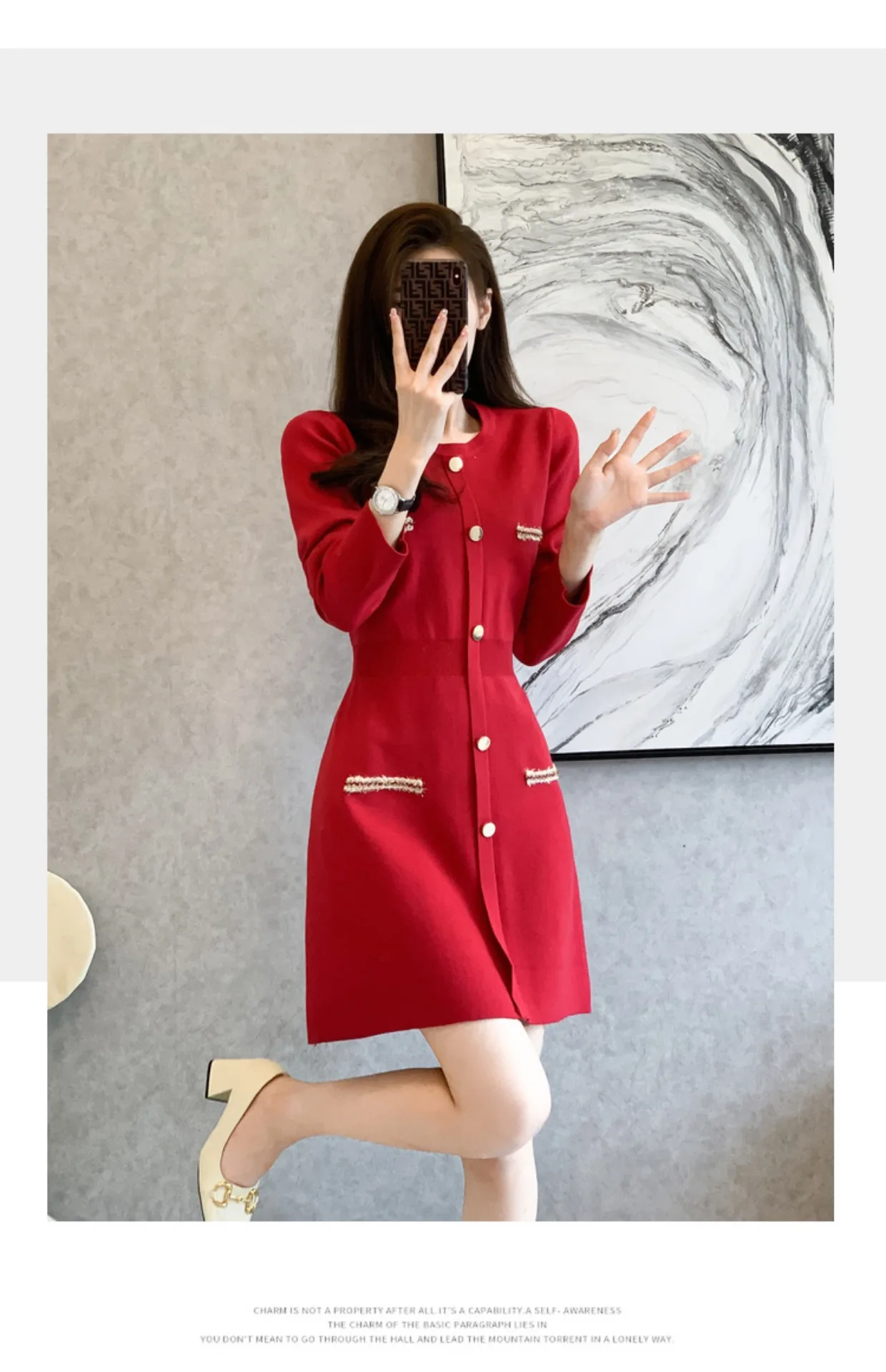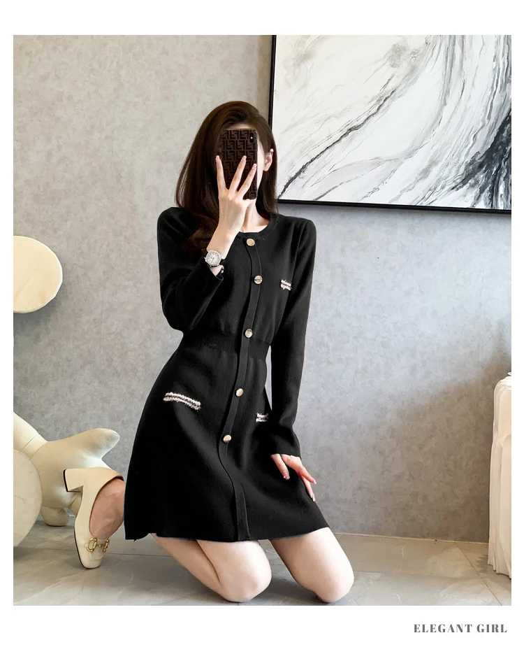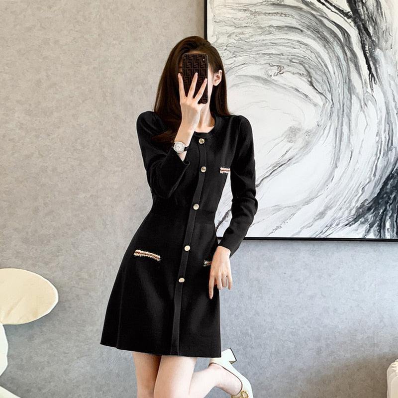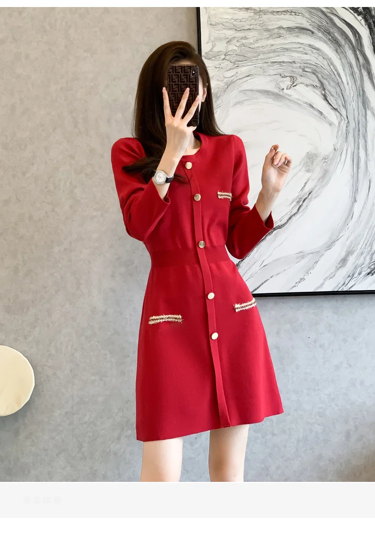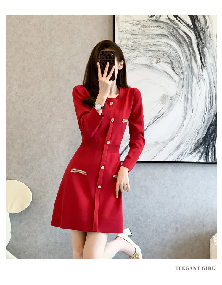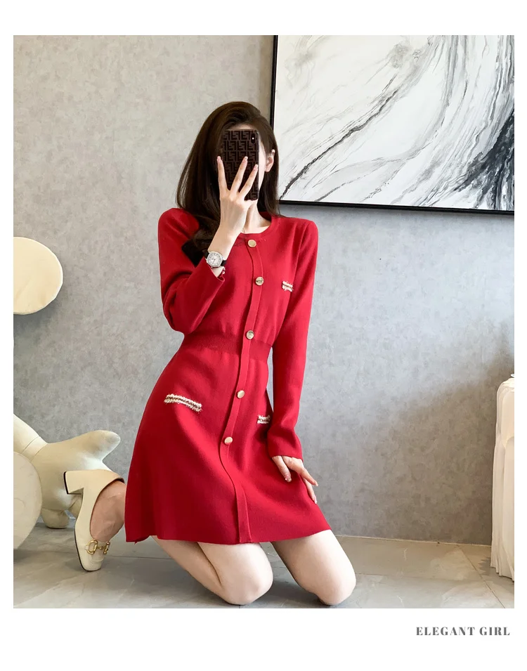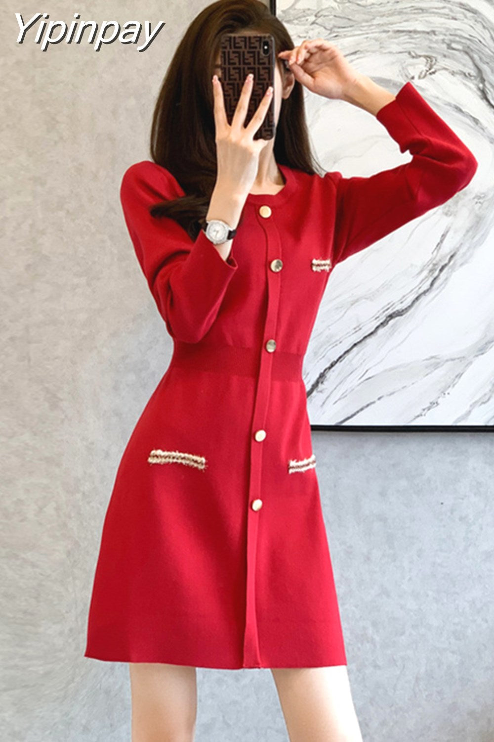 Yipinpay Button Knitted Dress A-line Long Sleeve Fall Winter 2023 Slim Elegant Korean Black Short Robe Red Christmas Party Vestido