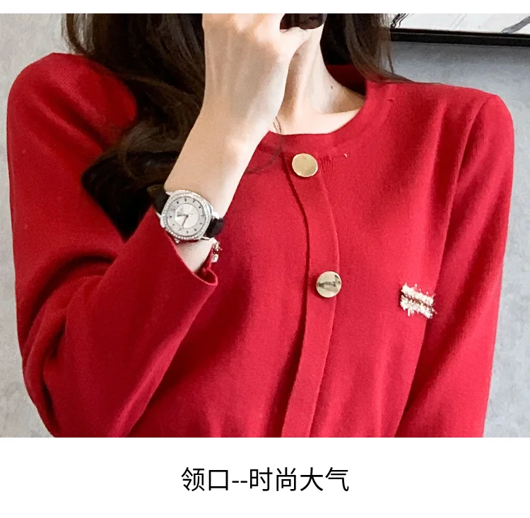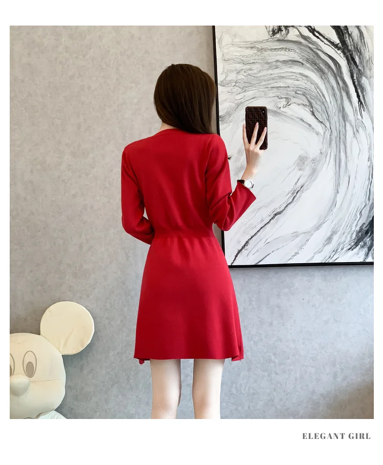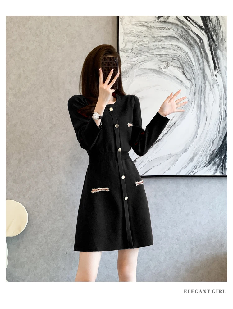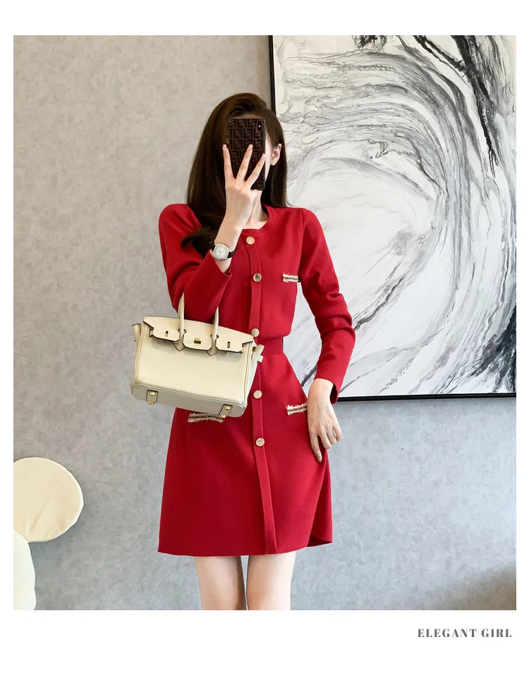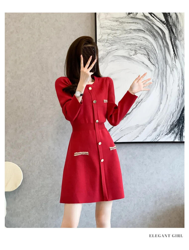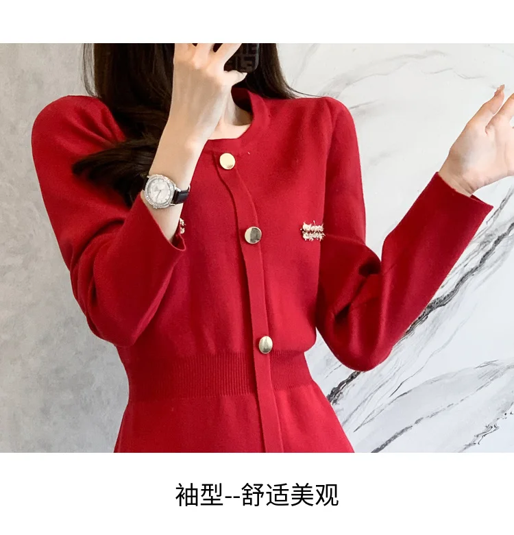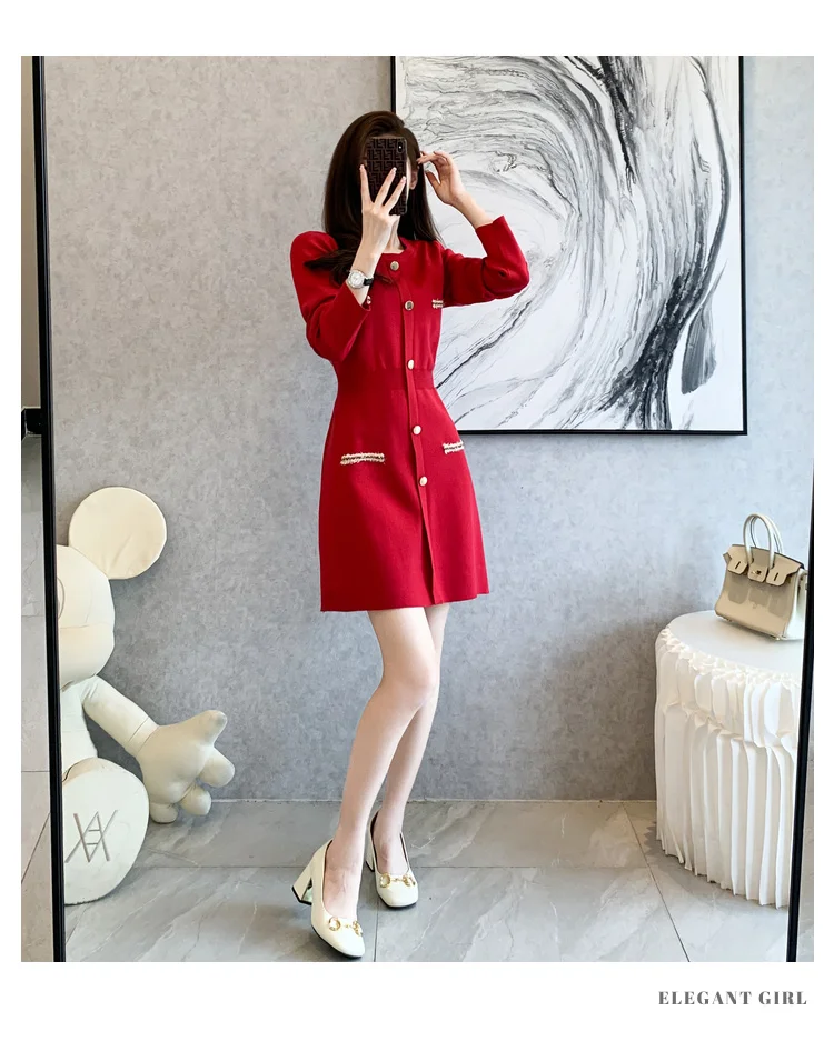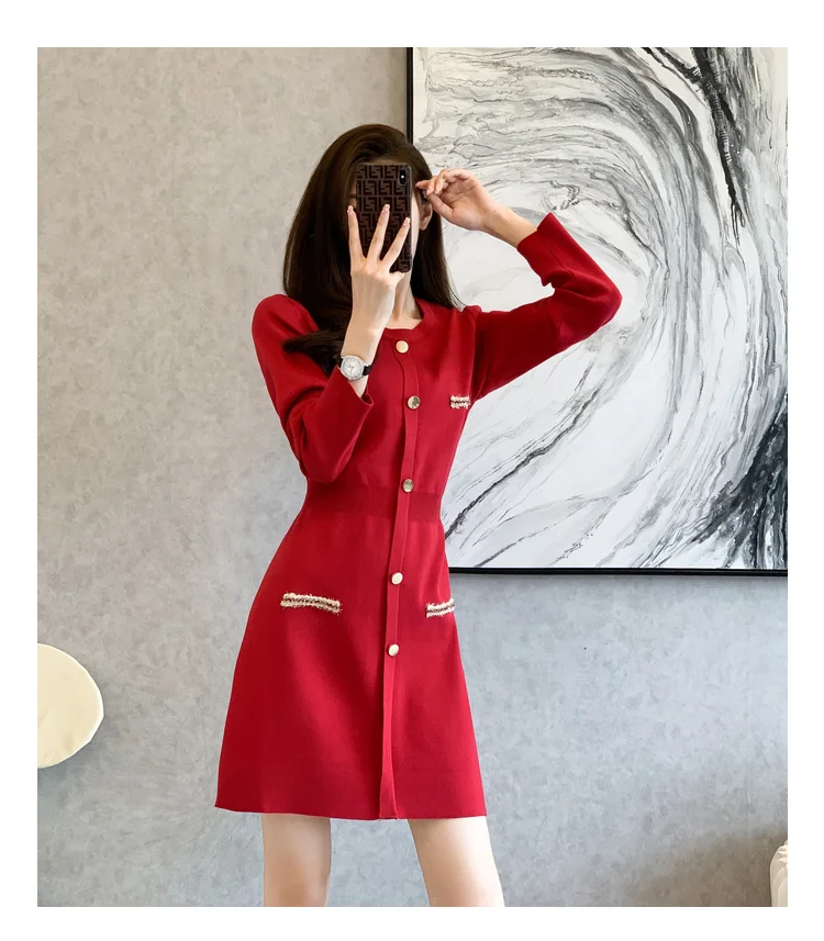 Yipinpay Button Knitted Dress A-line Long Sleeve Fall Winter 2023 Slim Elegant Korean Black Short Robe Red Christmas Party Vestido