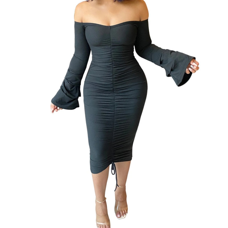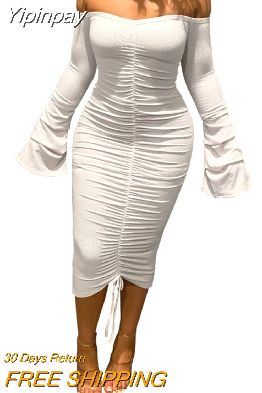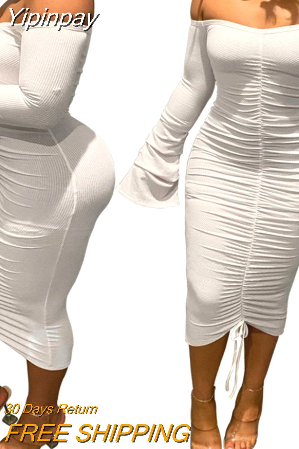 Yipinpay Dress Fall Winter Clothes 2023 Off Shoulder Sexy Bodycon Long Sleeve Ruched Sheath Dress with Drawstring Prom Night Club