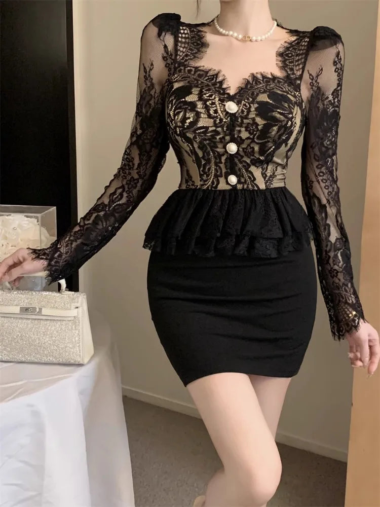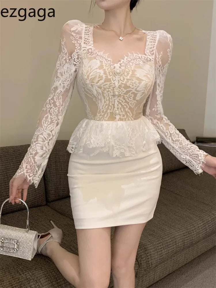 Yipinpay Dresses Women Elegant Square Collar Lace Patchwork Long Sleeve Slim Sexy Dress Ladies French Style Chic Party Temperament