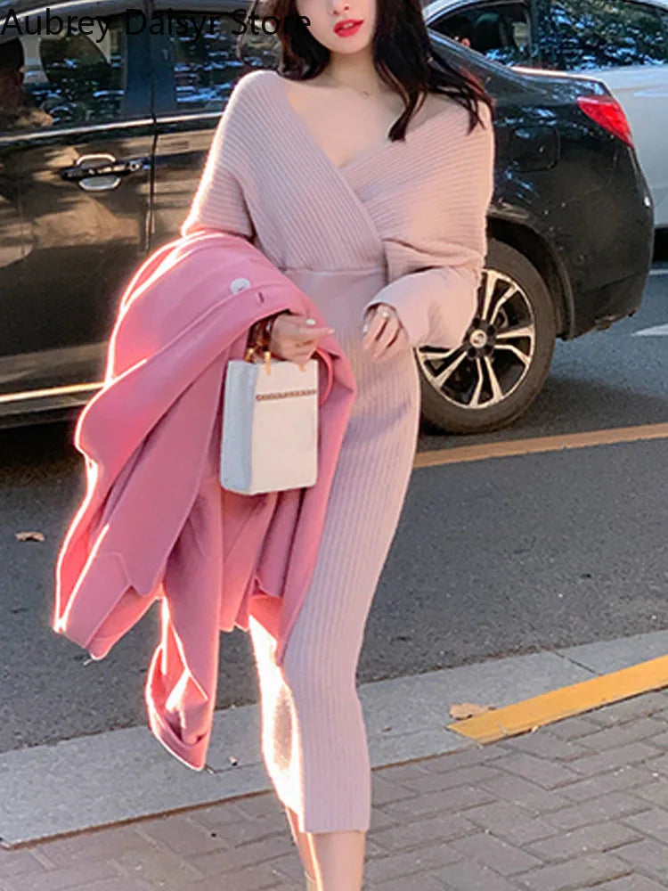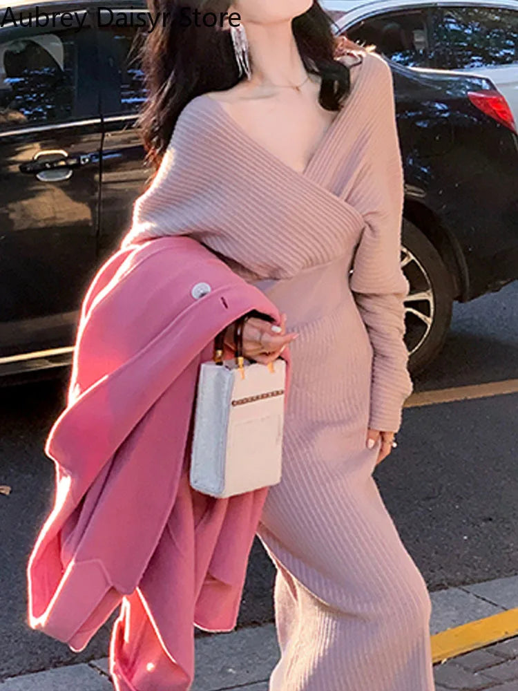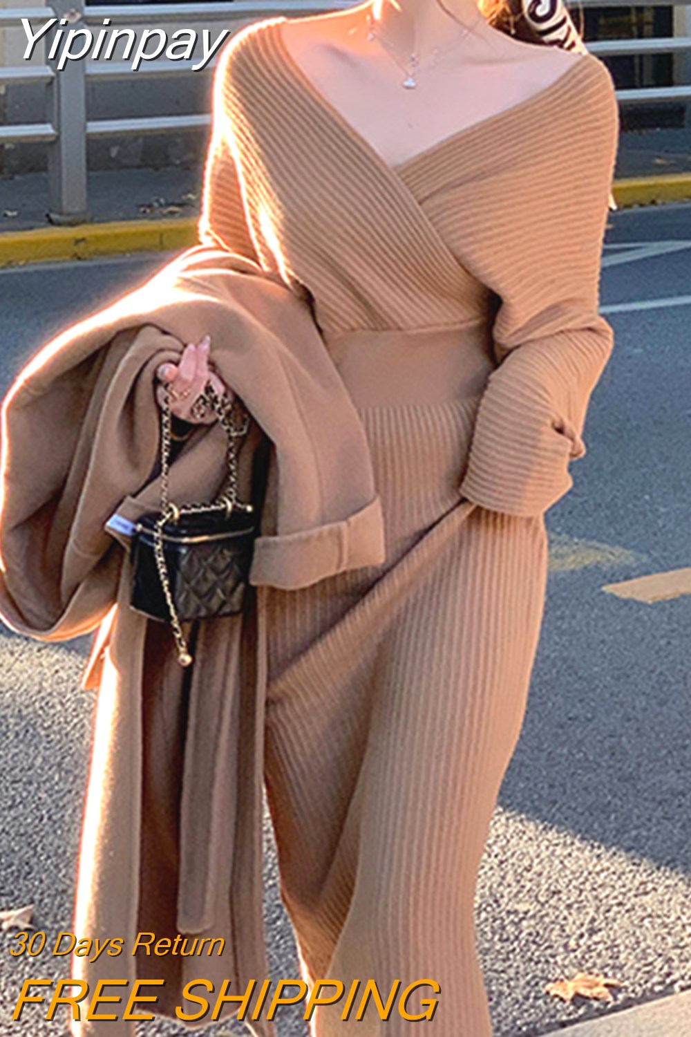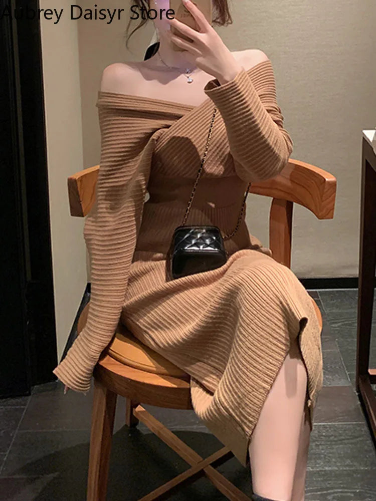 Yipinpay Elegant Long Knitting Dress Women Autumn Sexy Off Shoulder Chic Y2k Dress 2023 Vintage Casual Evening Party Sweater Dress