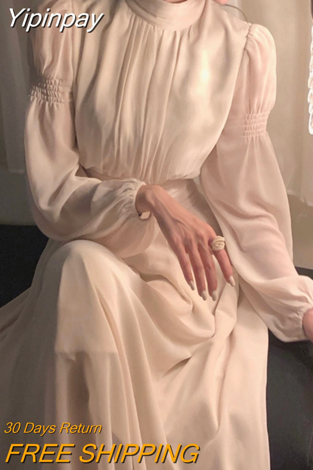 Yipinpay Elegant Solid Midi Dress Turtleneck Design 2023 Spring One Piece Dress Korean Fashion Long Sleeve Fairy Even Party Dress
