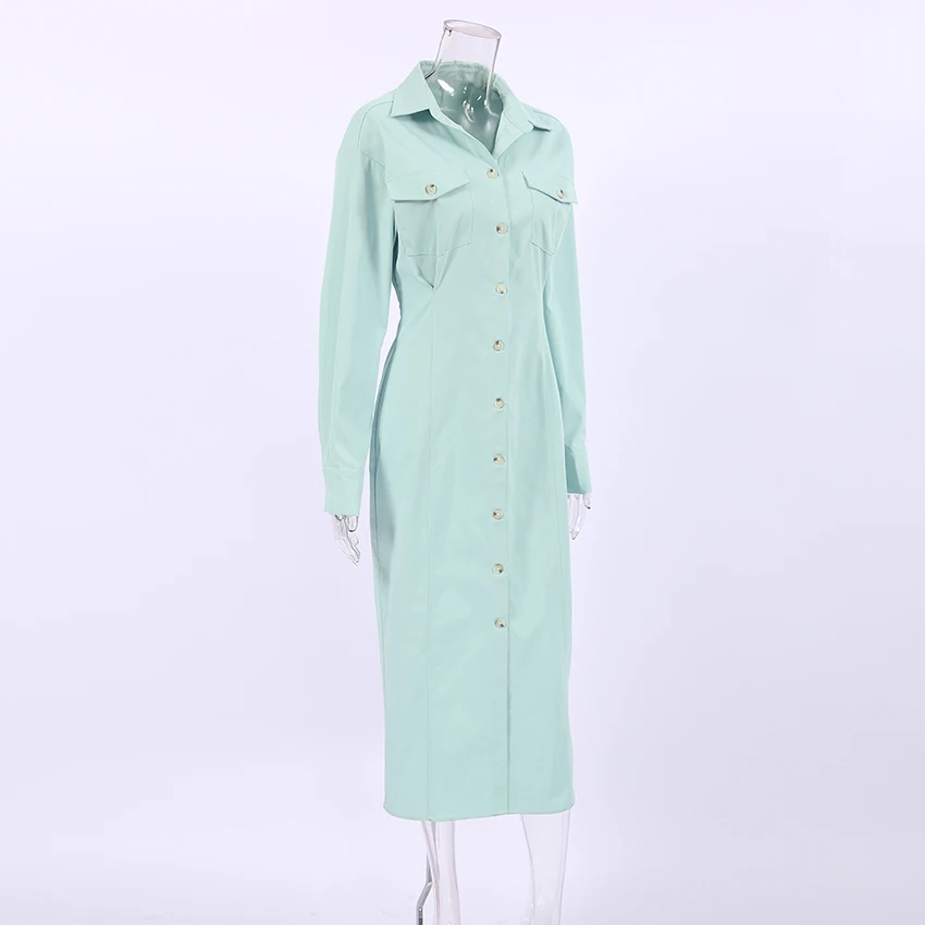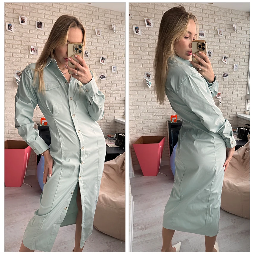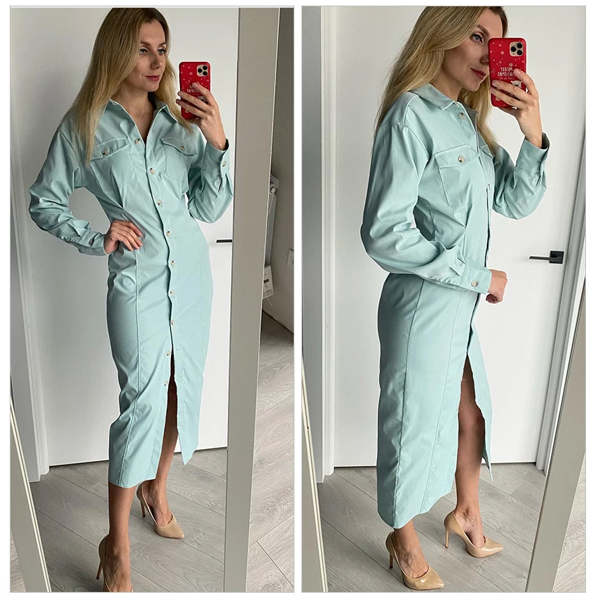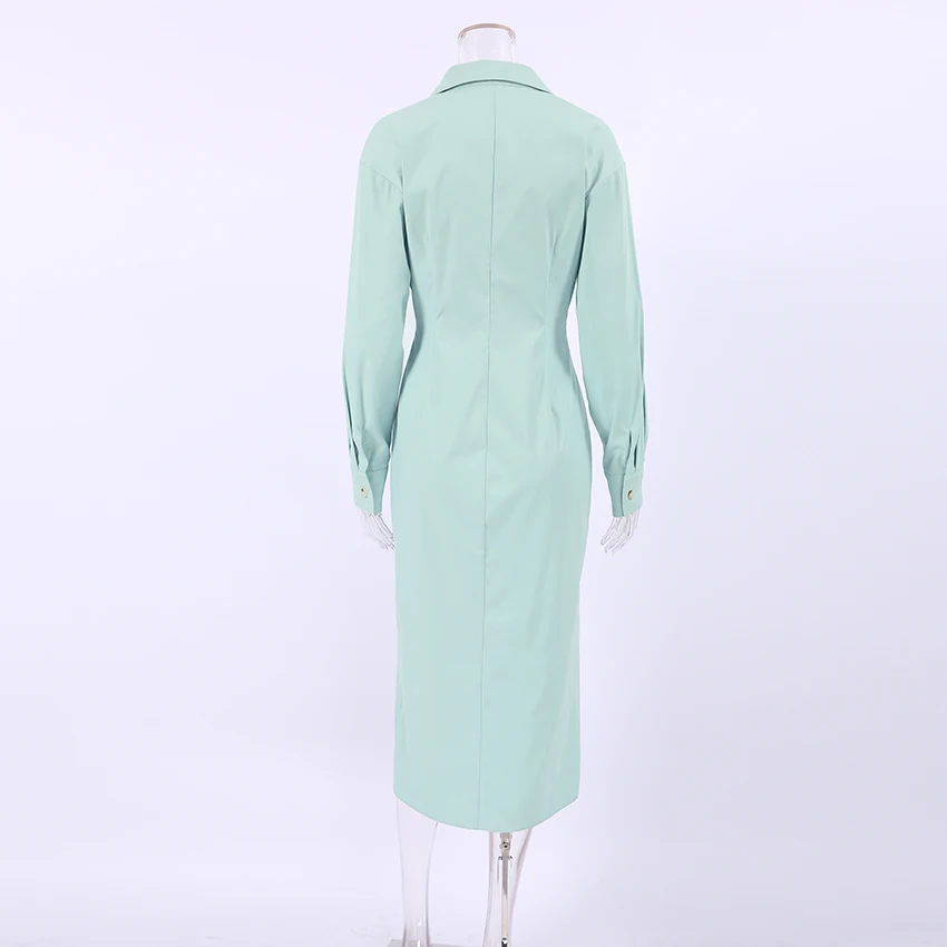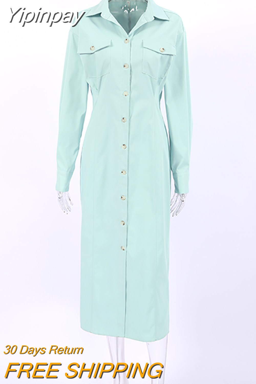 Yipinpay Elegant Women Cyan Office Dress Long Sleeve Split Midi Dresses Fashion 2023 Single-Breasted Ladies Lapel Dress Chic