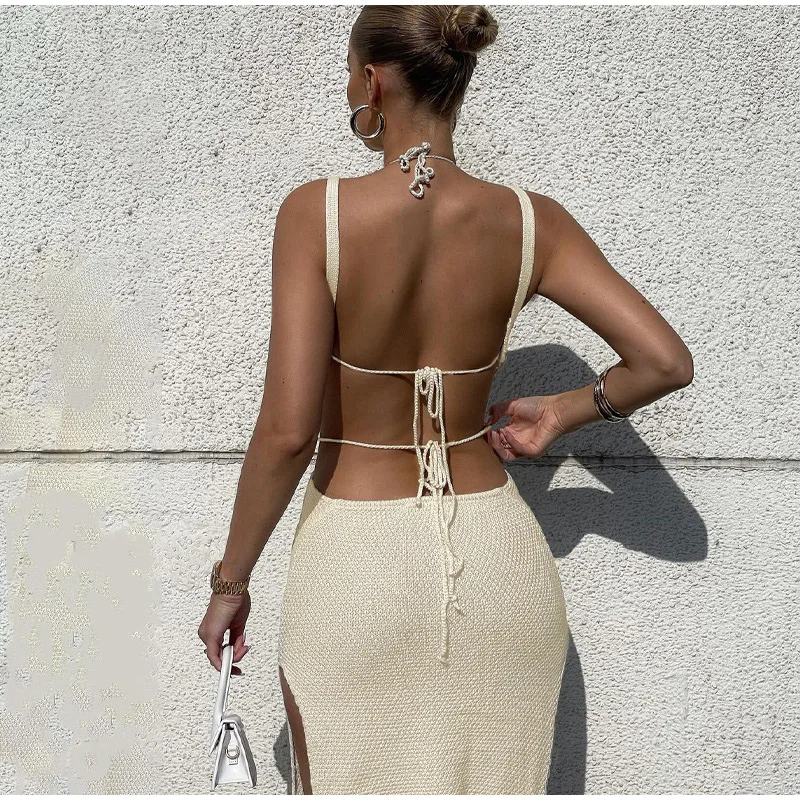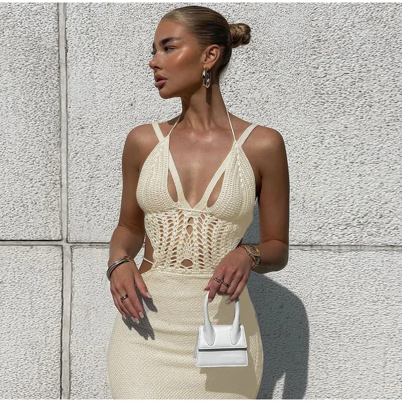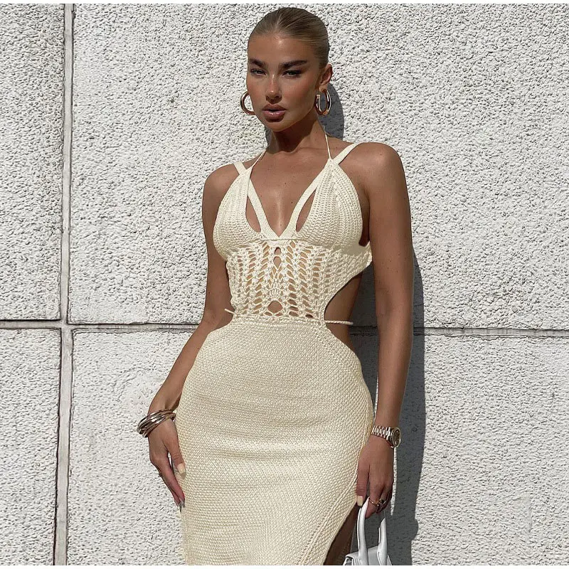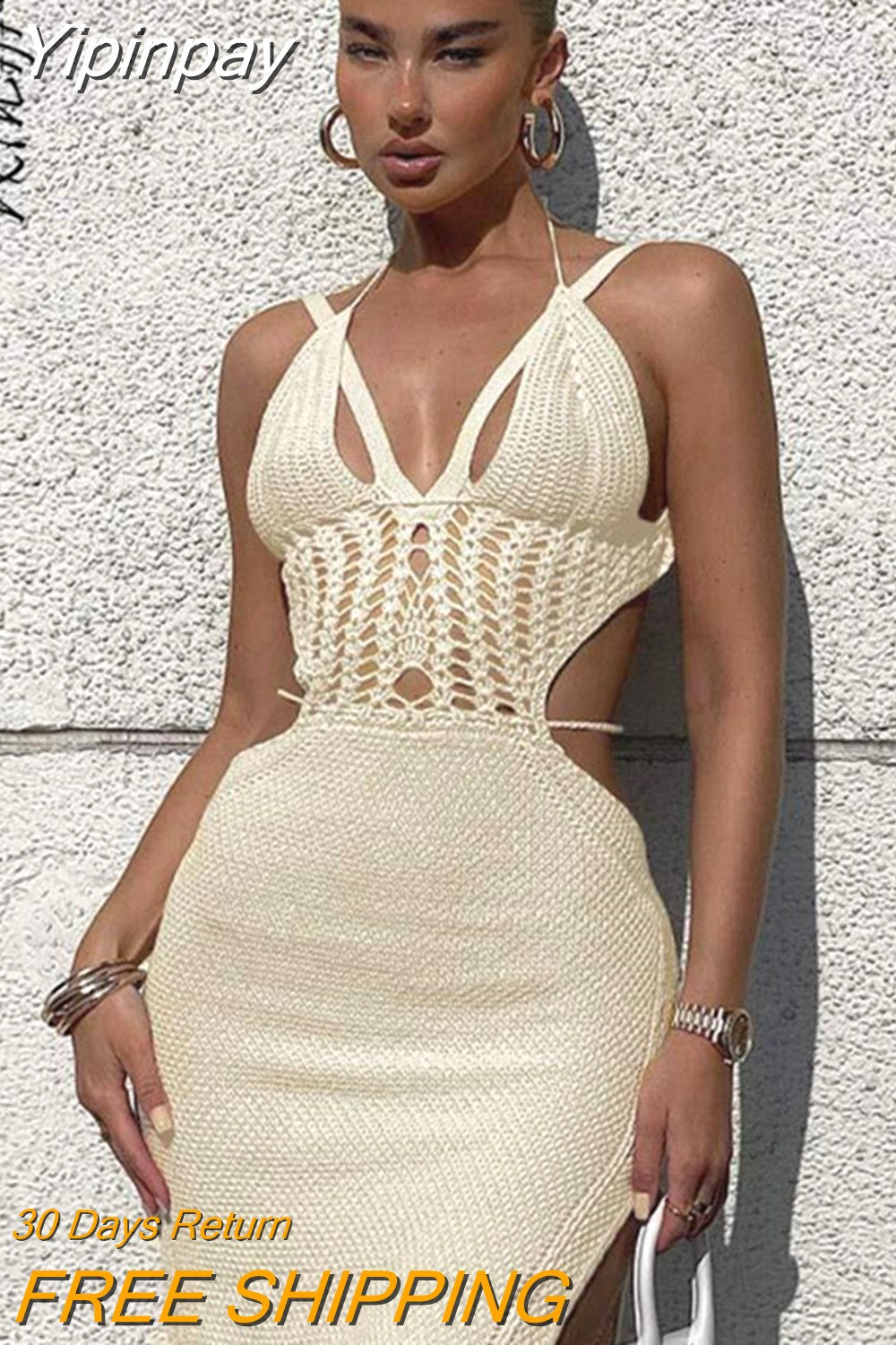 Yipinpay Fashion Trend Knitted Hollow Out Dress Women Sexy Backless Halter Maxi Sling Dresses Elegant Beach Female Vestidos