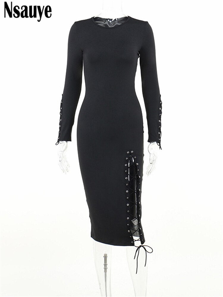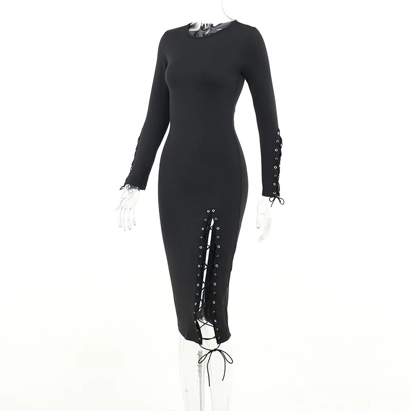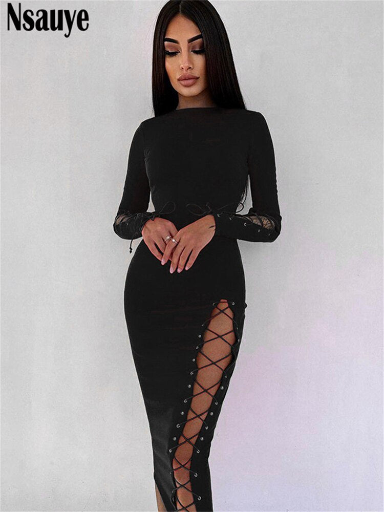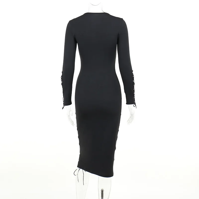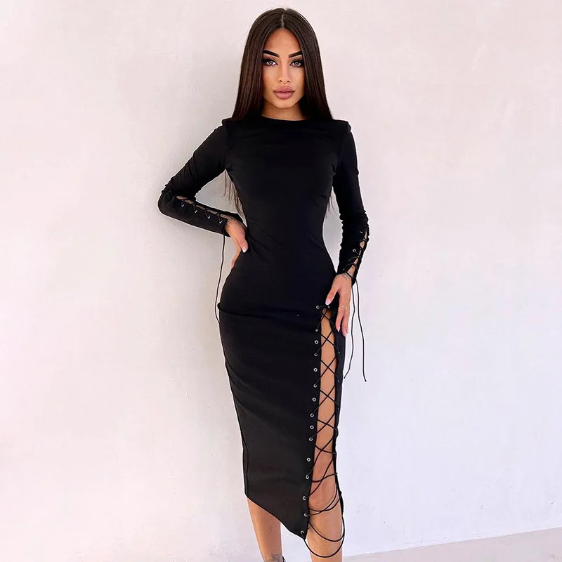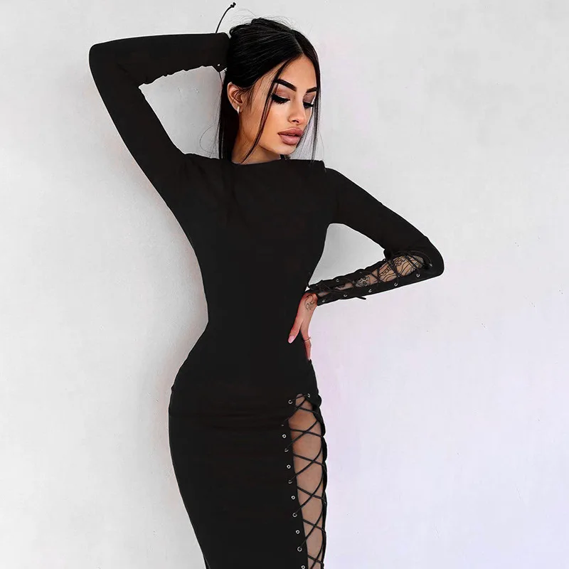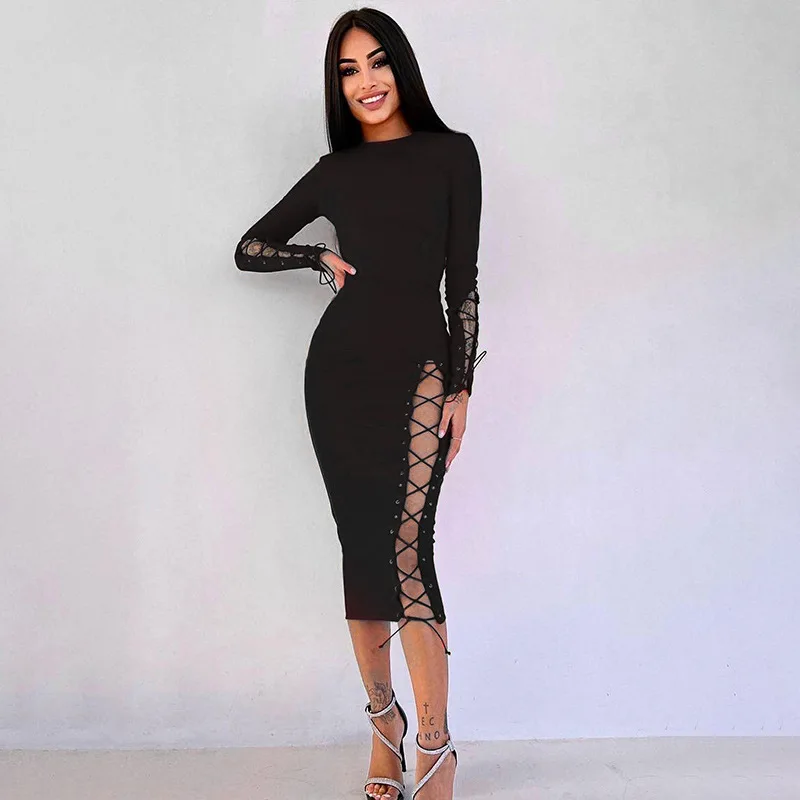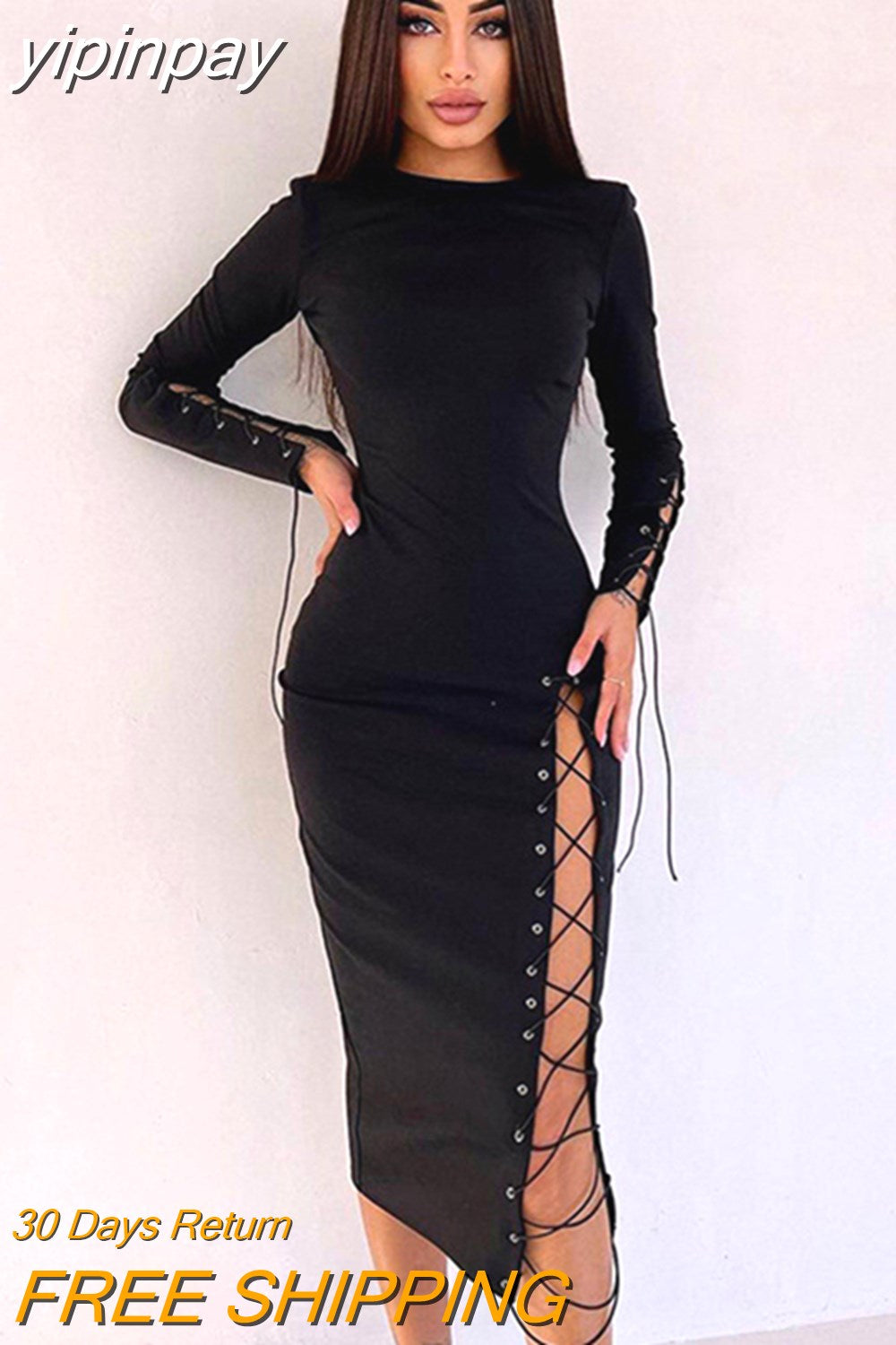 yipinpay Hollow Out Women Sexy Midi Bodycon Bandage Long Sleeve Night Club Fashion Dress Party 2023 Autumn Wrap O Neck Dress