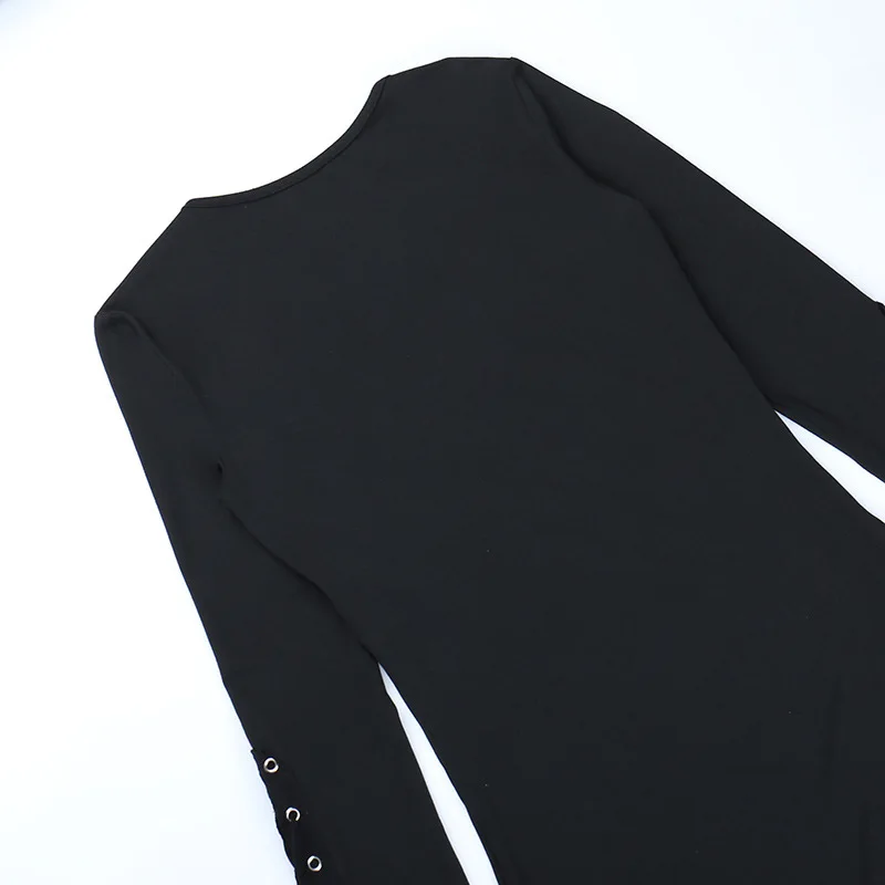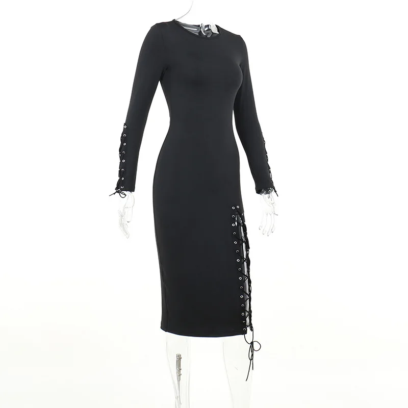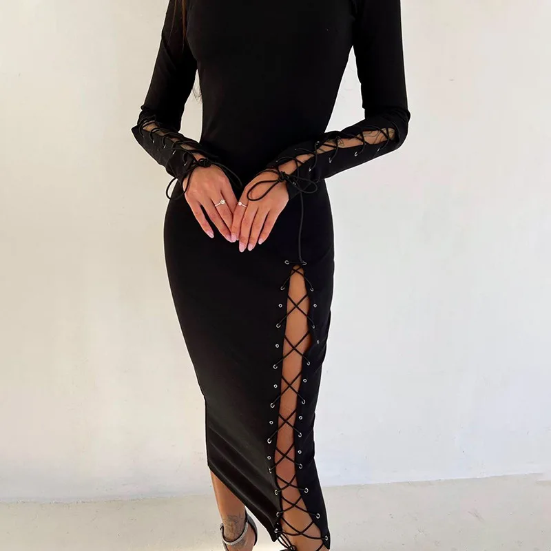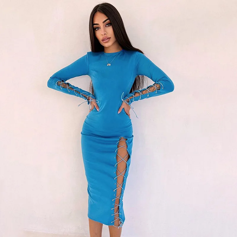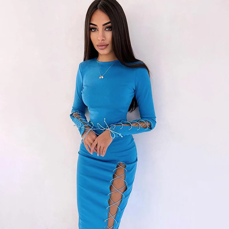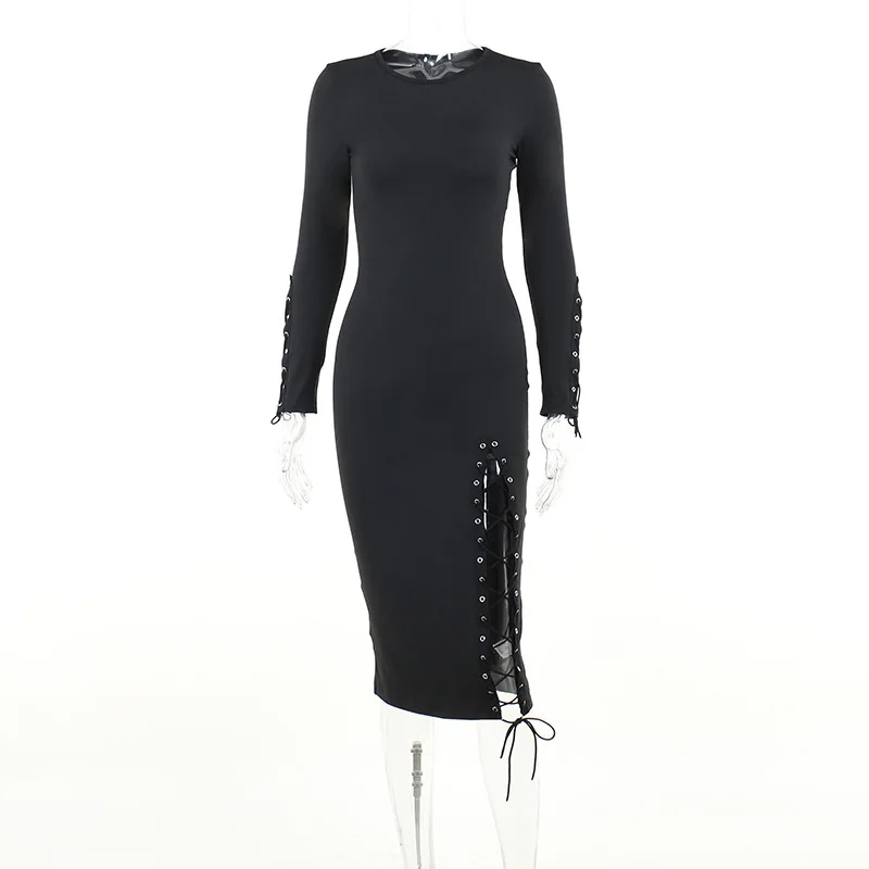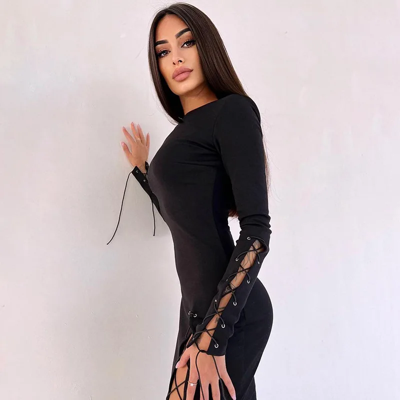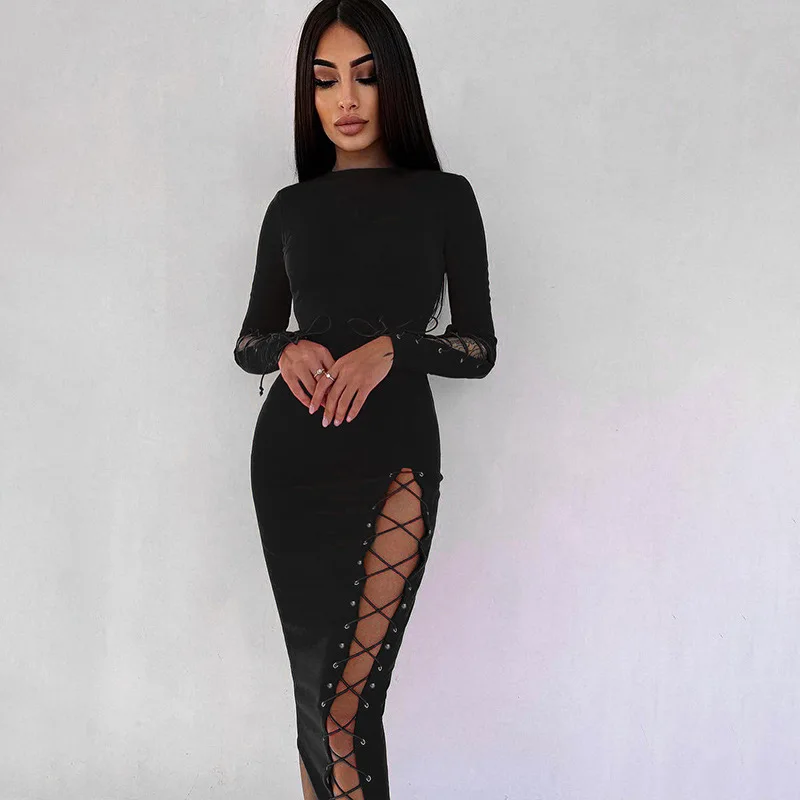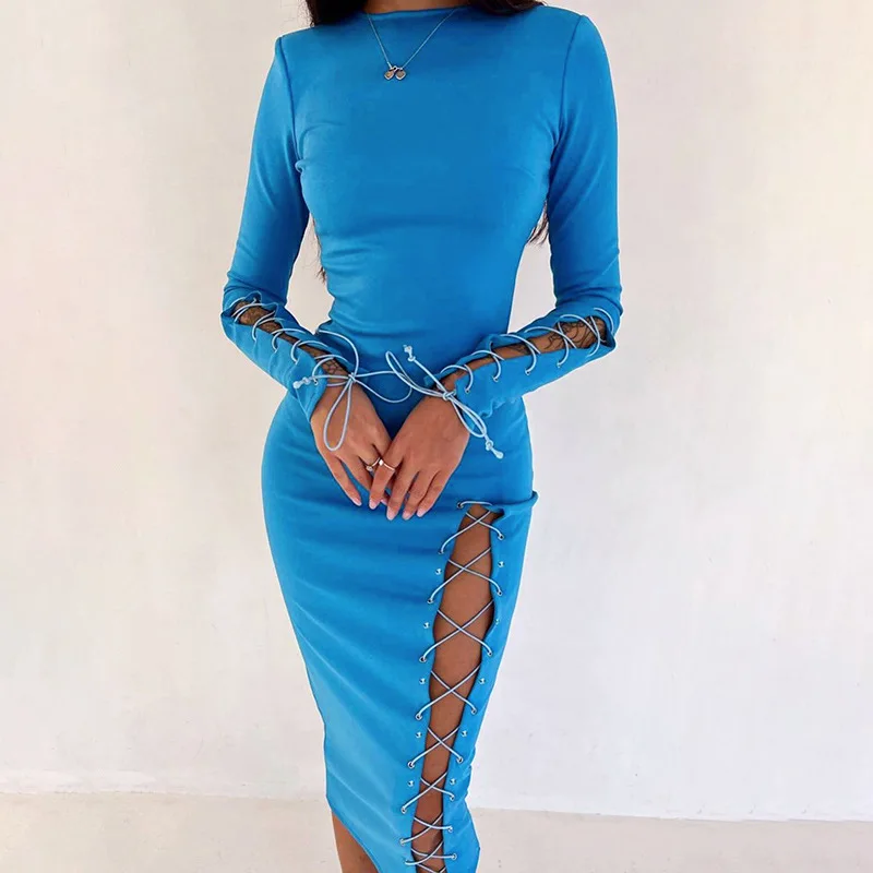 yipinpay Hollow Out Women Sexy Midi Bodycon Bandage Long Sleeve Night Club Fashion Dress Party 2023 Autumn Wrap O Neck Dress