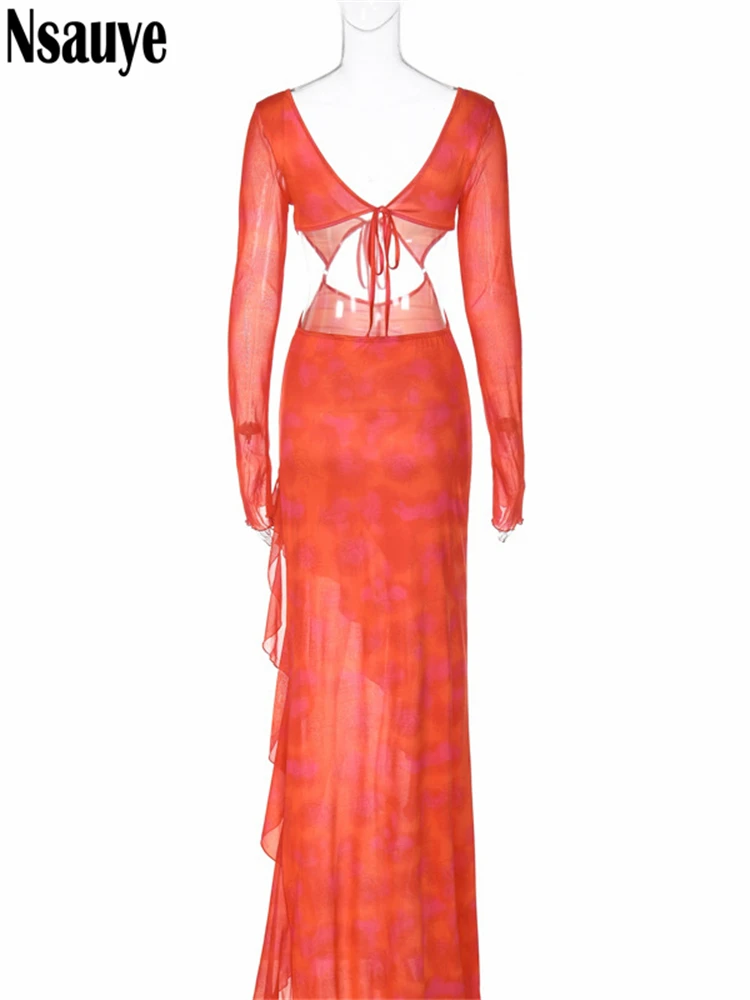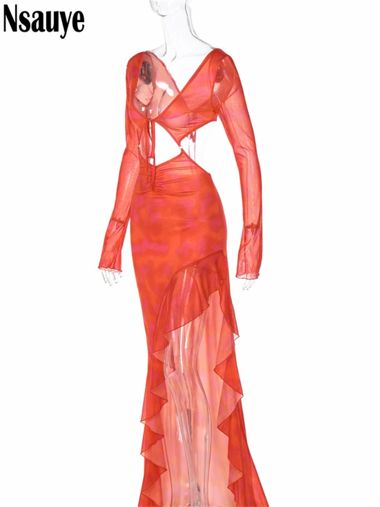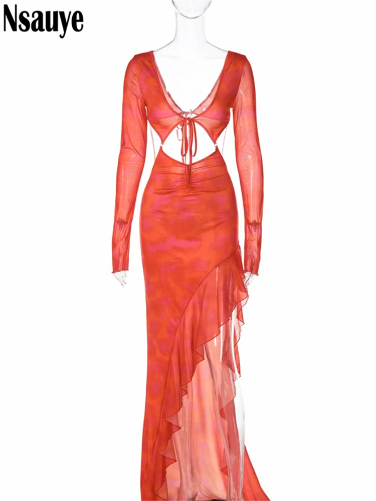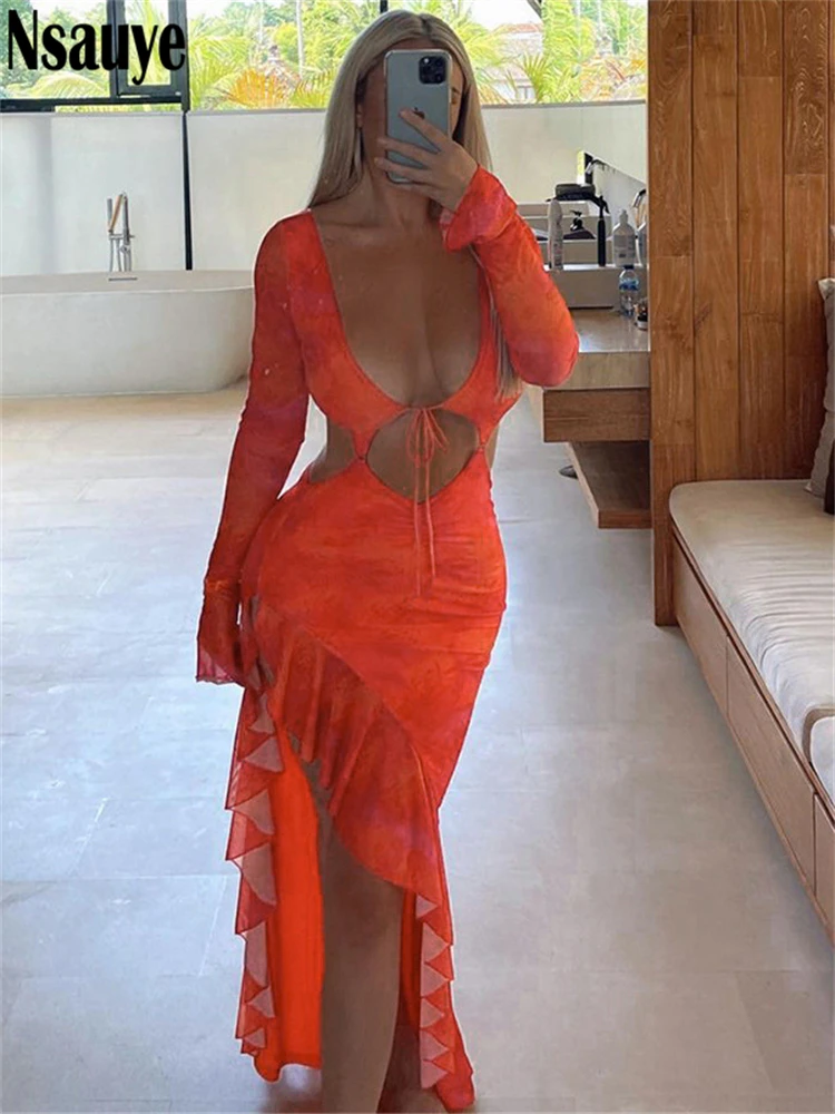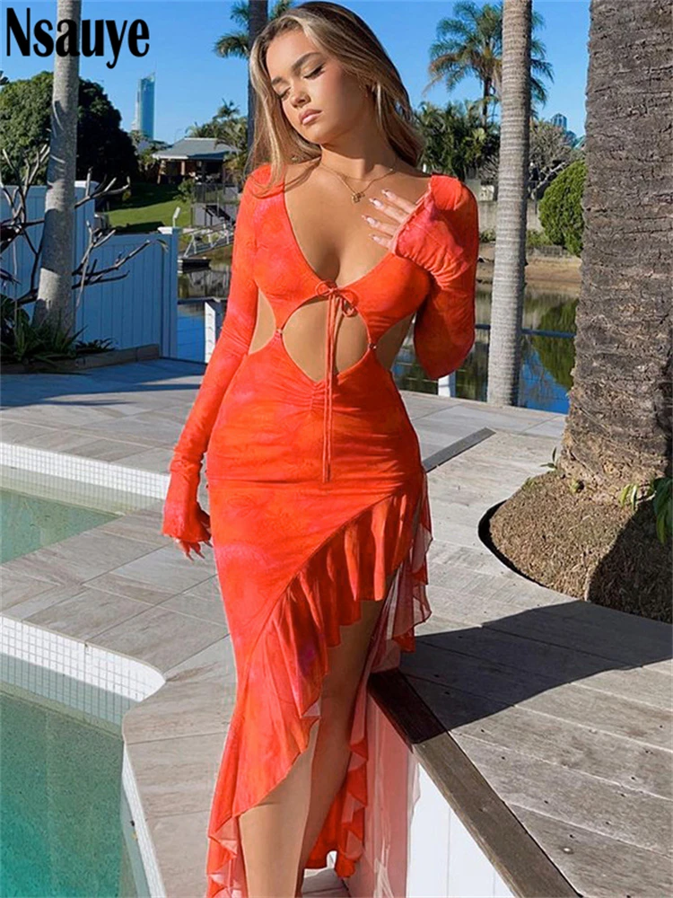 yipinpay Long Sleeve Orange Ruffles Maxi Autumn Dresses Women Clothing Club Party Y2K Elegant Outfits 2023 Sexy Cut Out Long Dress