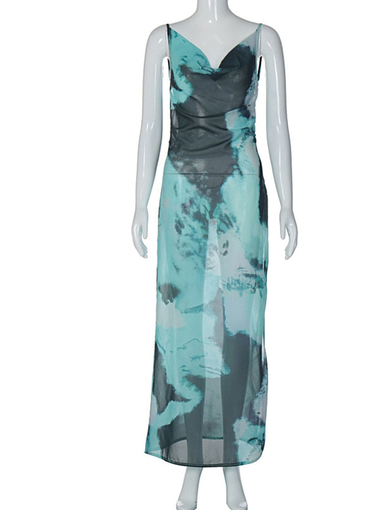 Yipinpay MO 2023 Summer Elegant Tie Dye Chiffon Dress Sexy Women Backless Side Split Bodycon Long Dresses Beach Party Vestidos