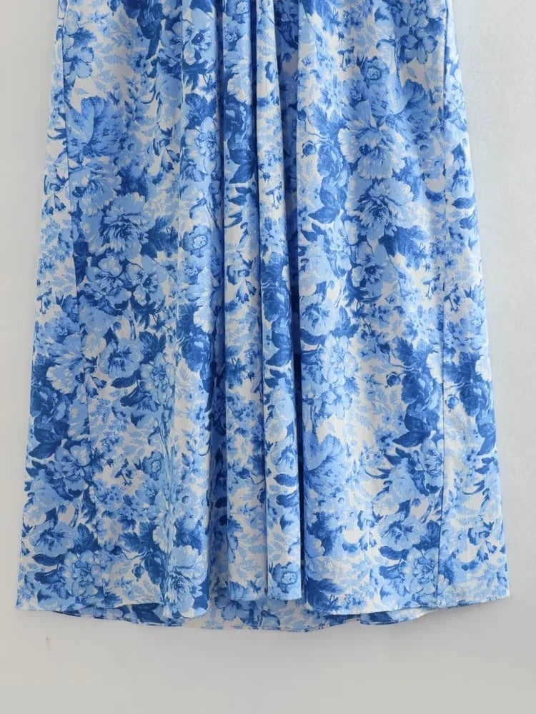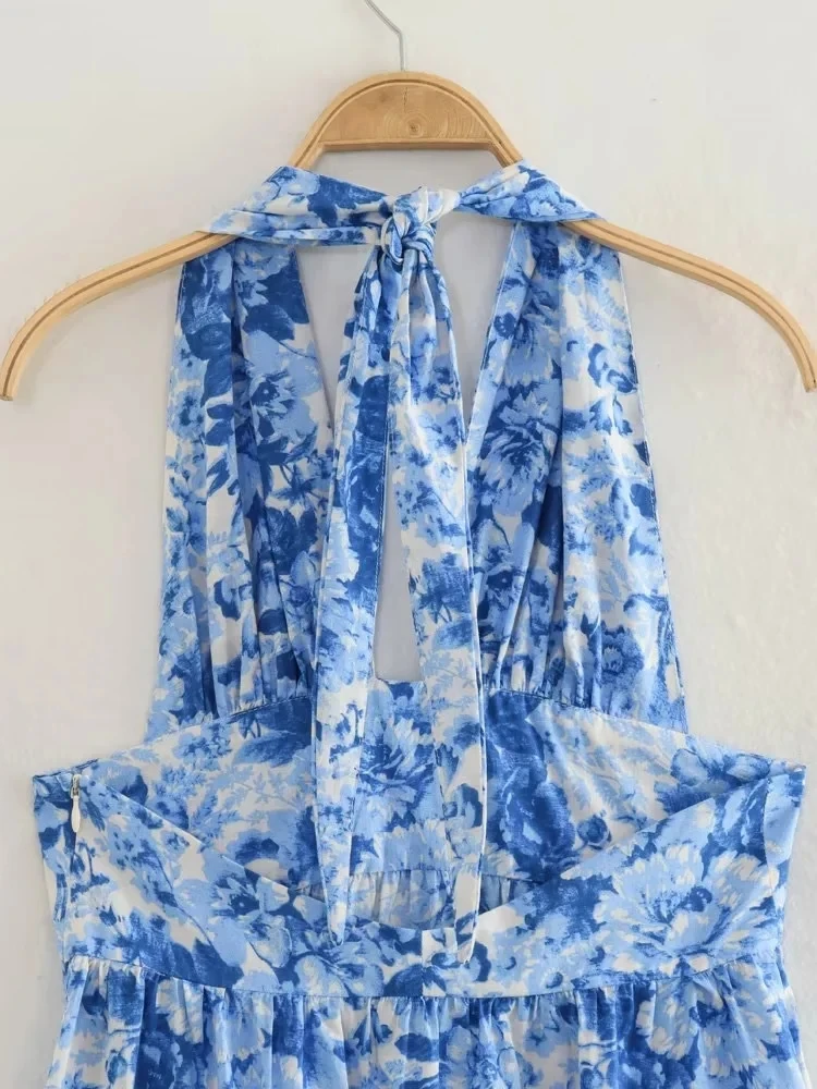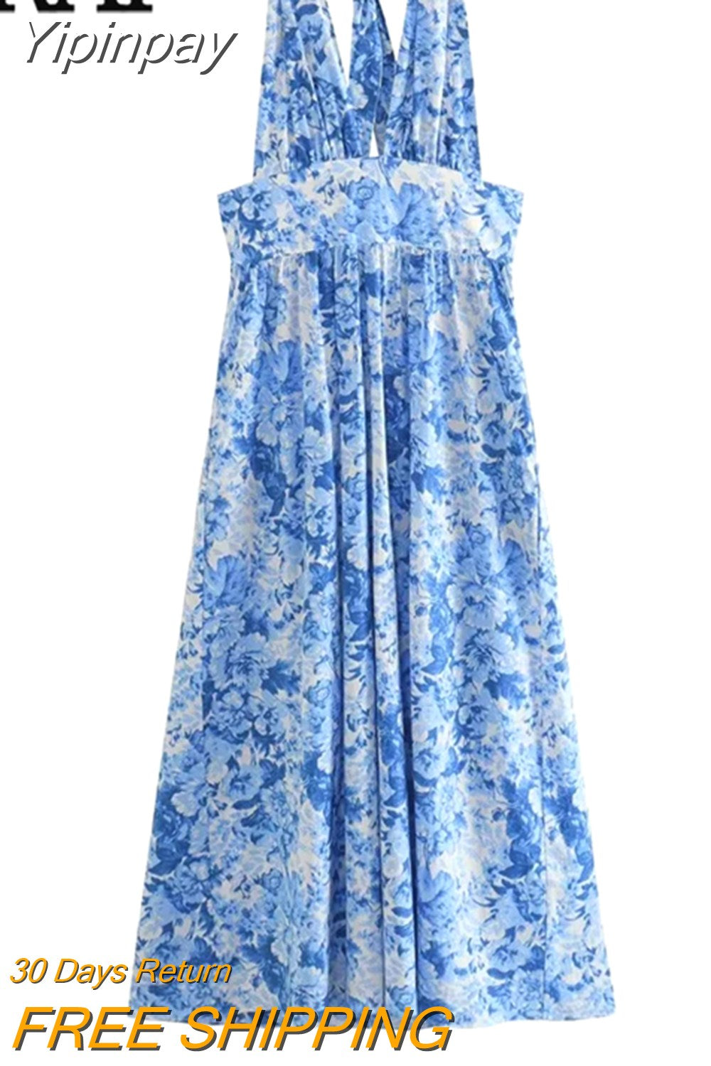 Yipinpay Print Halter Long Dress Women Blue Floral Backless Dress Woman Off Shoulder Sexy Summer Dresses Midi Holiday Party Dresses
