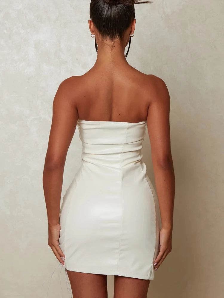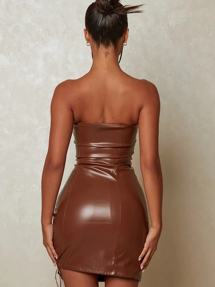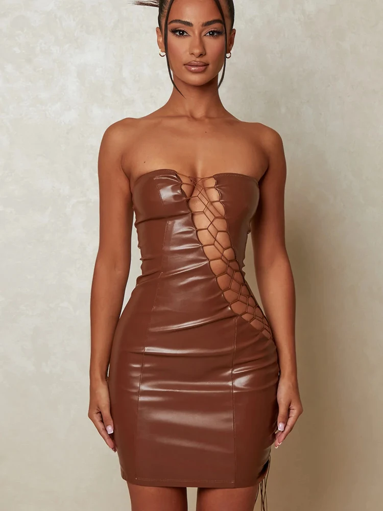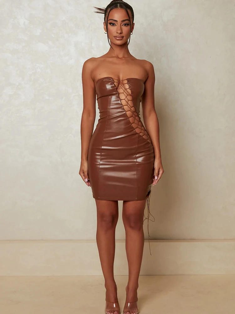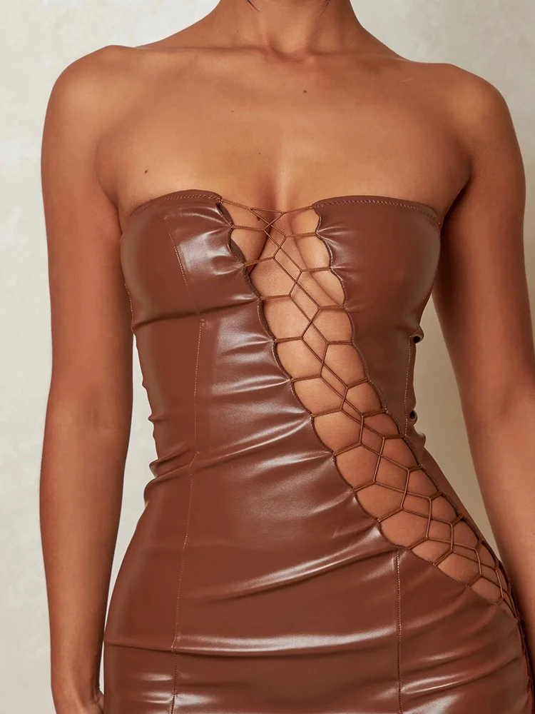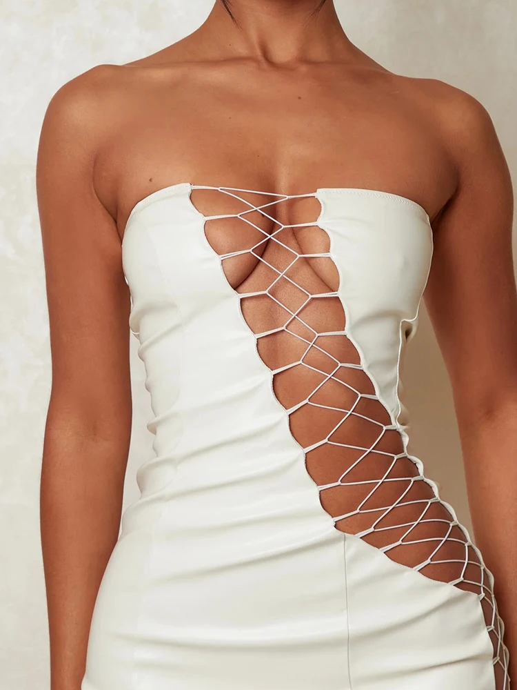 Yipinpay PU Hollow Sexy Sleeveless Dresses For Women 2023 Wrap Chest Lace Mini Skirt Nightclub Fashion Woman Party Tight Dress
