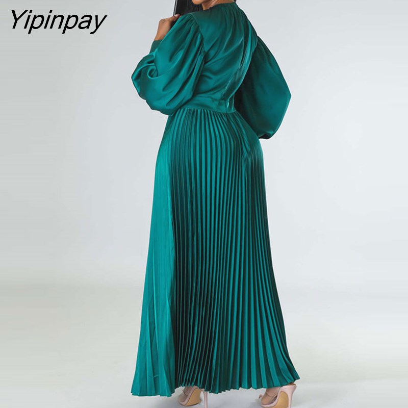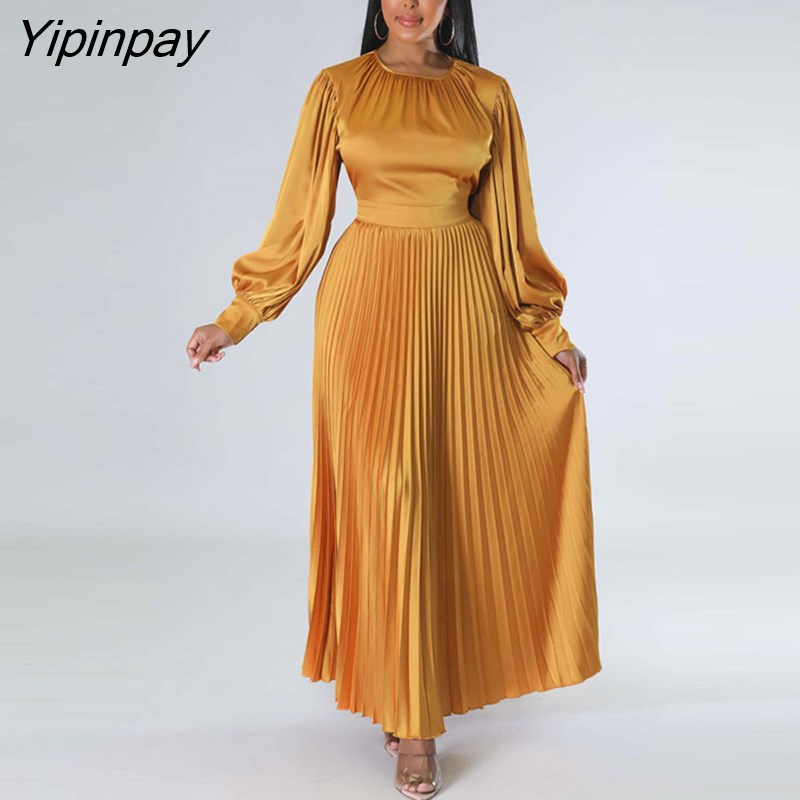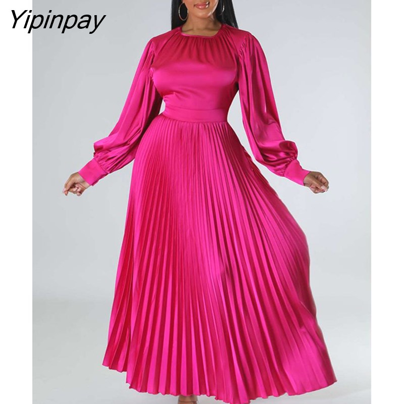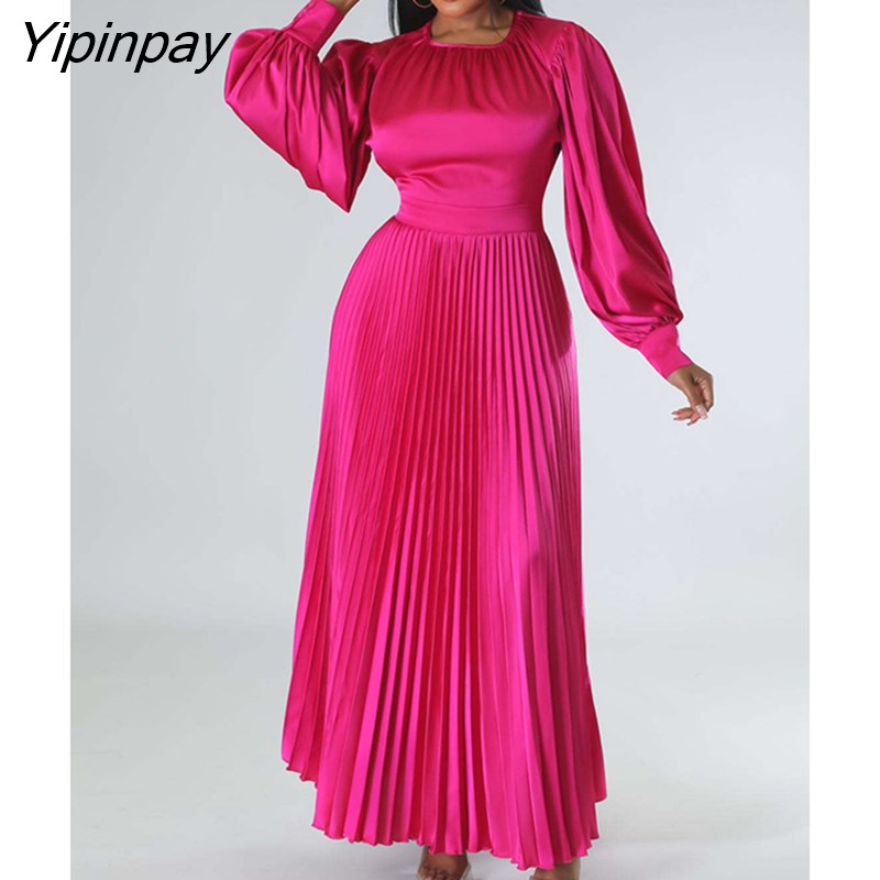 Yipinpay Satin Pleated Maxi Dress For Women Fashion O-neck Lantern Long Sleeve High Waist Lady Dress 2023 Summer Female Streetwear
