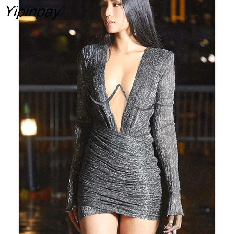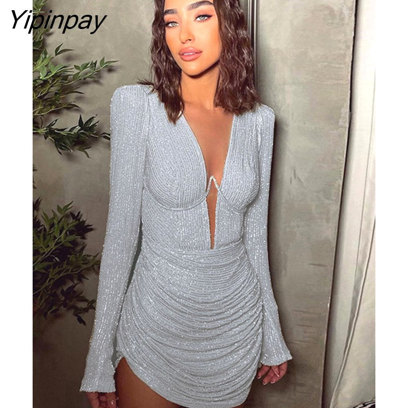 Yipinpay Sequin Pleats Shoulder Pads Women Dress Sexy Long Sleeve Low Cut Mini Dresses Ladies Autumn Evening Party Club Robe