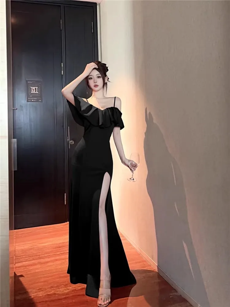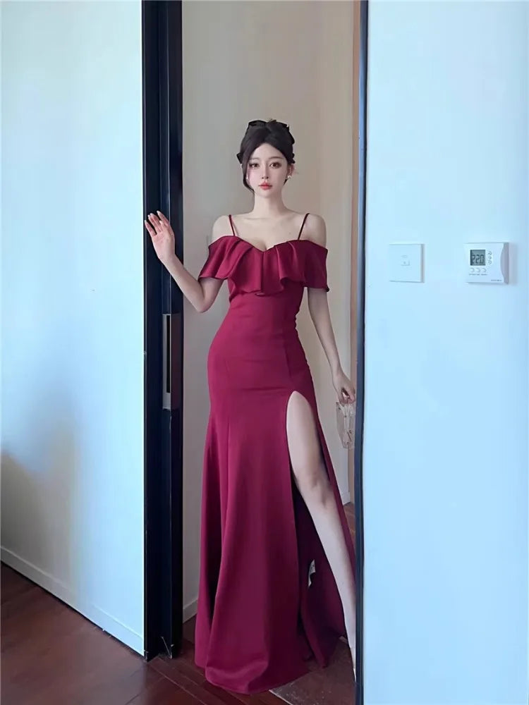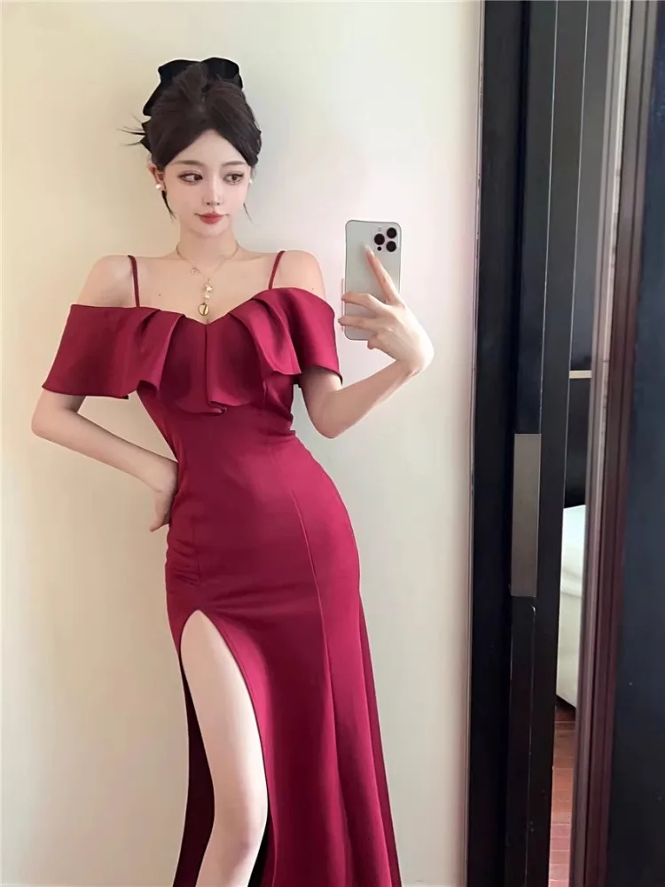 Yipinpay Sexy Dresses Women Elegant Ruffles Patchwork Slim Split Slash Neck Off Shoulder French Style Chic Party Dress Ladies
