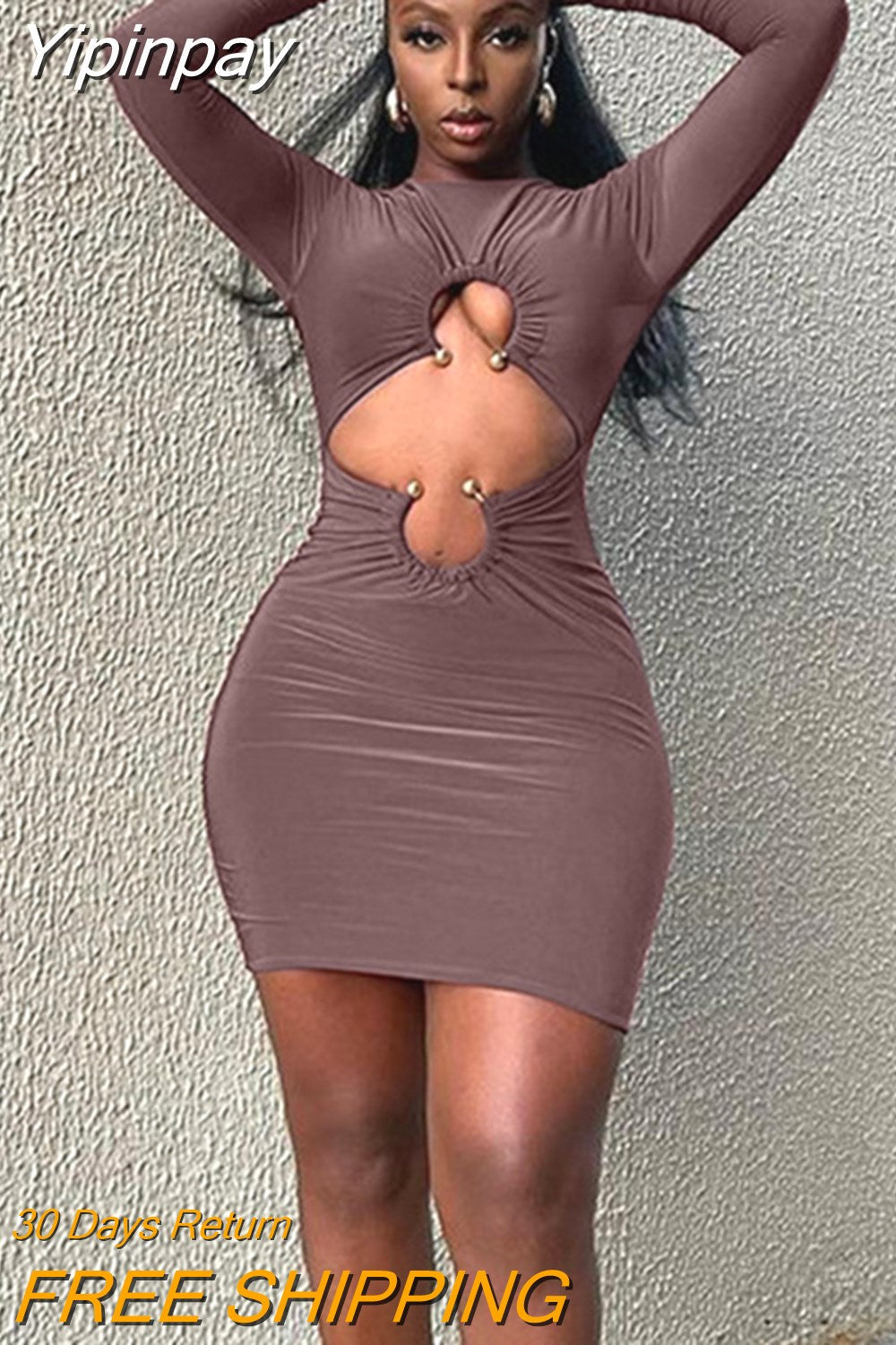 Yipinpay Sexy Hollow Y2k O-Neck Dress Metal Ring Solid Color Vestidos De Verano Mujer 2023 Banquet Party Elegant Mini Skirt Femme