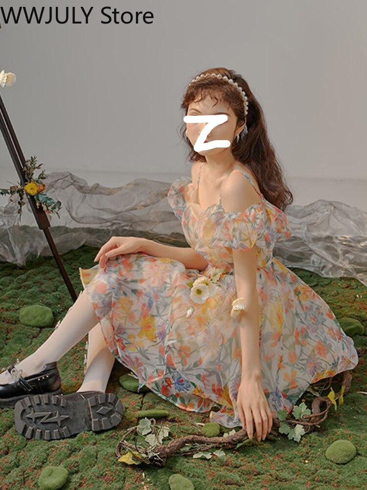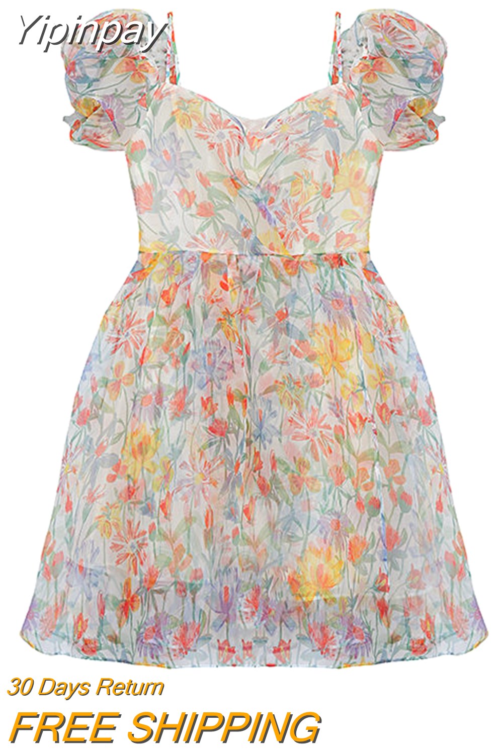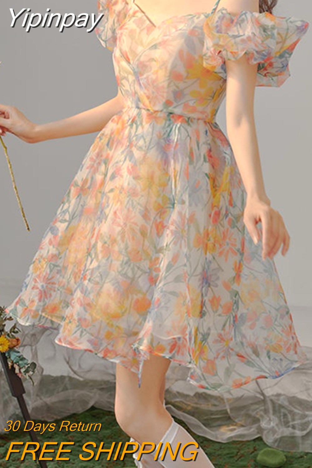 Yipinpay Sleeve One Piece Dress Korean Style Casual 2023 Summer Fairy Elegnat Floral Mini Dress Beach Sweet Short Sleeve Dress Woman
