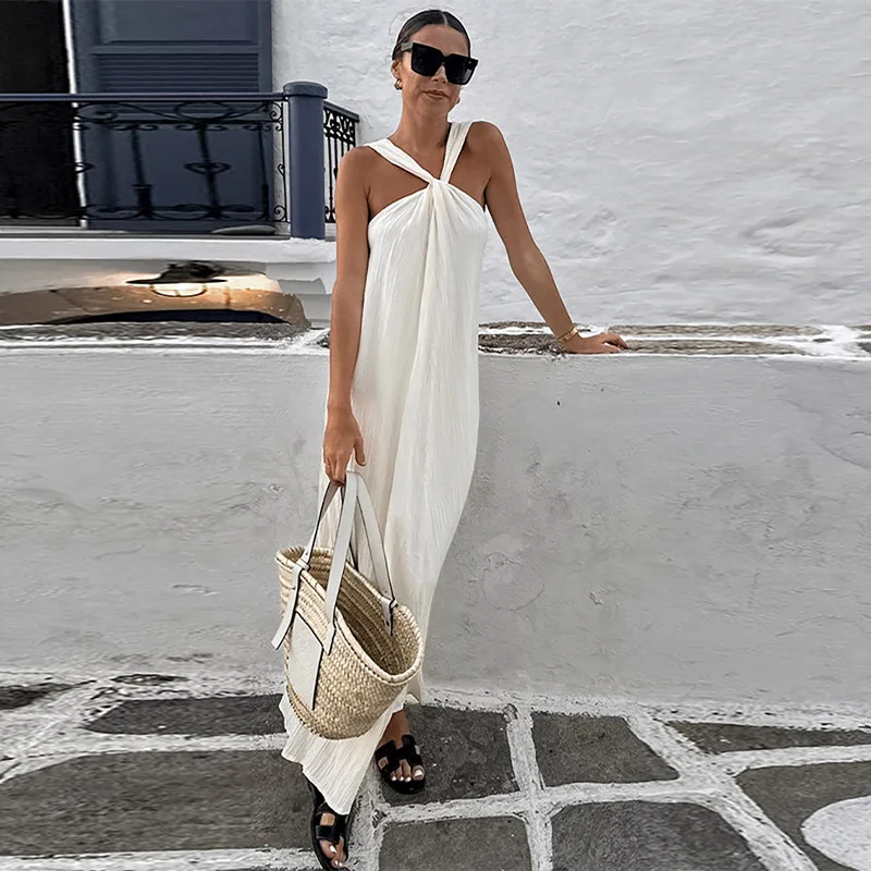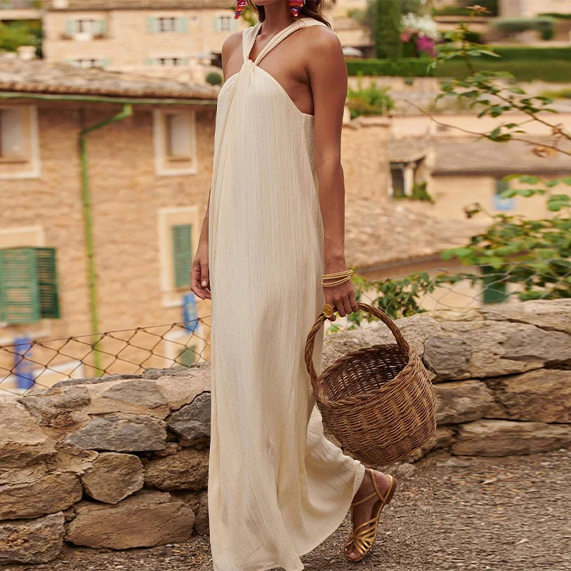 Yipinpay Soild Halter Maxi Dress For Women 2024 Summer Sleeveless Backless Long Dresses Fashion Lady Holiday Party Beach Robe