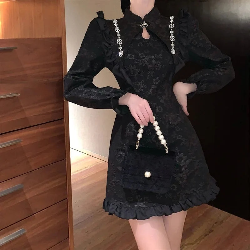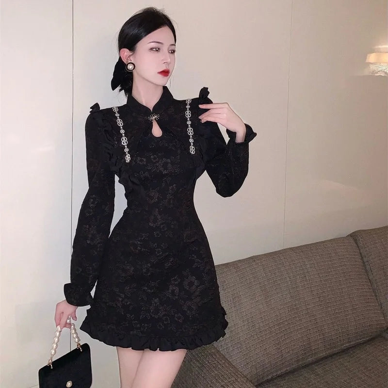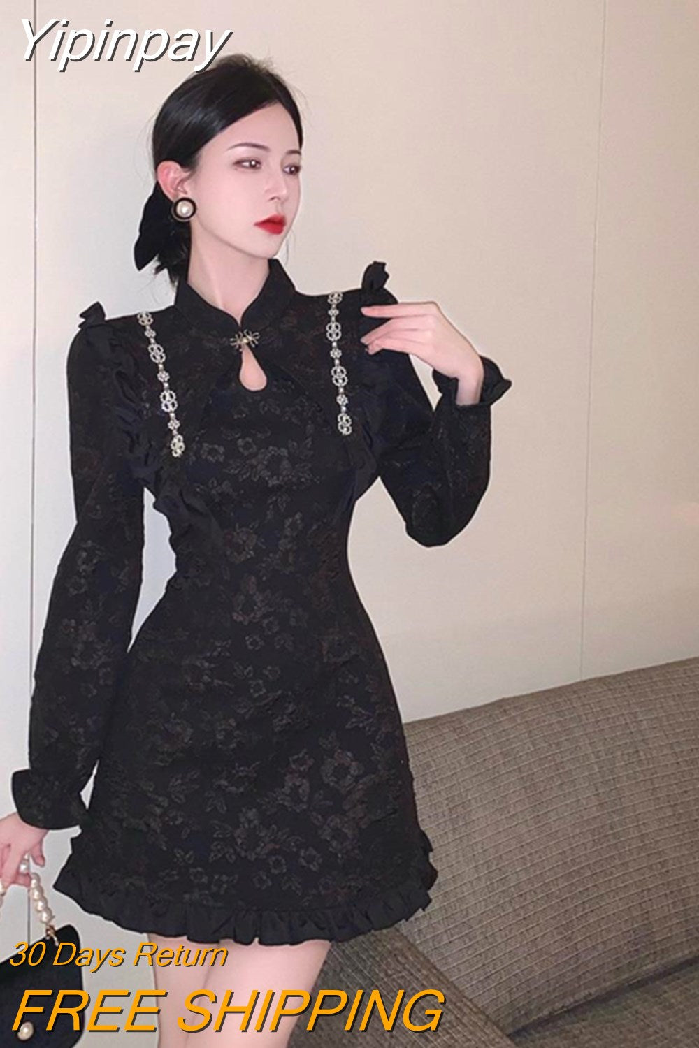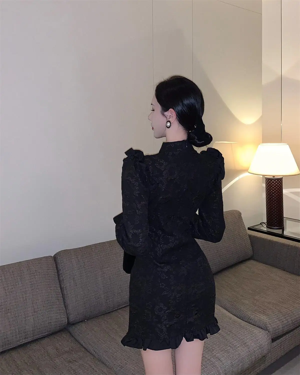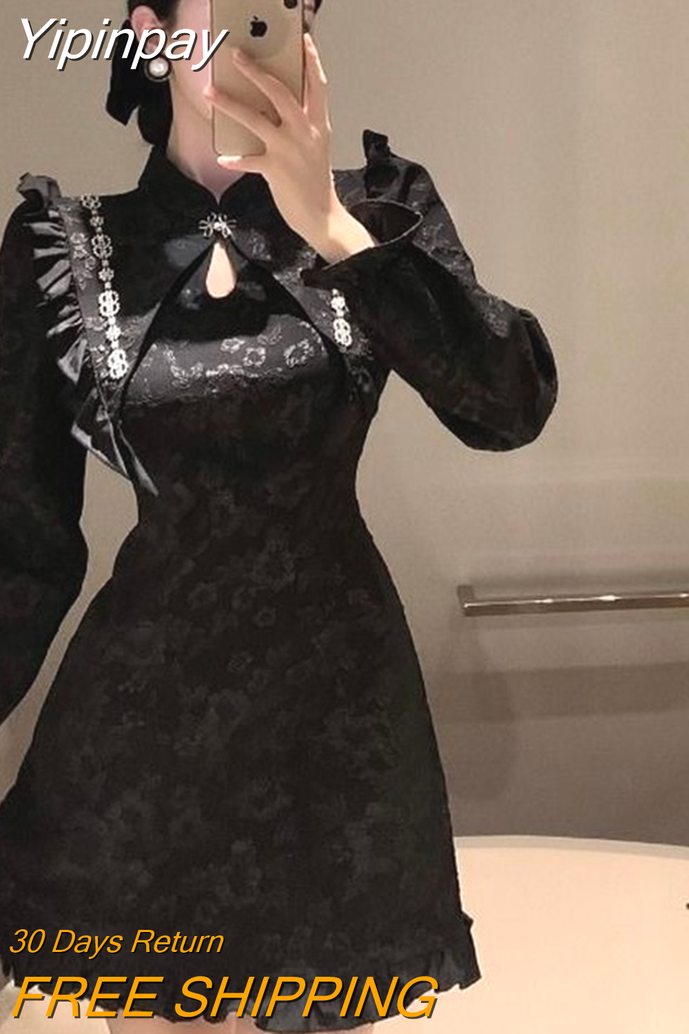 Yipinpay Style Retro Long Sleeve Black Jacquard Cheongsam Mermaid Dress Women Mini Vestido De Mujer Fashion Hollow Sexy Ruffle