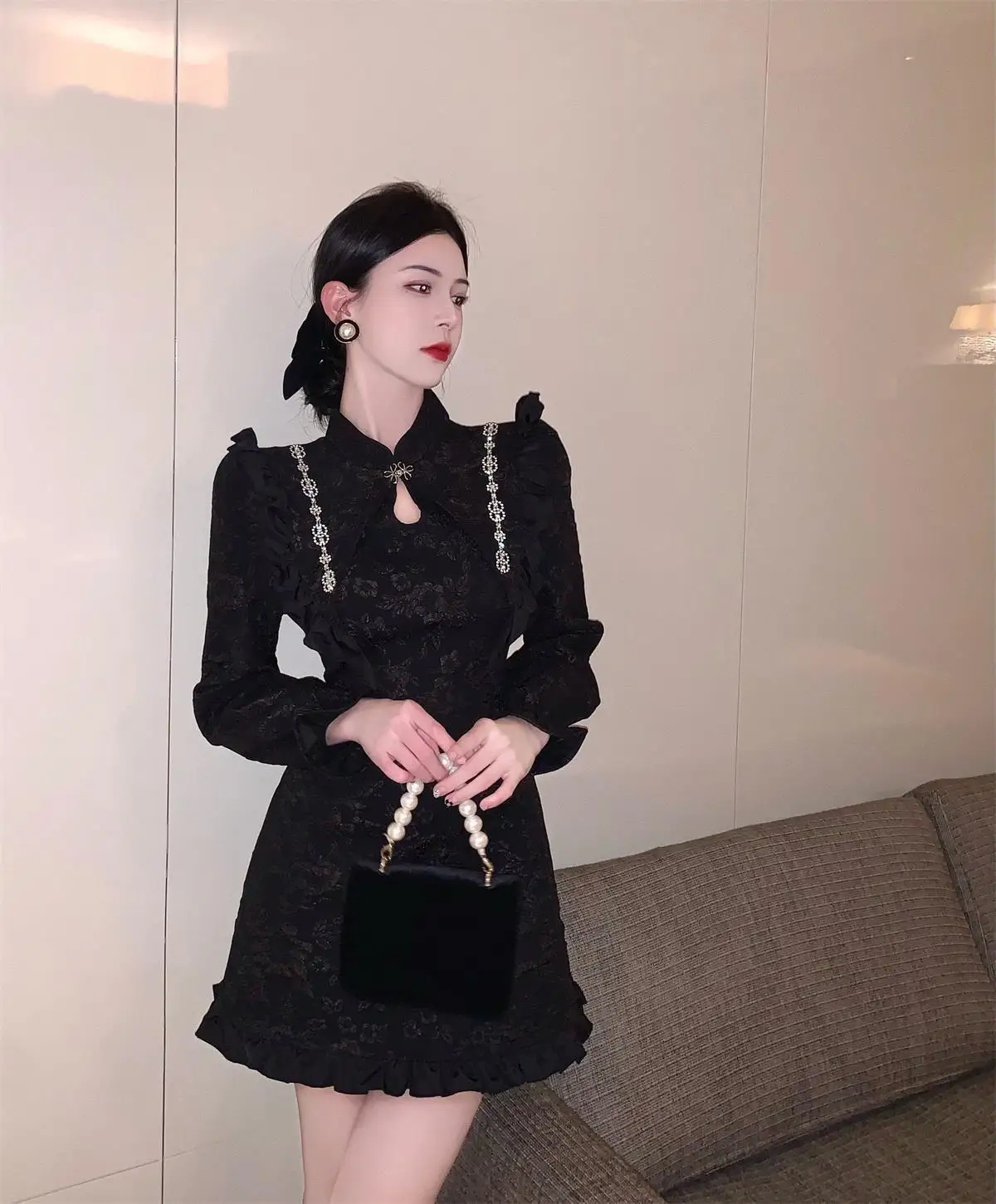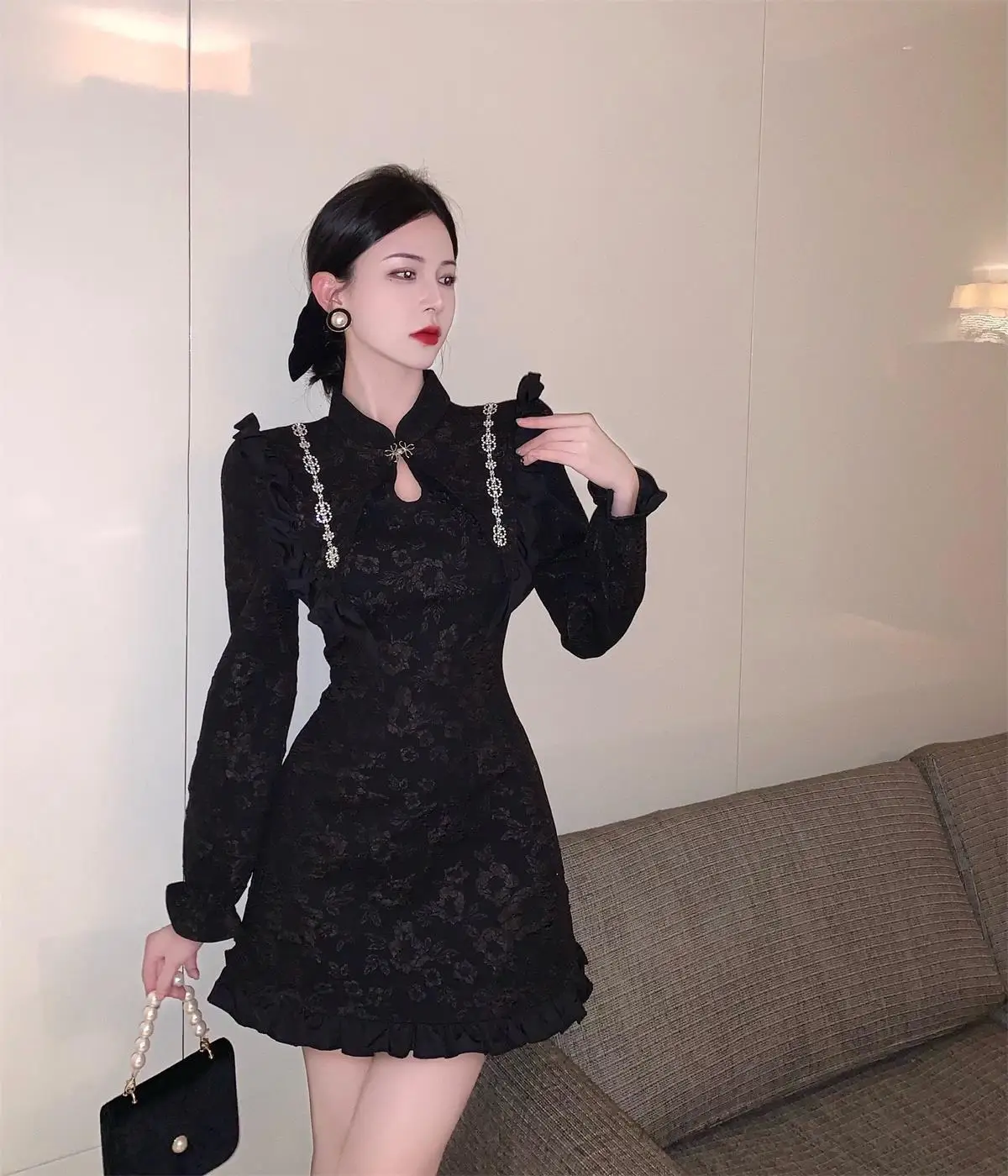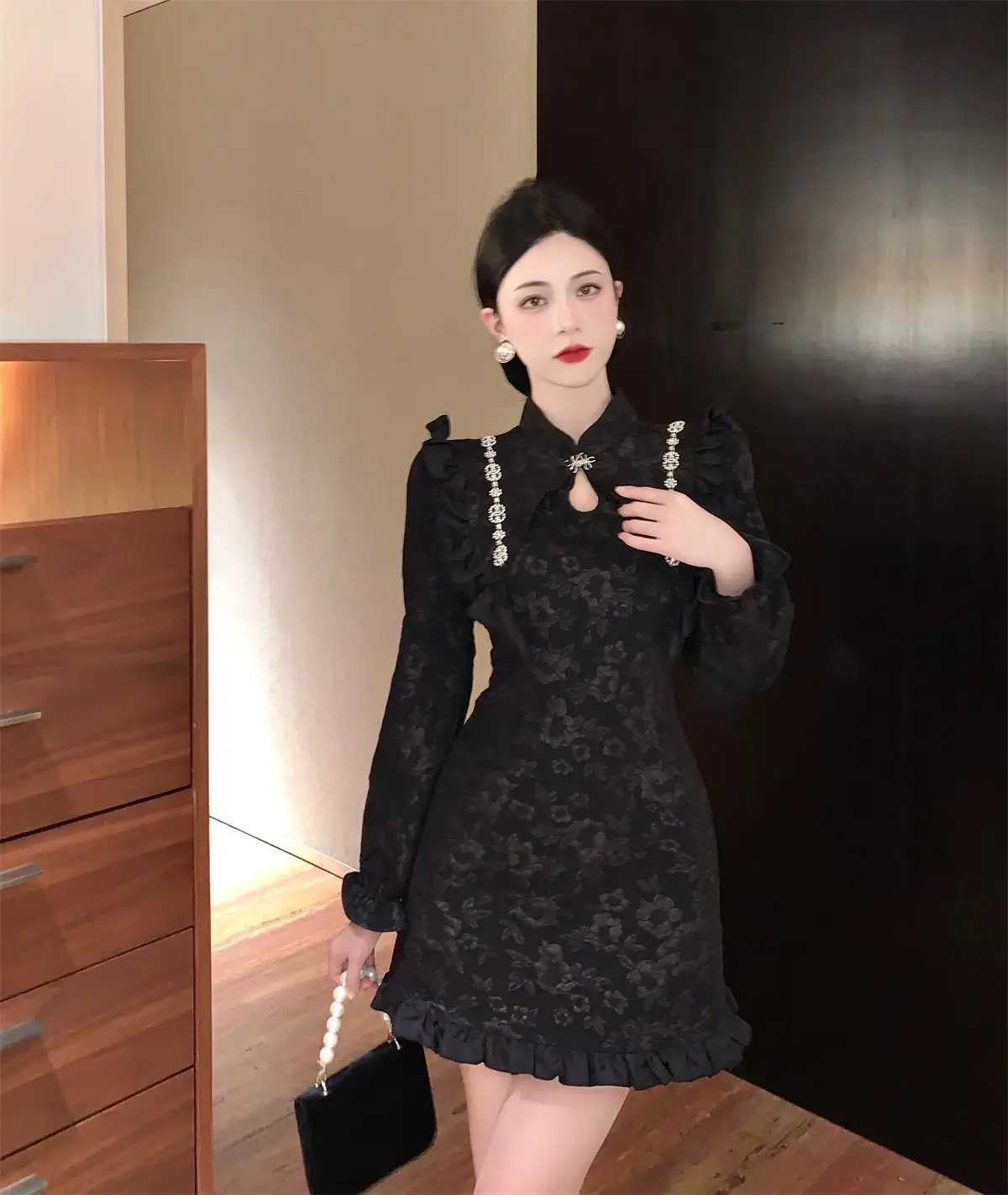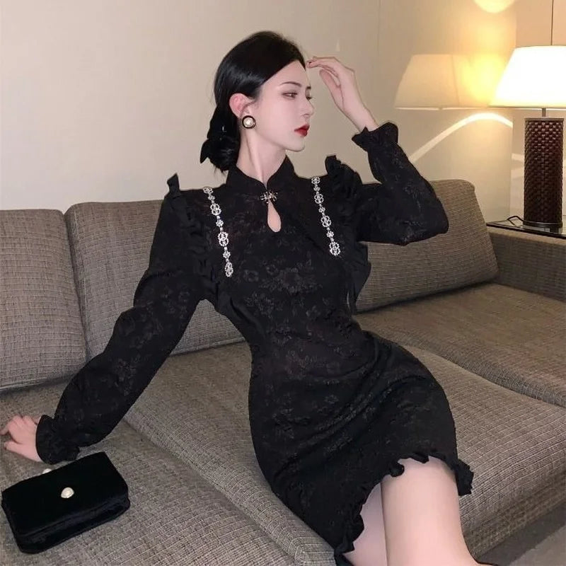 Yipinpay Style Retro Long Sleeve Black Jacquard Cheongsam Mermaid Dress Women Mini Vestido De Mujer Fashion Hollow Sexy Ruffle