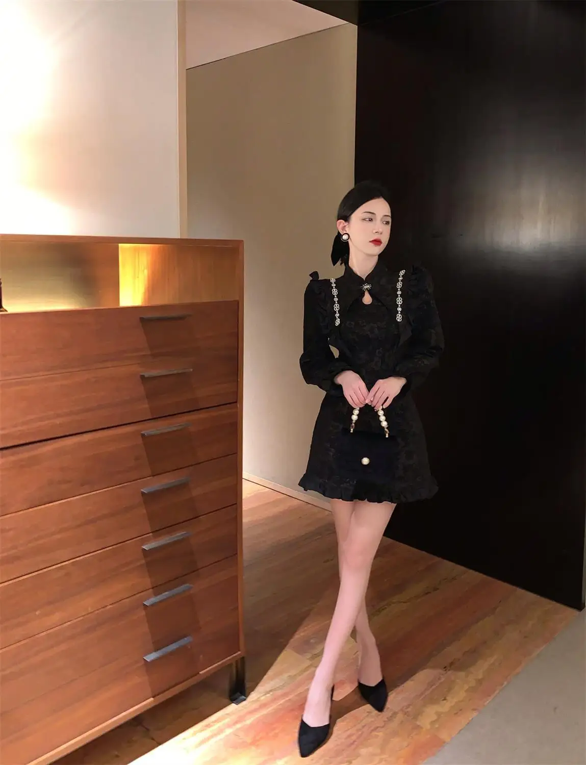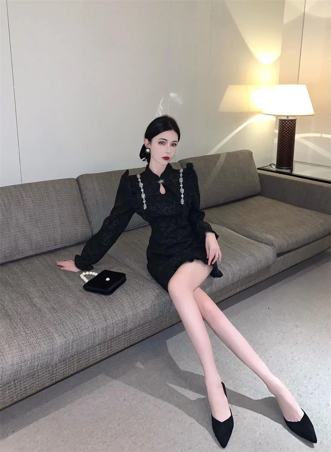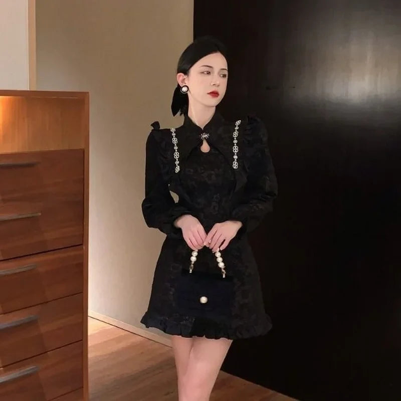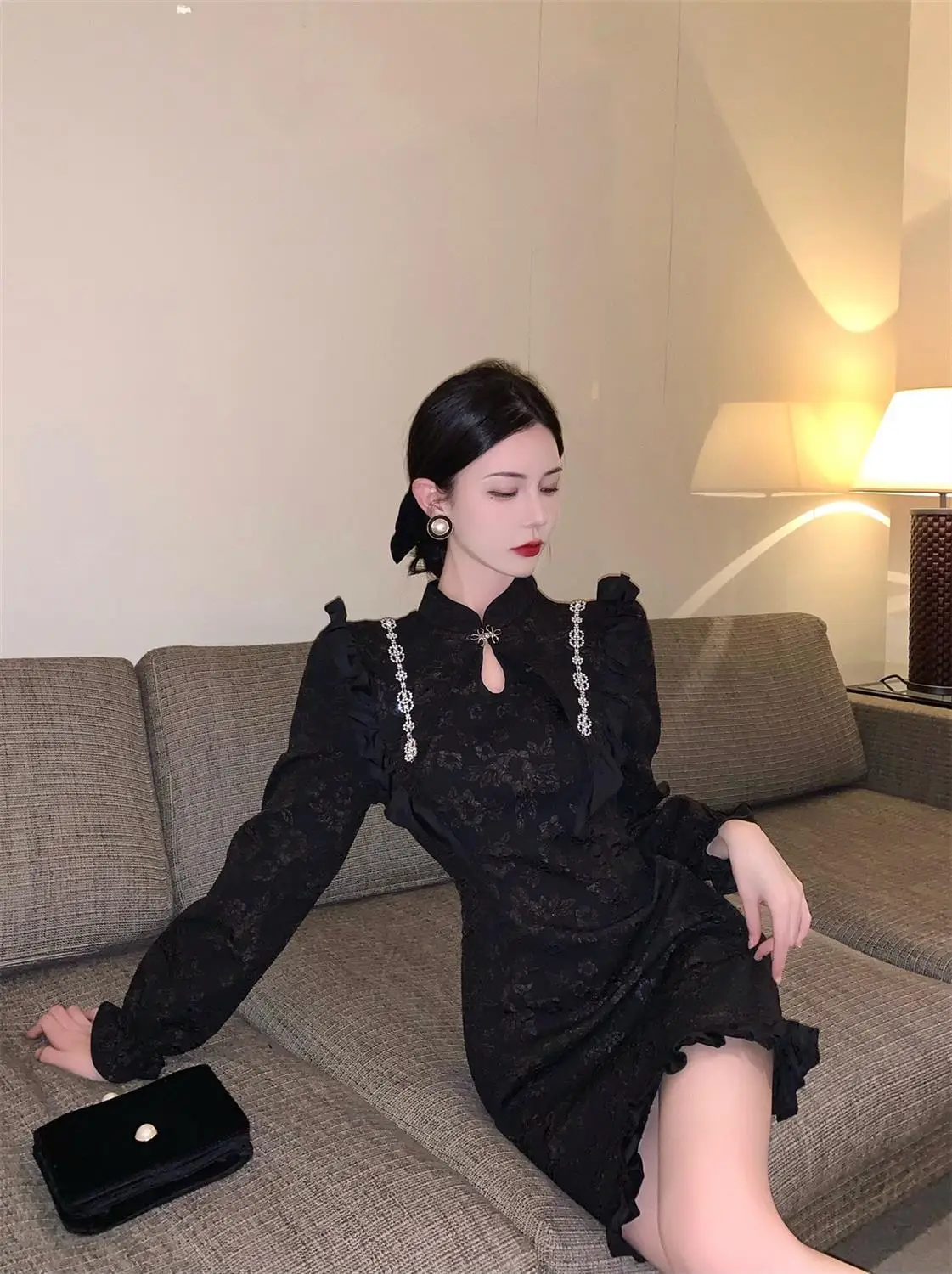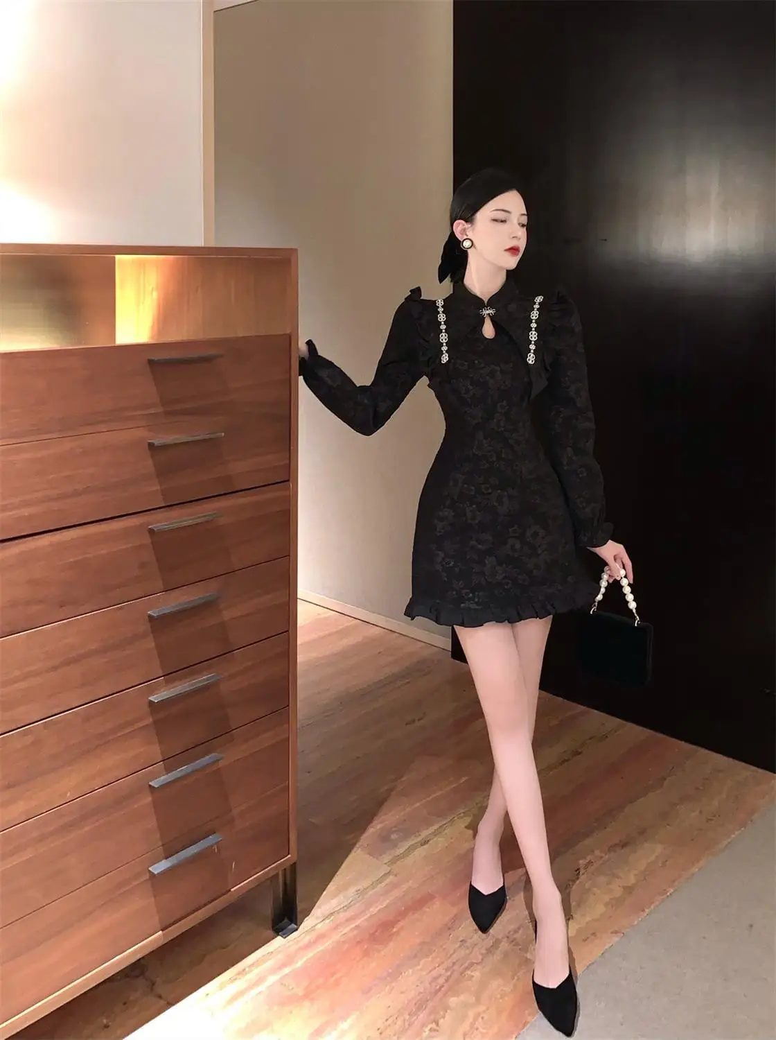 Yipinpay Style Retro Long Sleeve Black Jacquard Cheongsam Mermaid Dress Women Mini Vestido De Mujer Fashion Hollow Sexy Ruffle