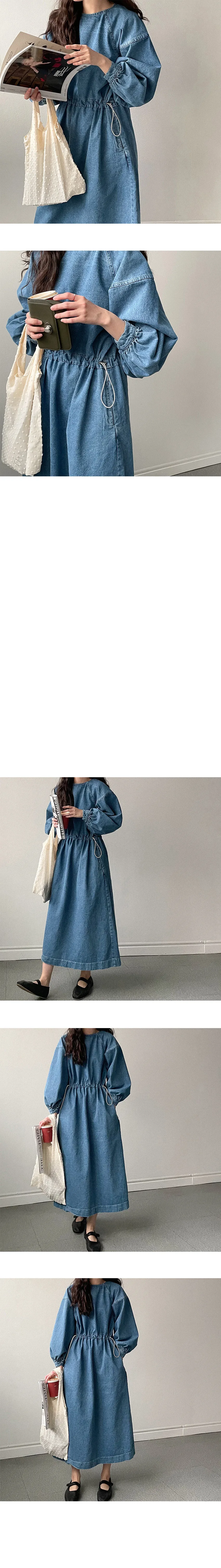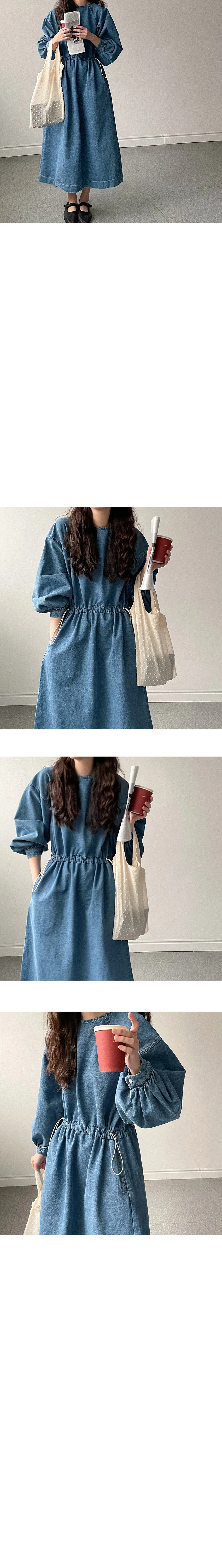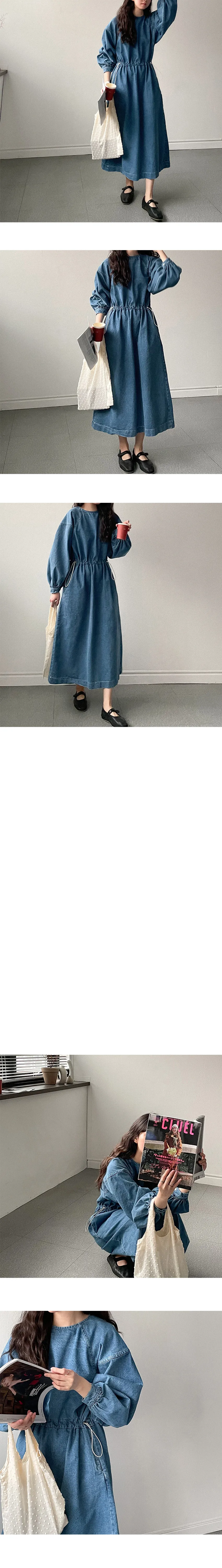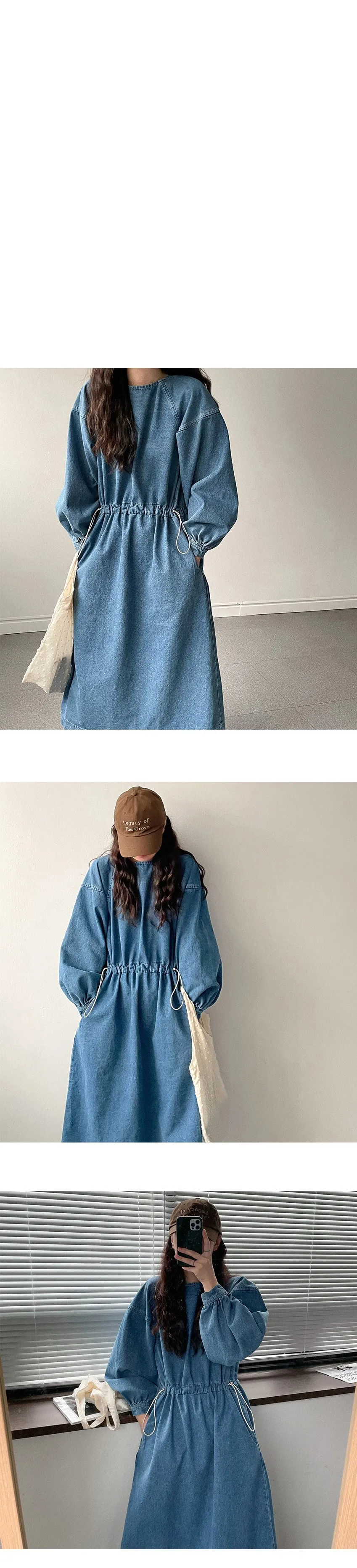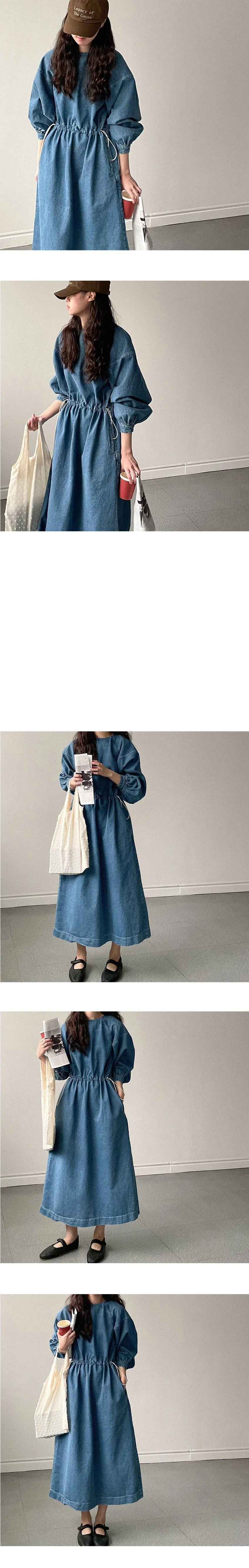 Yipinpay Style Washed Denim Dress Women Spring/Summer Retro O- Neck Long Sleeved Drawstring Lantern Sleeve Autumn Long Vestido