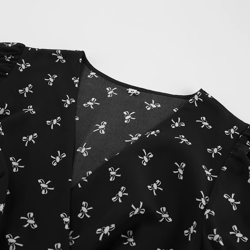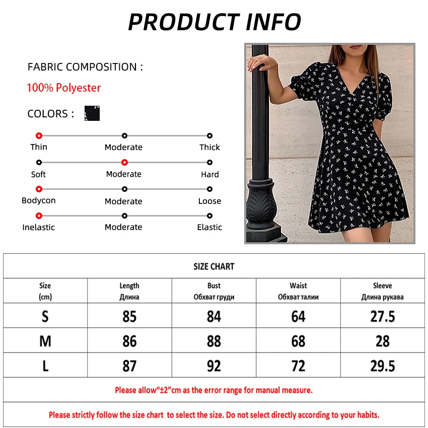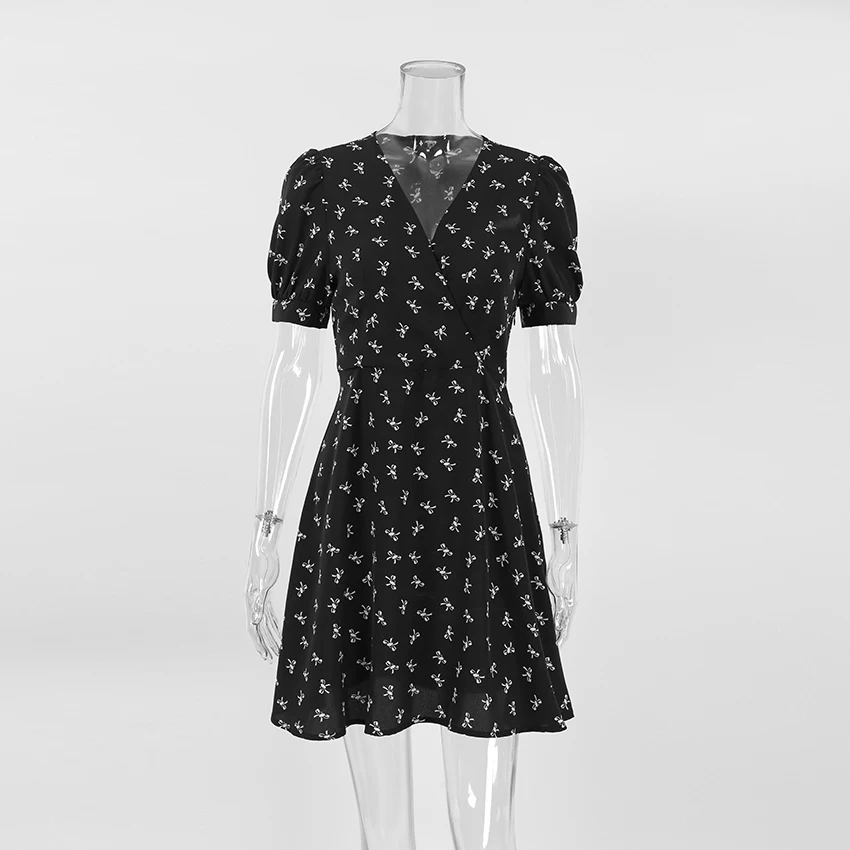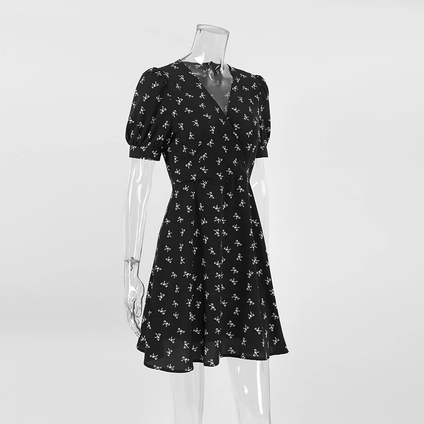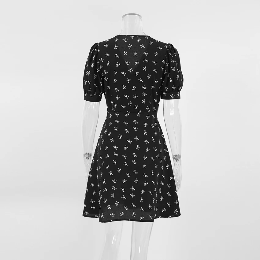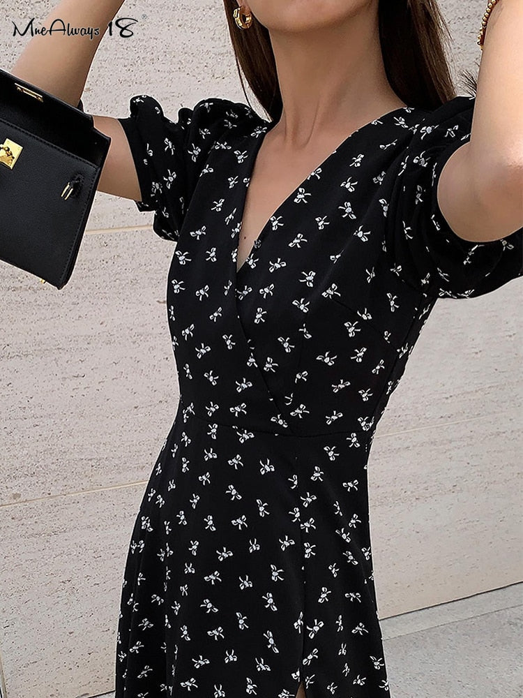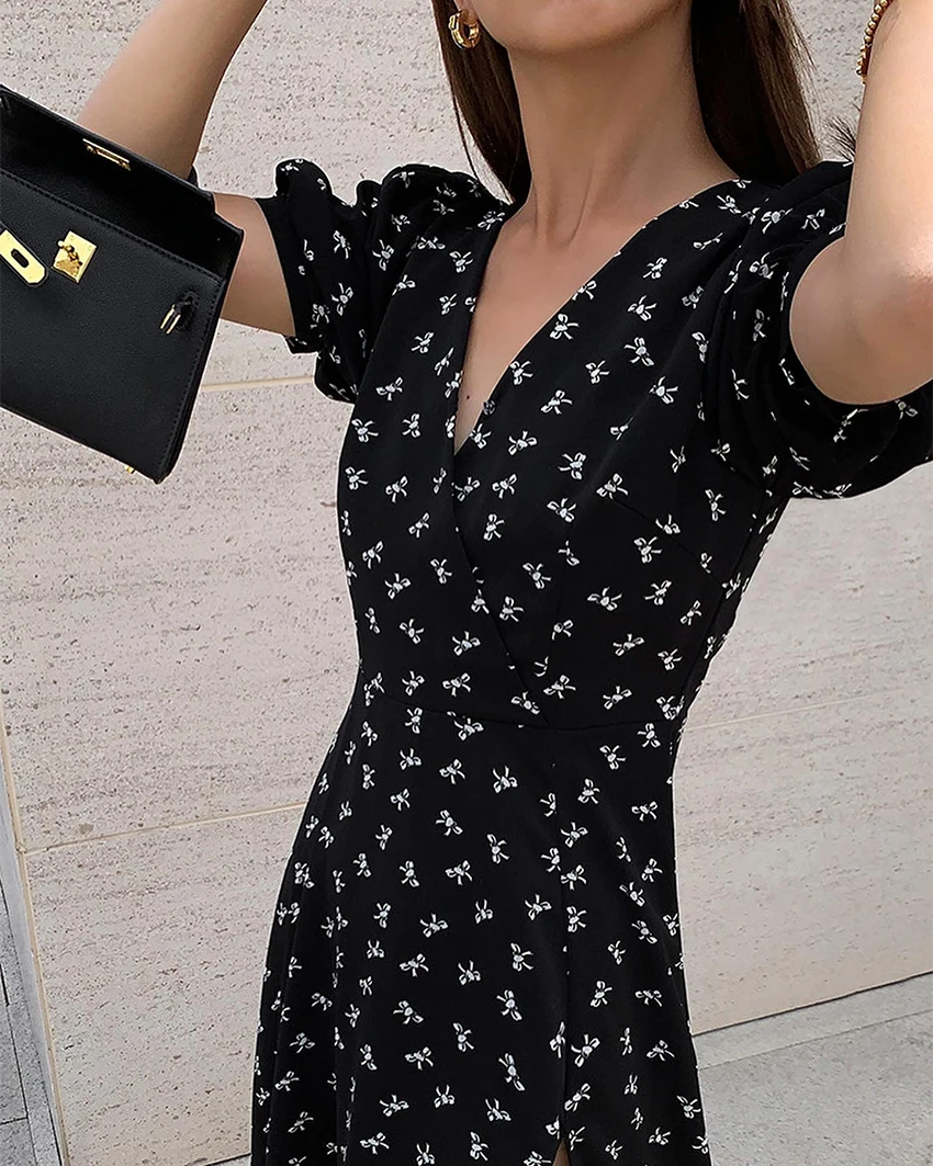 Yipinpay Summer Elegant V-Neck High Waist Print Dress Women Puff Sleeve Split Mini Dress Casual Office Lady Split Dress 2023