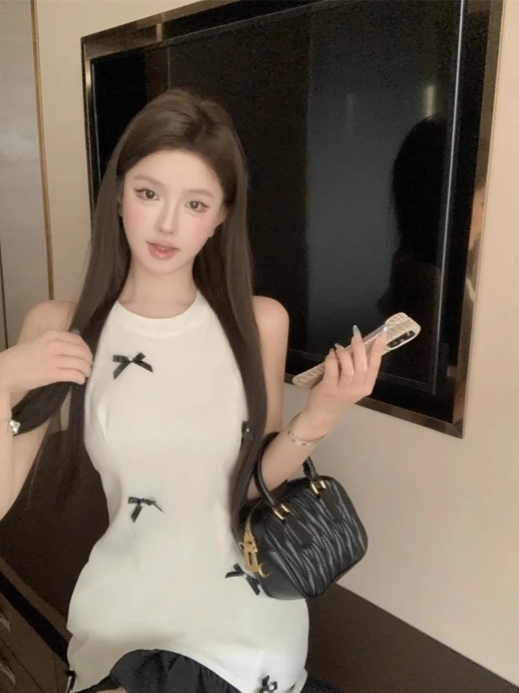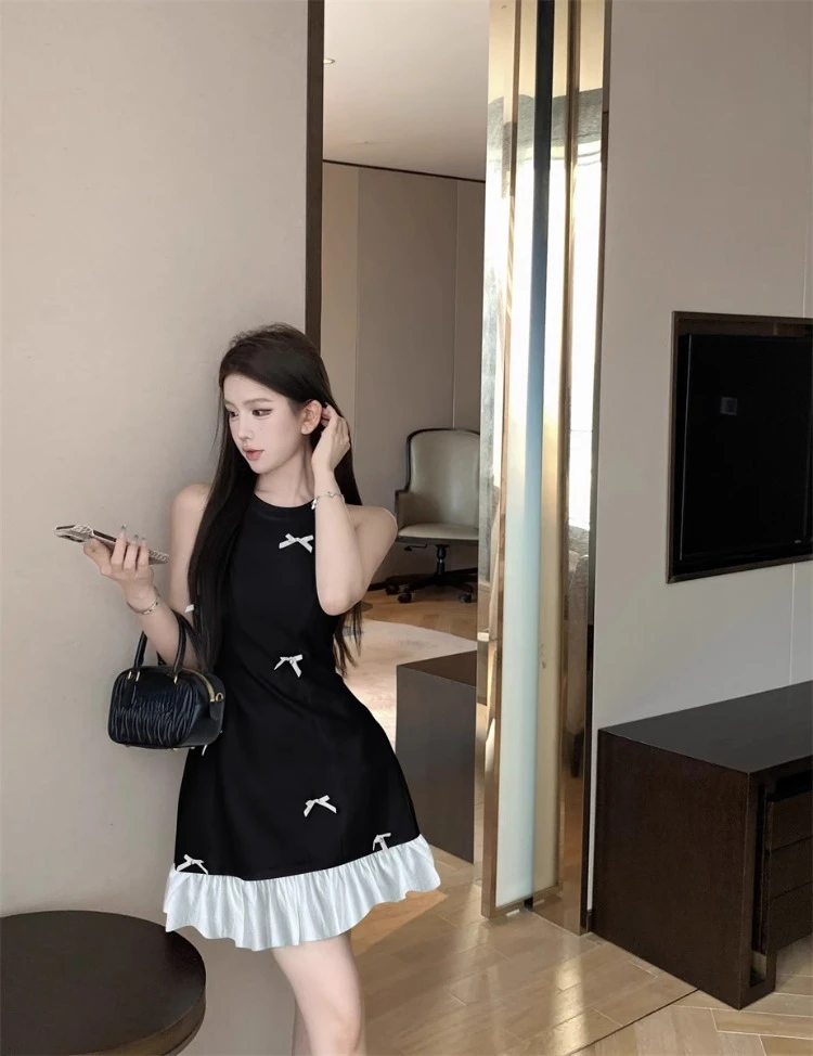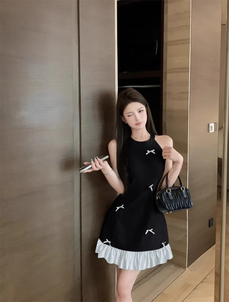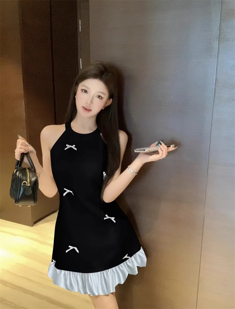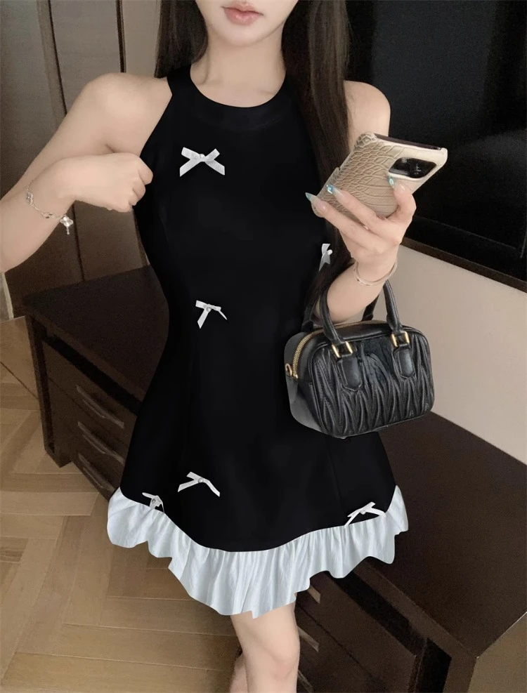 Yipinpay Vintage Dresses Women Bowknot Sleeveless Halter Ruffles Summer New Slim Elegant Mini Dress Party Chic Female Sweet